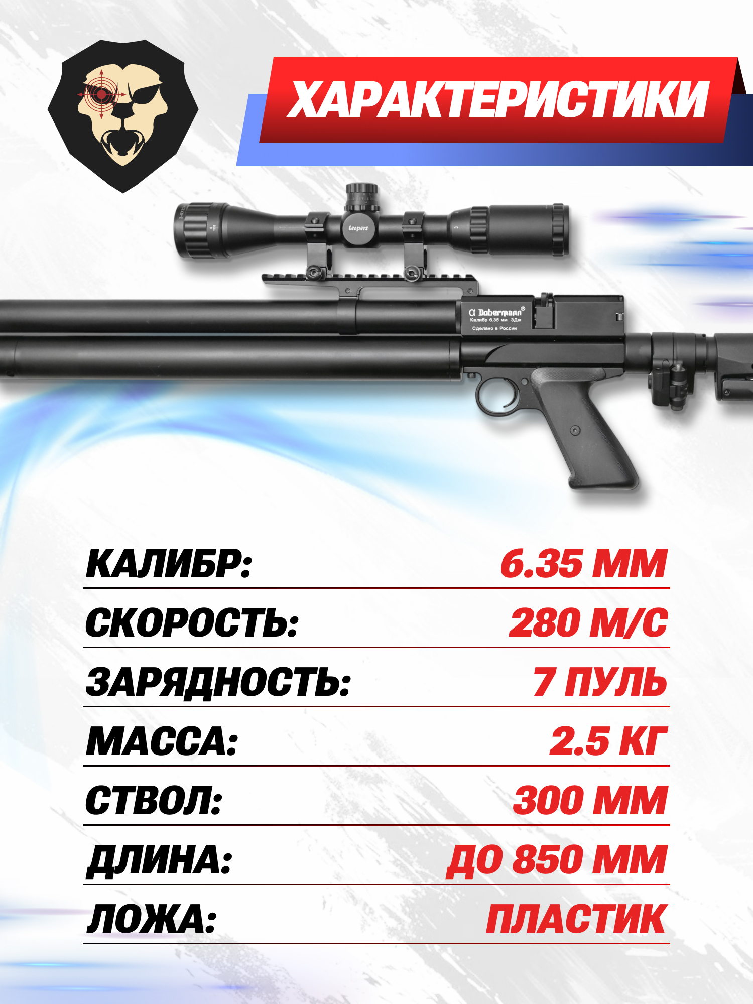 Доберман ПСП 6.35 миллиметра характеризуется увеличенными показателями мощности выстрела до 280 метров в секунду. Однако на российский рынок такая модель поставляется в ослабленном варианте, дульная энергия которой не превышает порогового значения в три Джоуля. Благодаря этому винтовка имеет свободный характер приобретения, и пользователь может купить ее без какой-либо лицензии.