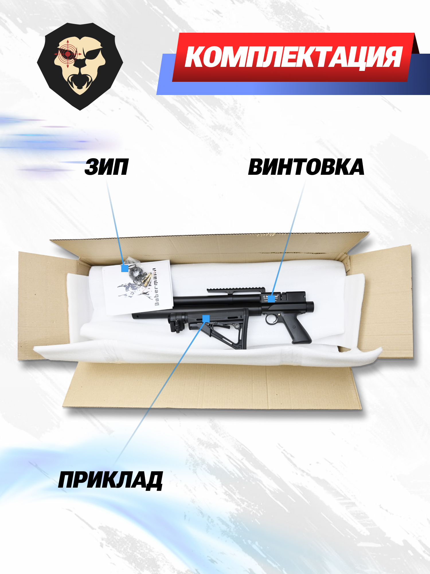 Безопасность при обращении с пневматикой Dobermann обеспечивается интегрированным предохранителем. В определенном положении он блокирует спусковой механизм, что на порядок снижает вероятность получения нежелательных травм пользователем и находящимися вокруг людьми.