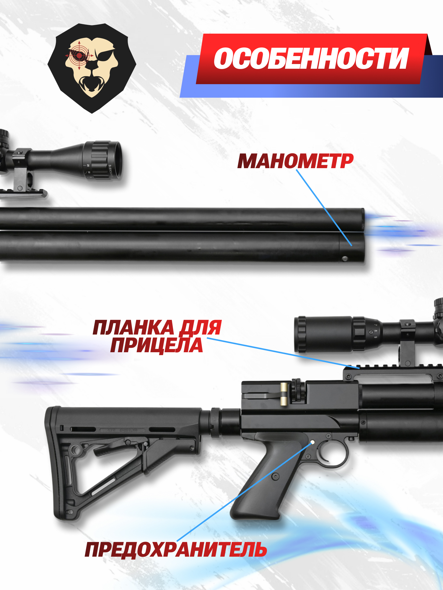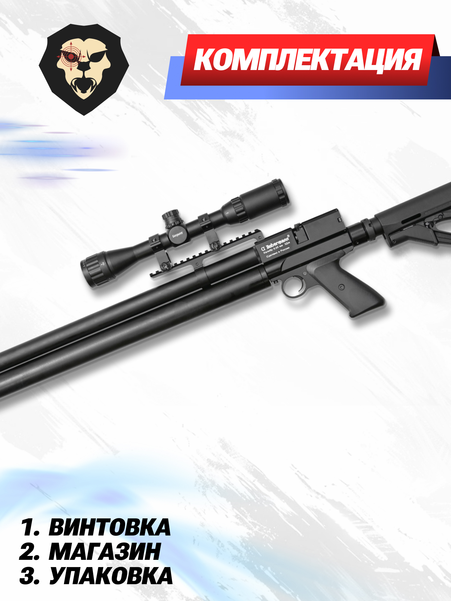 | Комплектация | Винтовка, магазин, ключ для манометра, набор запасных РТИ, упаковка, заправочный штуцер, краткая документация, копия сертификата (по запросу покупателя) |