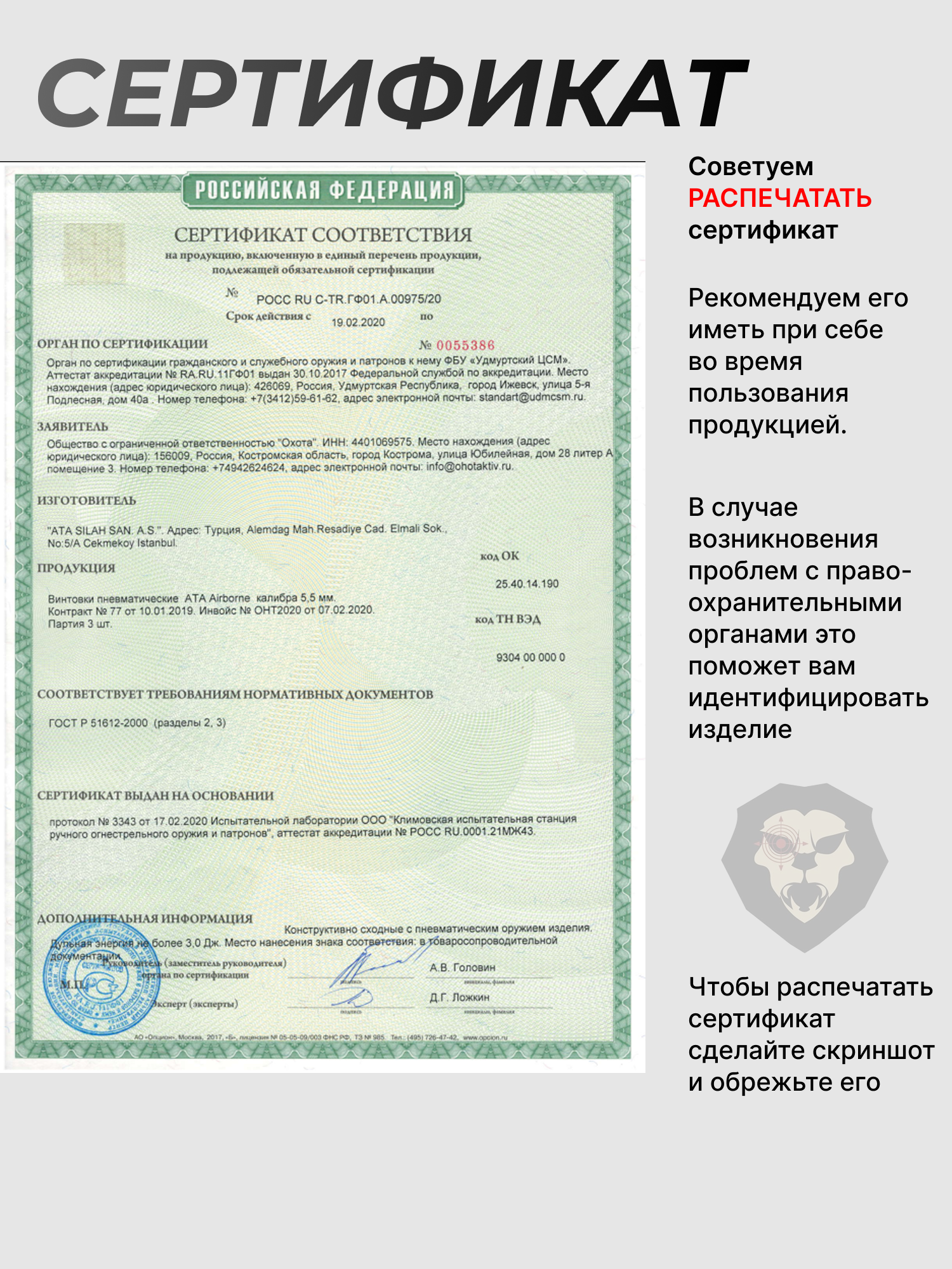 Винтовка Ata Arms Airborne выпускает метаемый снаряд со скоростью 280 метров в секунду согласно заявленным заводским характеристикам. Однако экземпляры для российского рынка подвергаются процедуре настройки мощности до 3 Дж. Таким образом, для приобретения «воздушки» не понадобится лицензия.