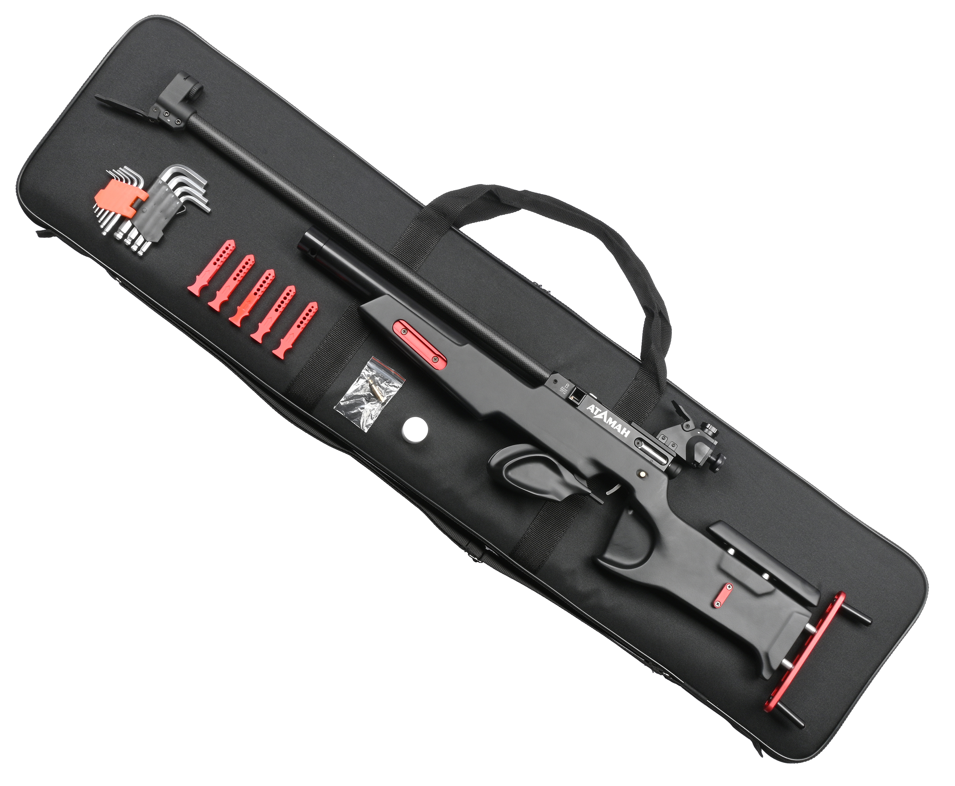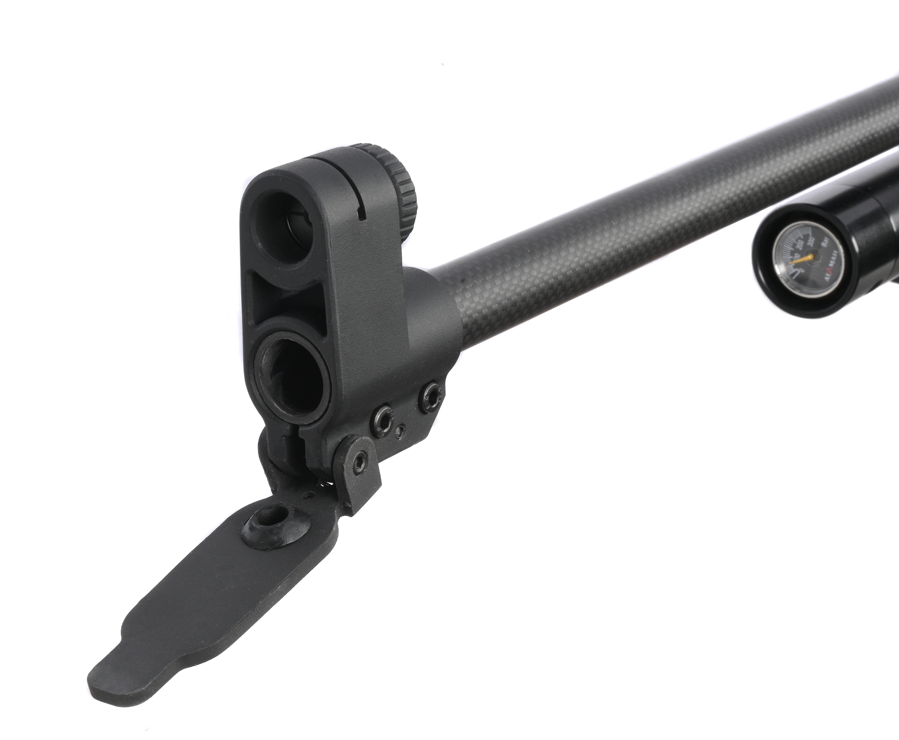 Чтобы разогнать заряд по каналу ствола, затрачивается воздух, который заблаговременно закачивается внутрь встроенного ресивера. Заявленный объем резервуара - 135 кубических сантиметров. Для заправки рекомендуется применять специализированное насосное оборудование ВД, а максимальное допустимое рабочее давление составляет 300 Бар - контроль осуществляется интегрированным манометром.