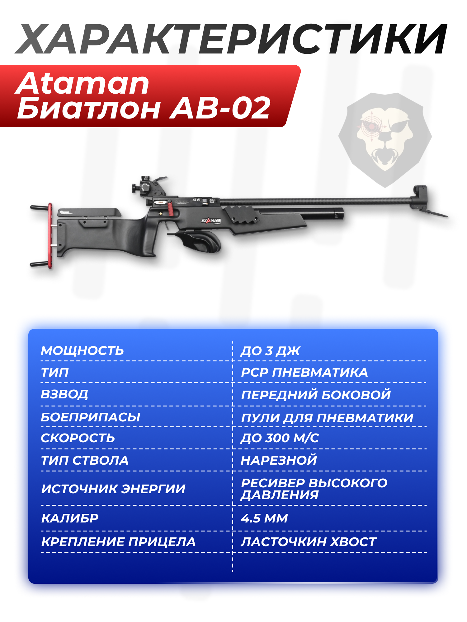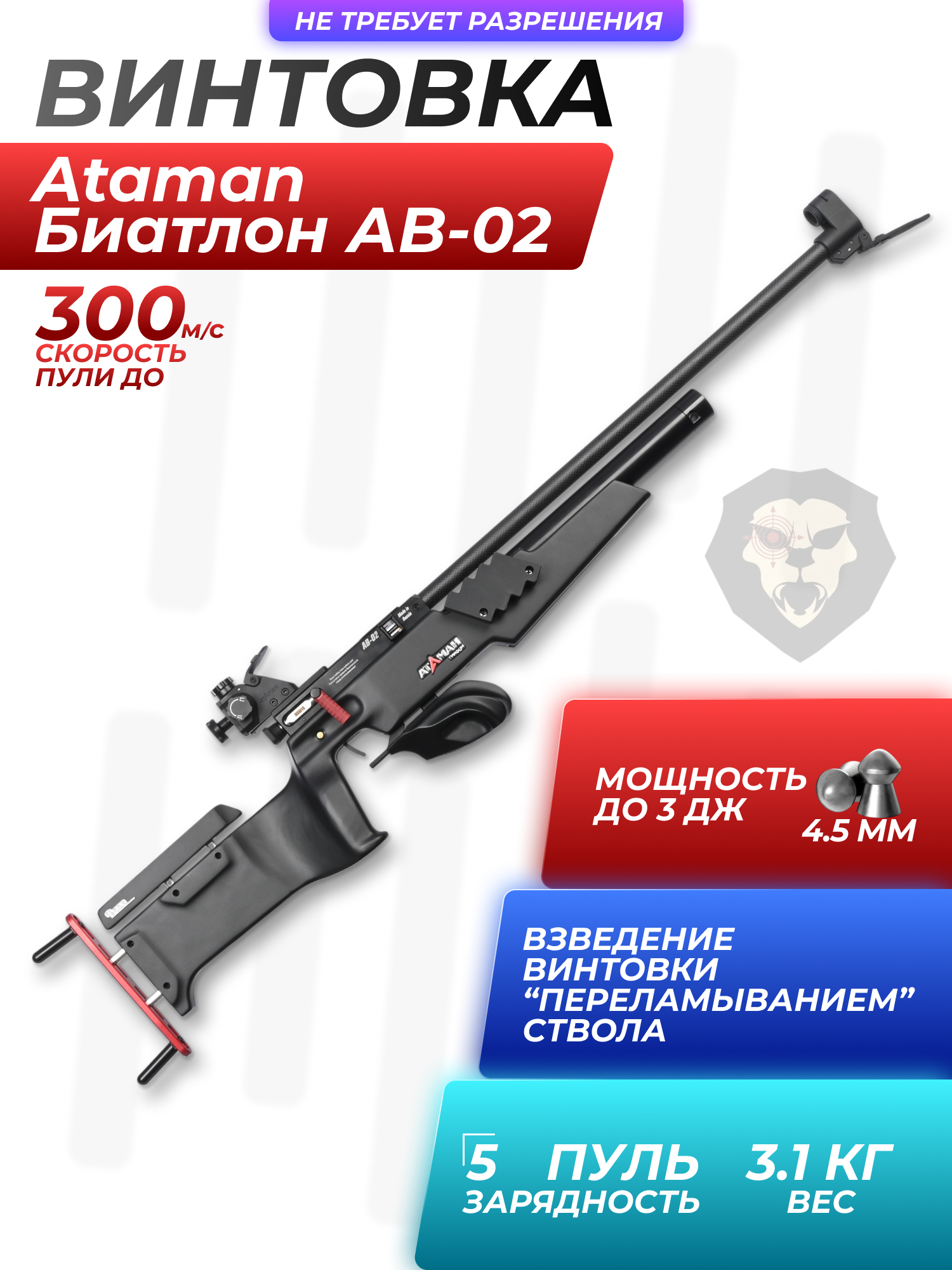 Артикул производителя Пневматическая винтовка Ataman Биатлон АВ-02 4.5 мм (Черный) по низкой цене 160000 руб. Модель со штрихкодом производителя Вы можете оплатить наложенным платежем с доставкой или в отделении транспортной компании (ПЭК, СДЭК, Boxberry). Ваш заказ со штрихкодом 2000000174228 забрать на почте с оплатой при получении в любой части Российской Федерации.