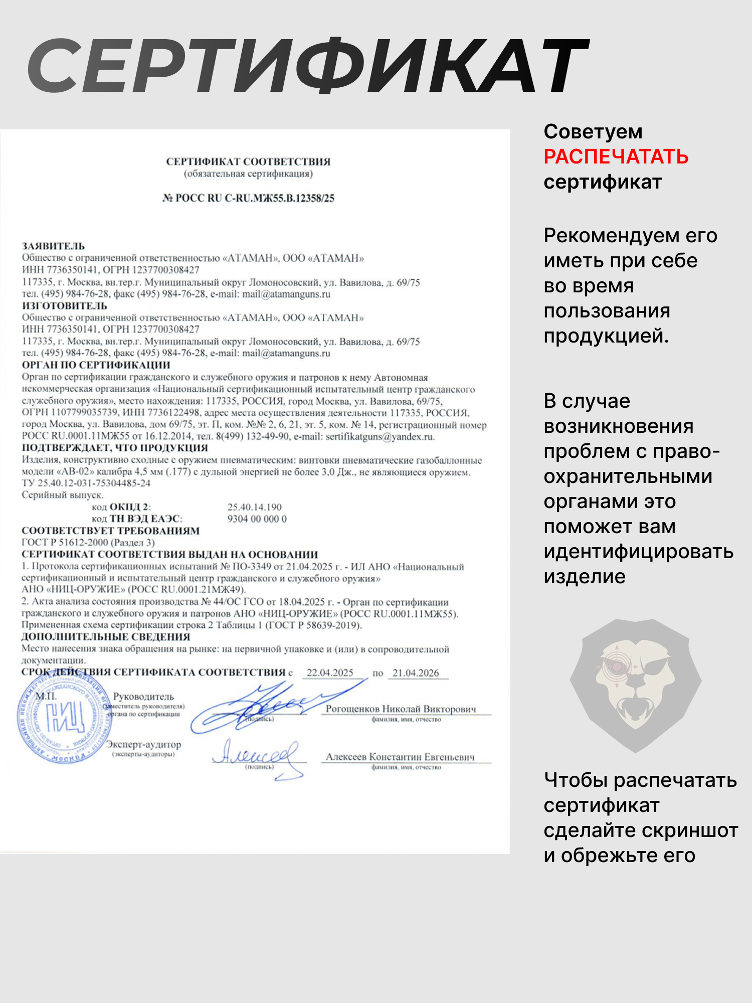 Информация о товаре "Пневматическая винтовка Ataman Биатлон АВ-02 4.5 мм (Черный)" носит ознакомительный характер, и не является публичной офертой, определяемой положениями Статьи 437 Гражданского кодекса Российской Федерации, характеристики, внешний вид, цвет и комплектация могут быть изменены производителем без уведомления.