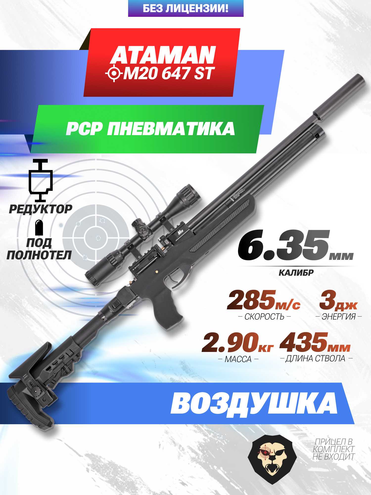 Информация о товаре "Пневматическая винтовка Ataman M20 647 ST 6.35 мм (черный, редуктор, полнотел)" носит ознакомительный характер, и не является публичной офертой, определяемой положениями Статьи 437 Гражданского кодекса Российской Федерации, характеристики, внешний вид, цвет и комплектация могут быть изменены производителем без уведомления.