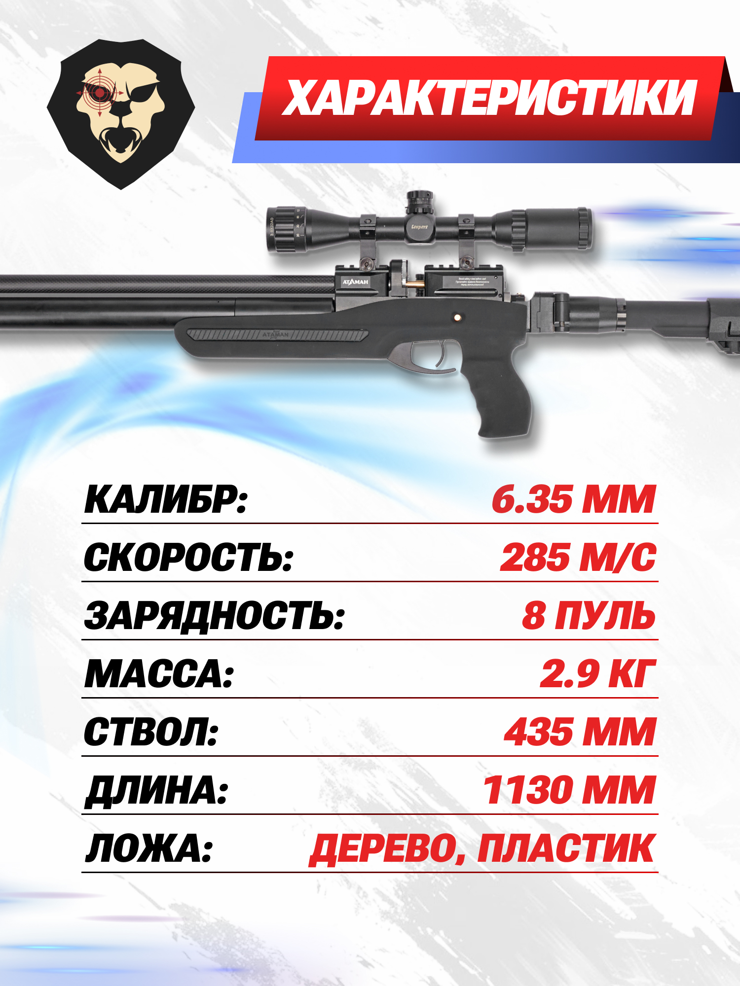 В основе конструкции обозреваемой пневматики применяется нарезной 435-миллиметровый бланк калибра 6.35 миллиметров. Роль боеприпасов для стрельбы из винтовки выполняют свинцовые полнотелые снаряды, использование которых возможно за счет показателей мощности выстрела, способных приводить в движение тяжелые пули.