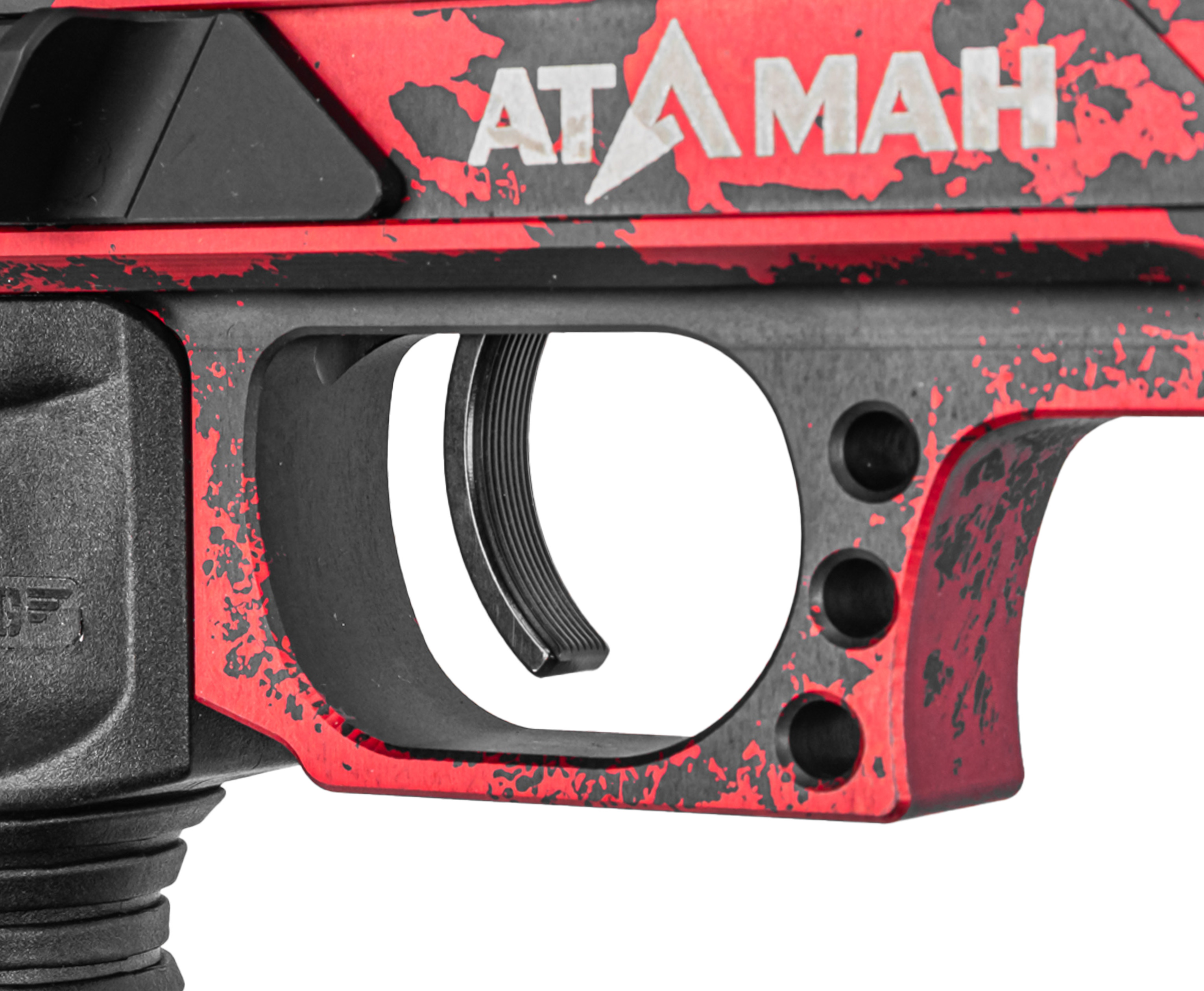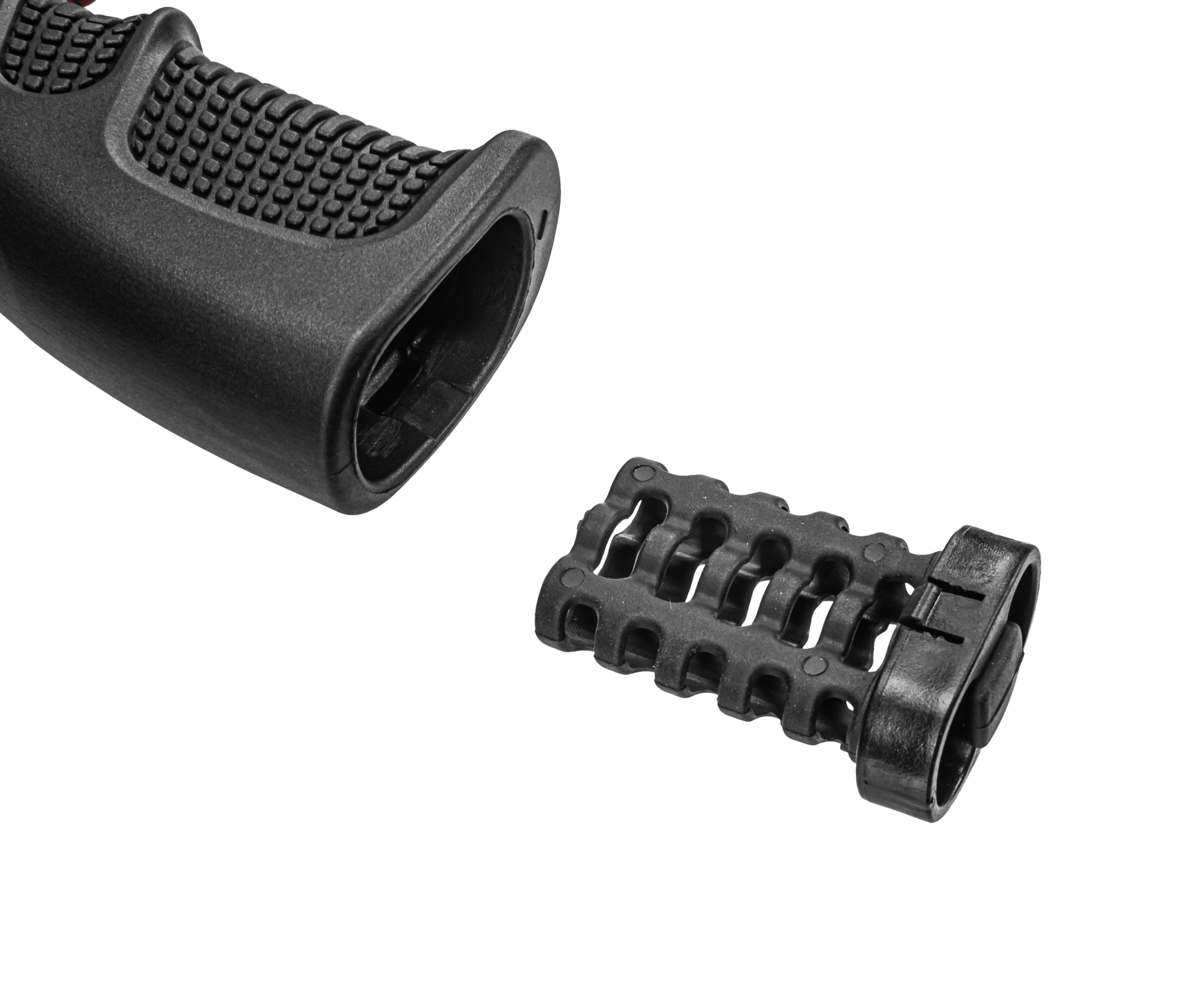 Удобству удержания способствует накладка из ламината на цевье, подобранная в красно-черный цвет ложи. В свою очередь усовершенствованная платформа позволила использовать пистолетные рукояти, совместимые с AR-15, что отрывает больший простор кастомизации. Над скобой предусмотрен упор под большой палец с функцией настройки для плотного и комфортного хвата.