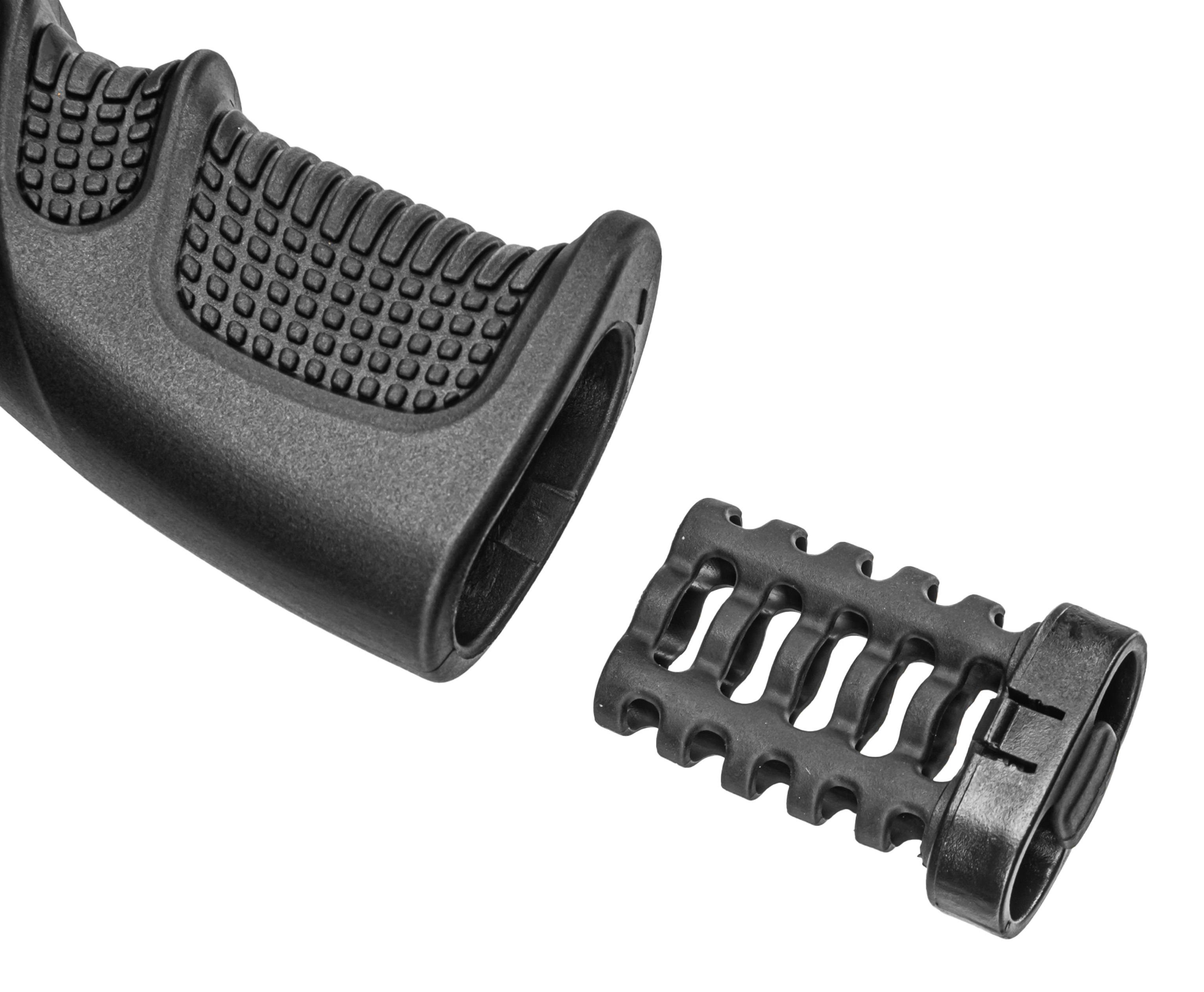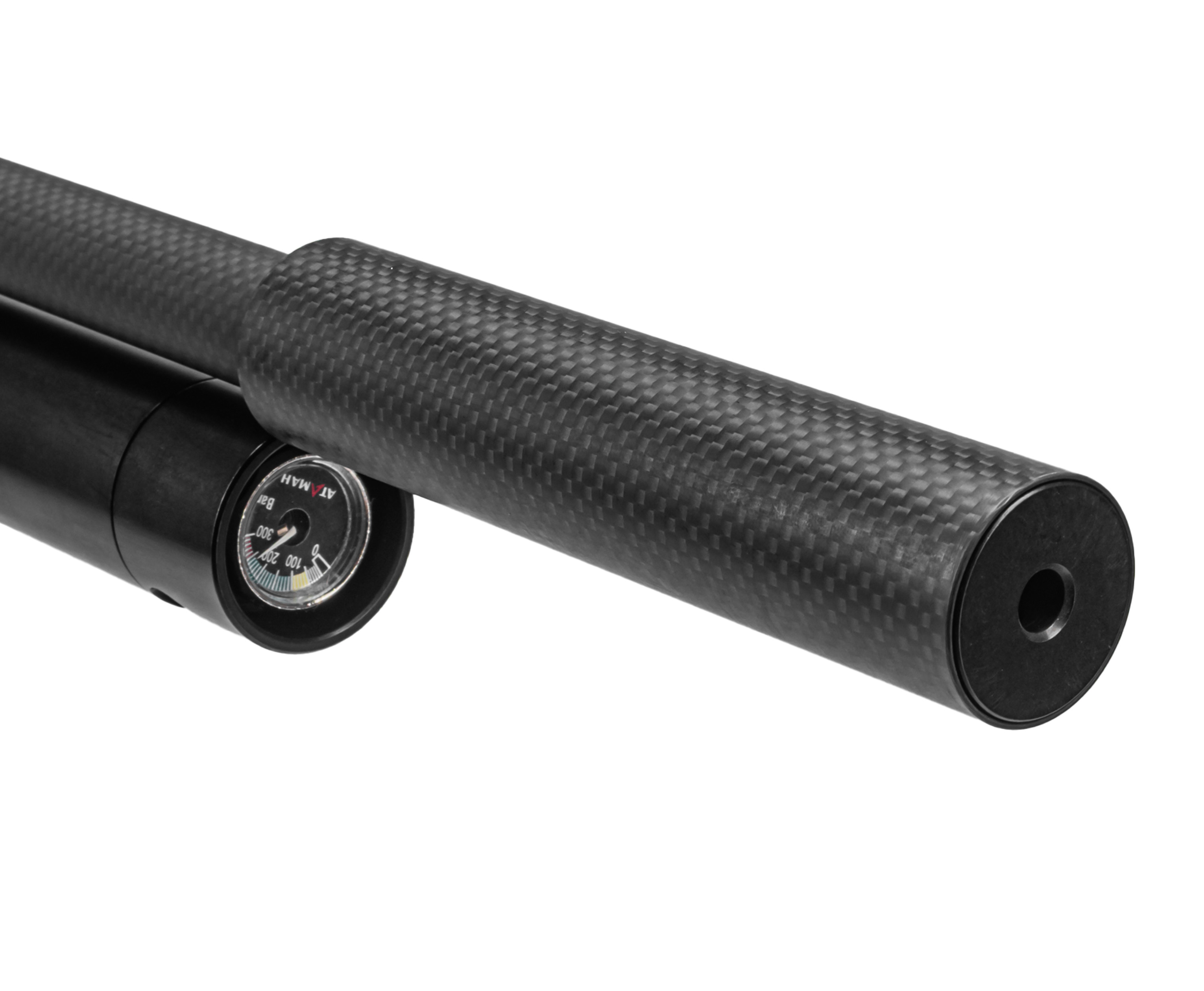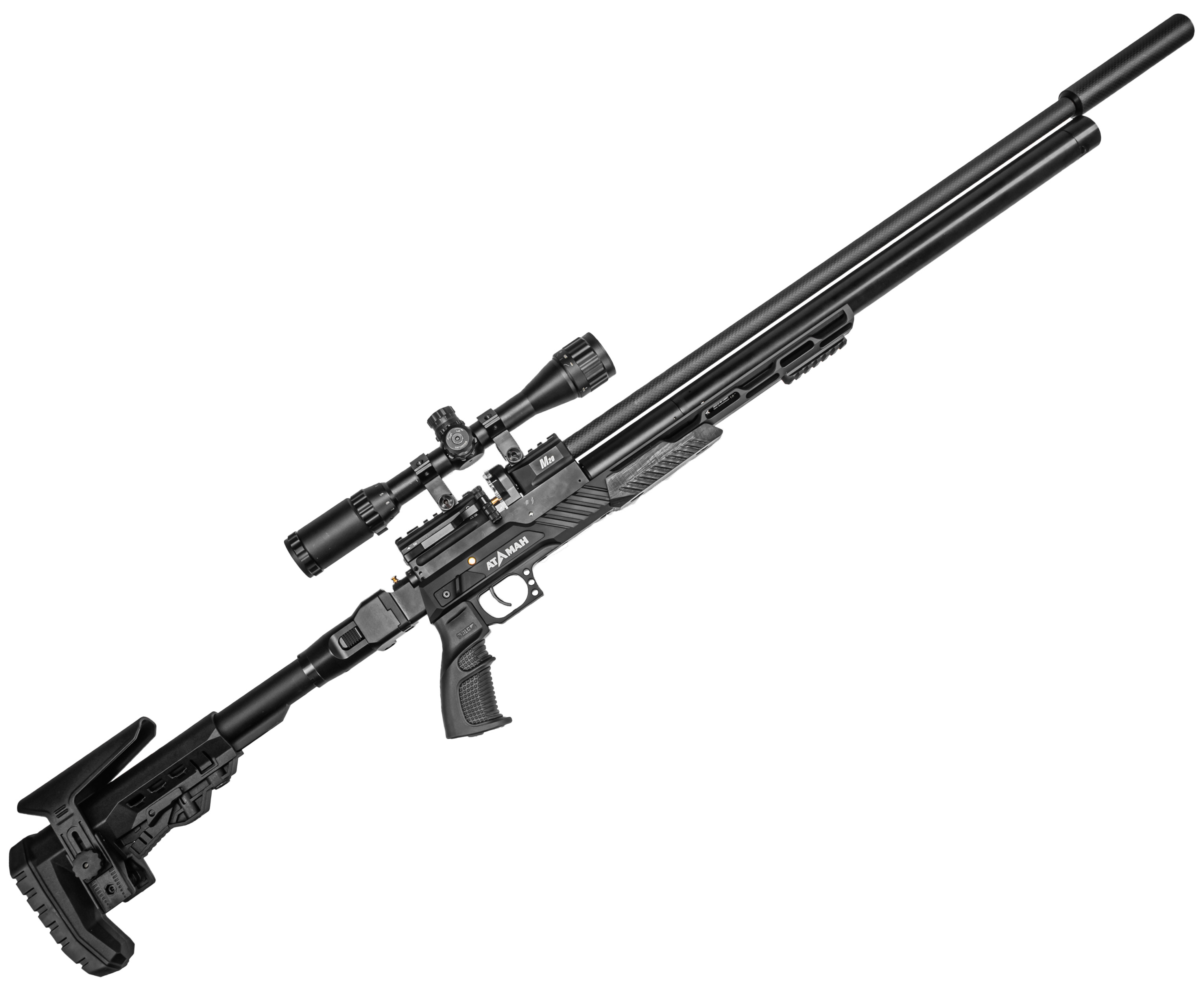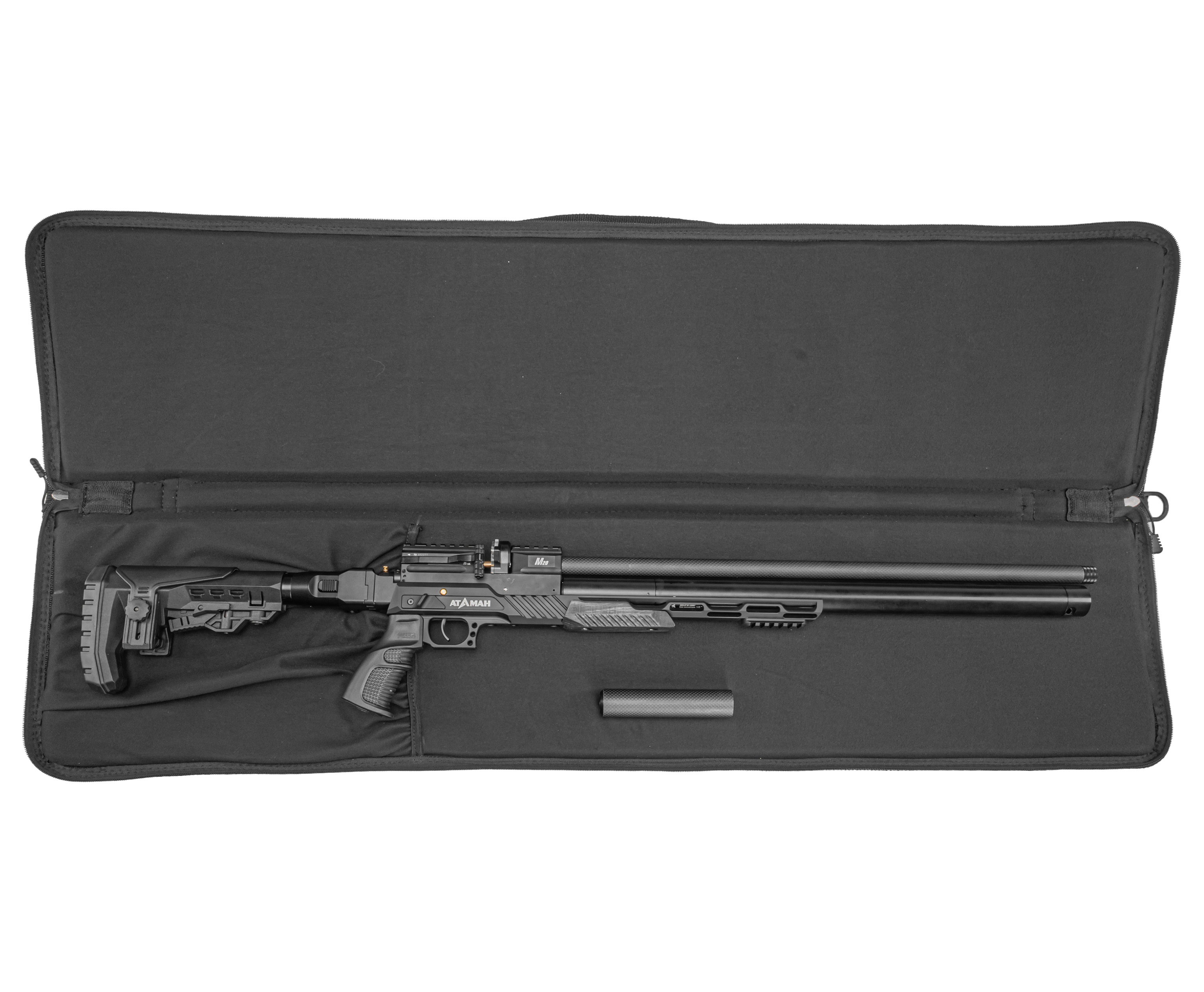 Тактический карабин Атаман М20 650 обзавелся удлиненным нарезным стволом 650 мм. Бланк заключен в карбоновый кожух, что с одной стороны повышает защищенность оного от внешнего воздействия, а с другой играет в пользу эстетическим качествам оружия. Также стоит отметить наличие саундмодератора - съемная насадка приглушает резкость хлопка, снижая громкость выстрела.