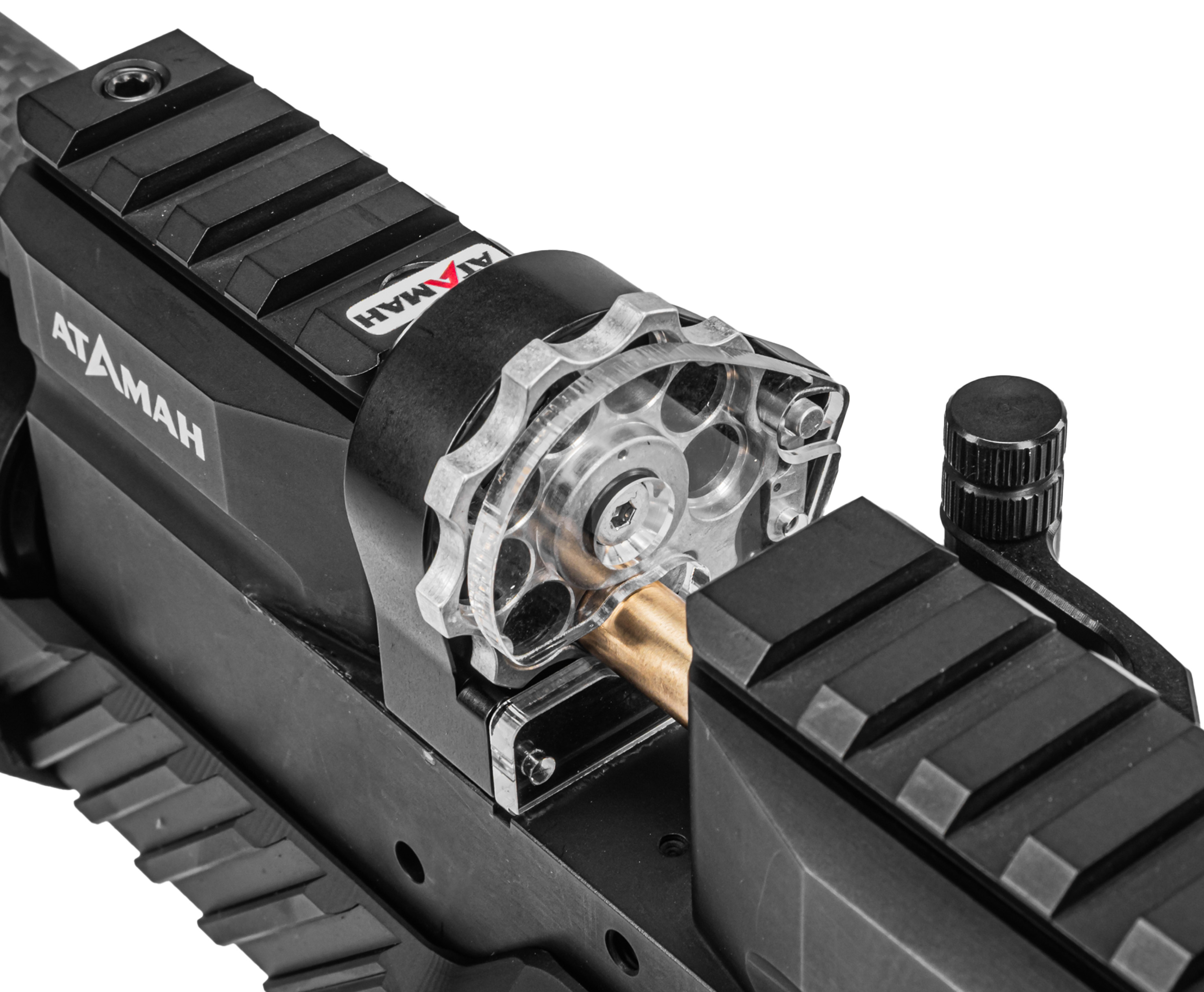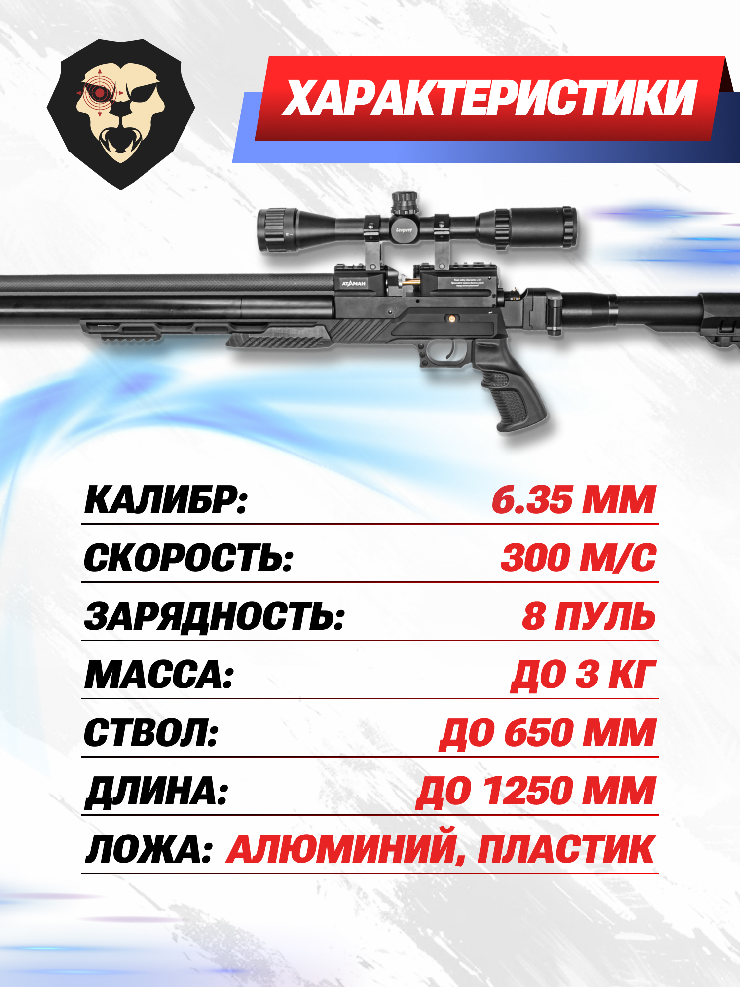 Пневматическая винтовка Ataman выполнена в калибре 6.35 мм. Конфигурация позволяет использовать боеприпасы стандартного типа или полнотелые тяжелые пули, образующие больший импульс в момент попадания в мишень. Питание организовано посредством отмыкаемого барабанного магазина на 8 слотов.