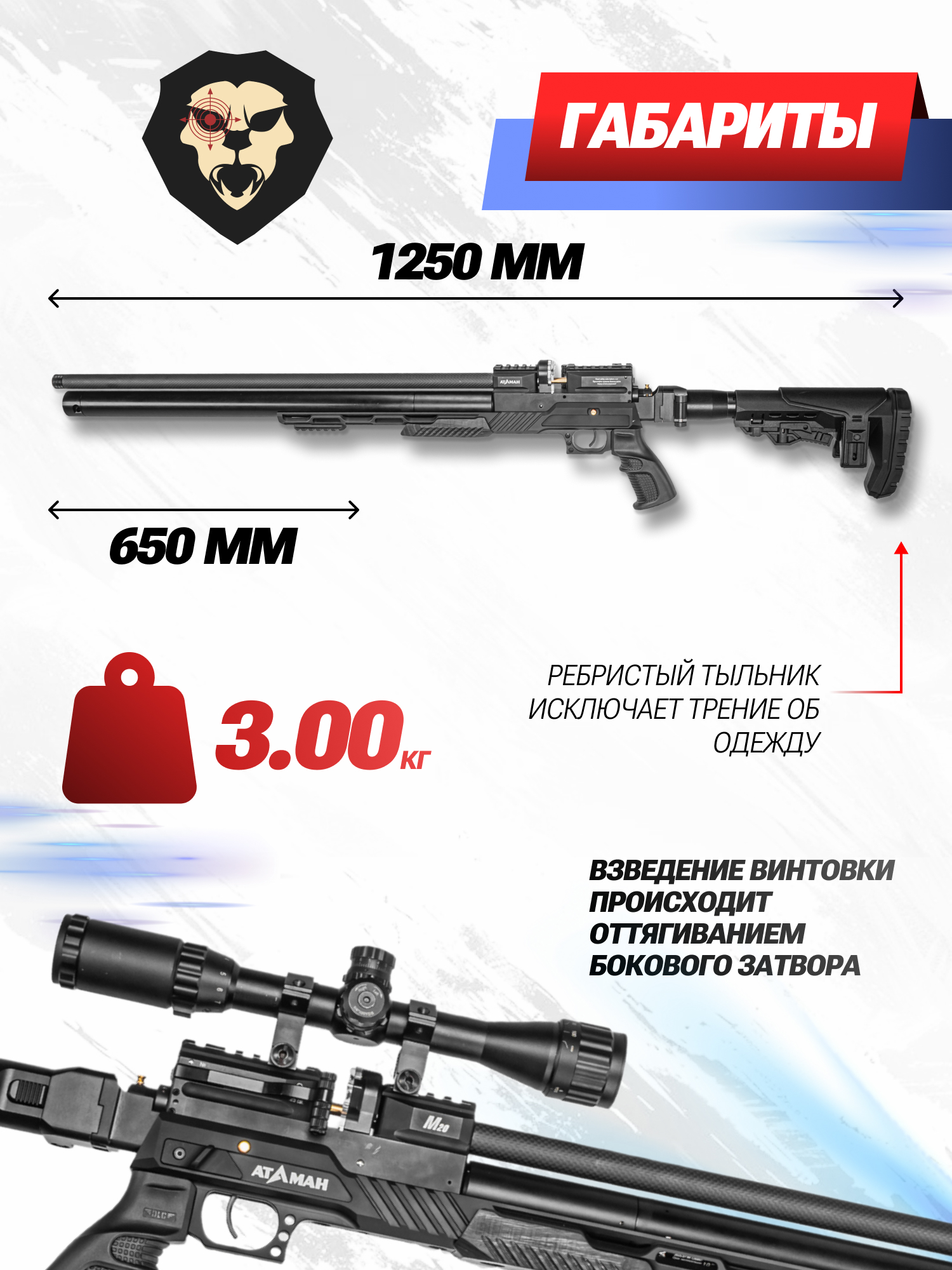Атаман ведет стрельбу с предварительного взведения затвора биатлонного типа, а для наведения потребуется докупить отдельно подходящий оптический прицел, под установку которого предусмотрена планка Weaver. Комфорт вкладки обеспечит телескопический плечевой упор с широкими возможностями настройки под комплекцию владельца. Он же оснащен узлом, позволяющим сложить приклад вбок для сокращения габаритов при перевозке.