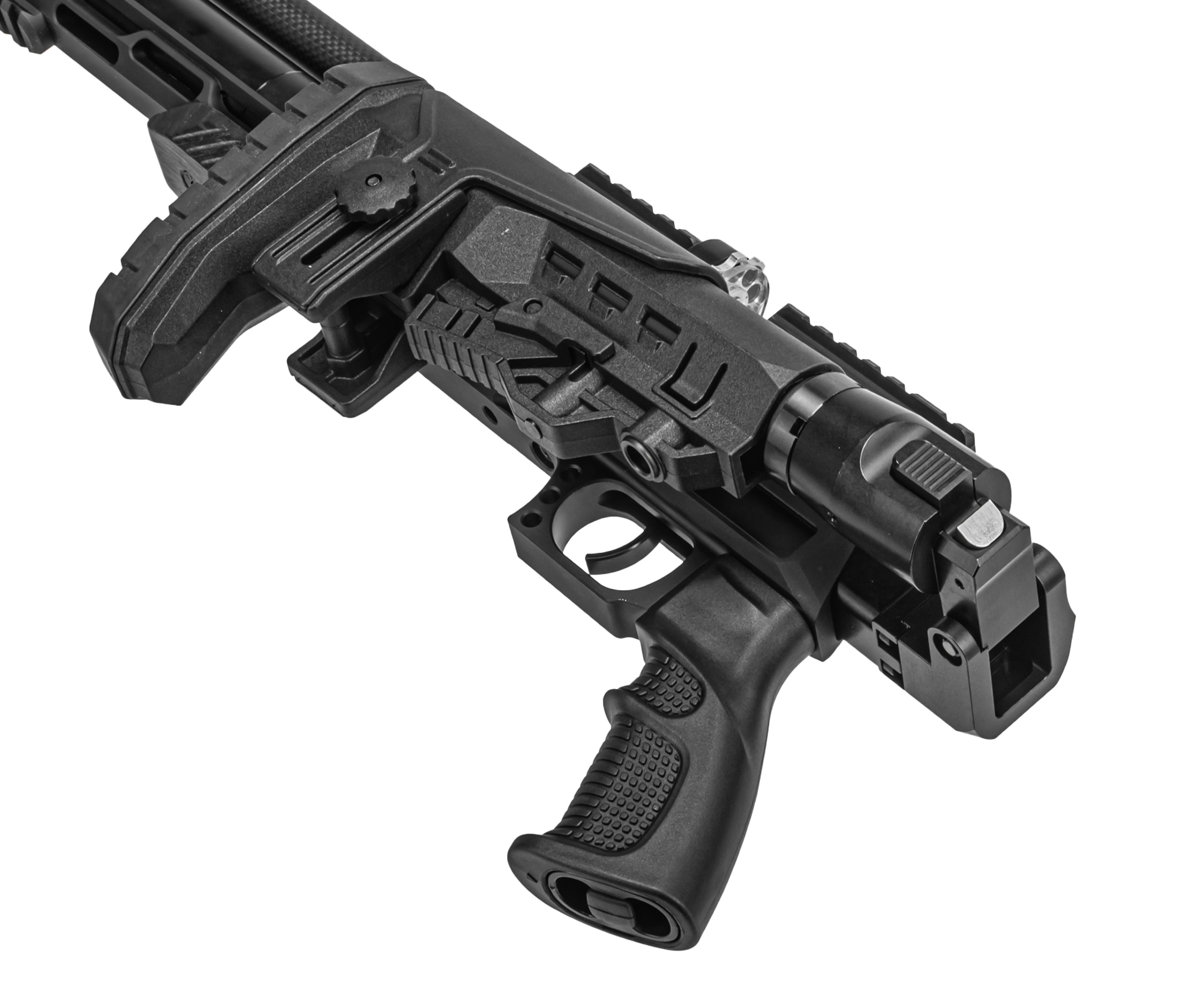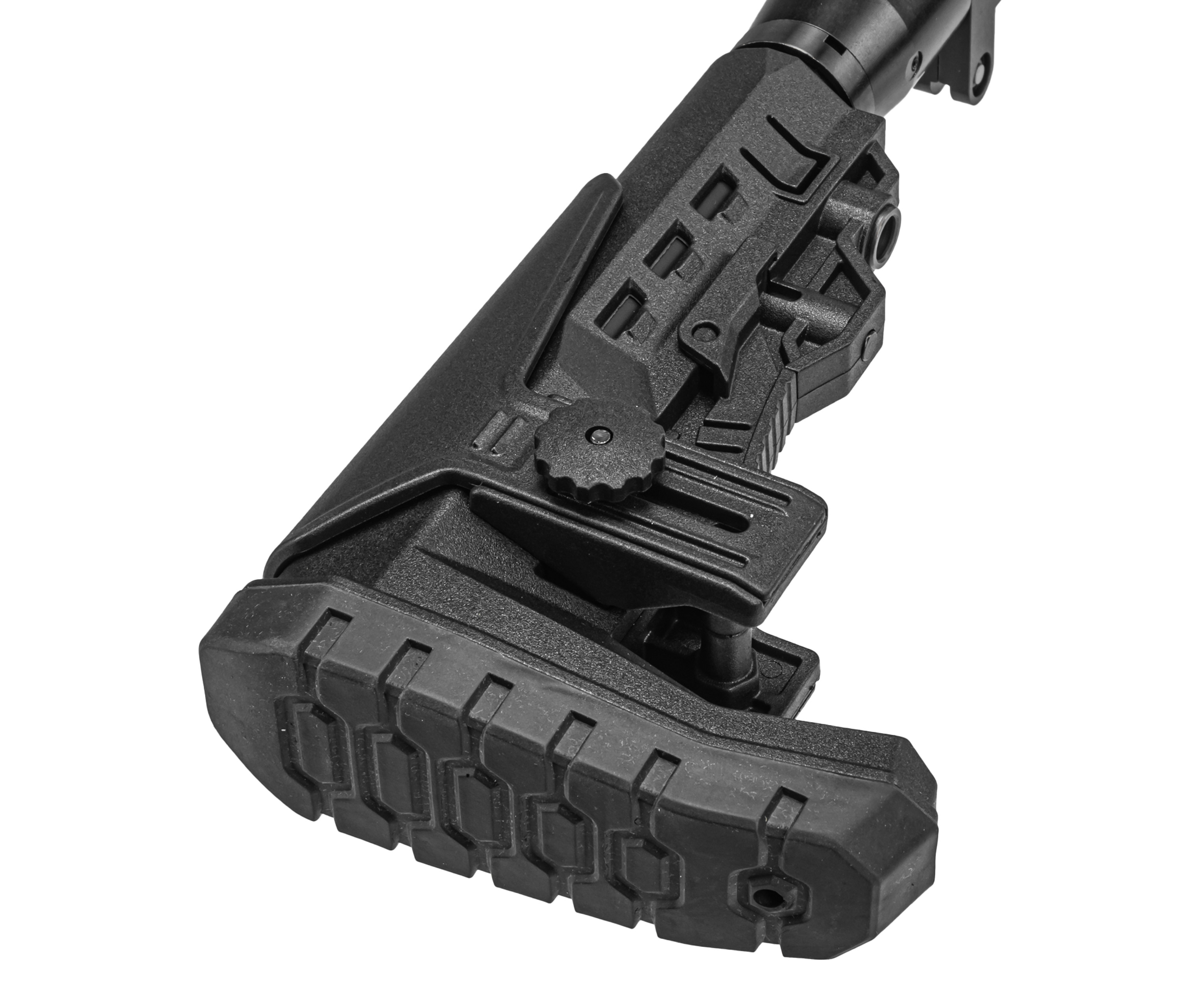 Для удобства удержания инженеры предусмотрели наличие дополнительного упора и полноценную пистолетную рукоять, как у AR-15, с отсеком под батарейки к навесному оборудованию. В области цевья присутствует накладка из ламината, а посадочная RIS планка дает смонтировать сошки или лазерный целеуказатель - такой же интерфейс Weaver есть на ствольной коробке под установку оптики. Общий размер карабина остался в пределах 910 миллиметров - сложив телескопический приклад, этот показатель можно уменьшить.