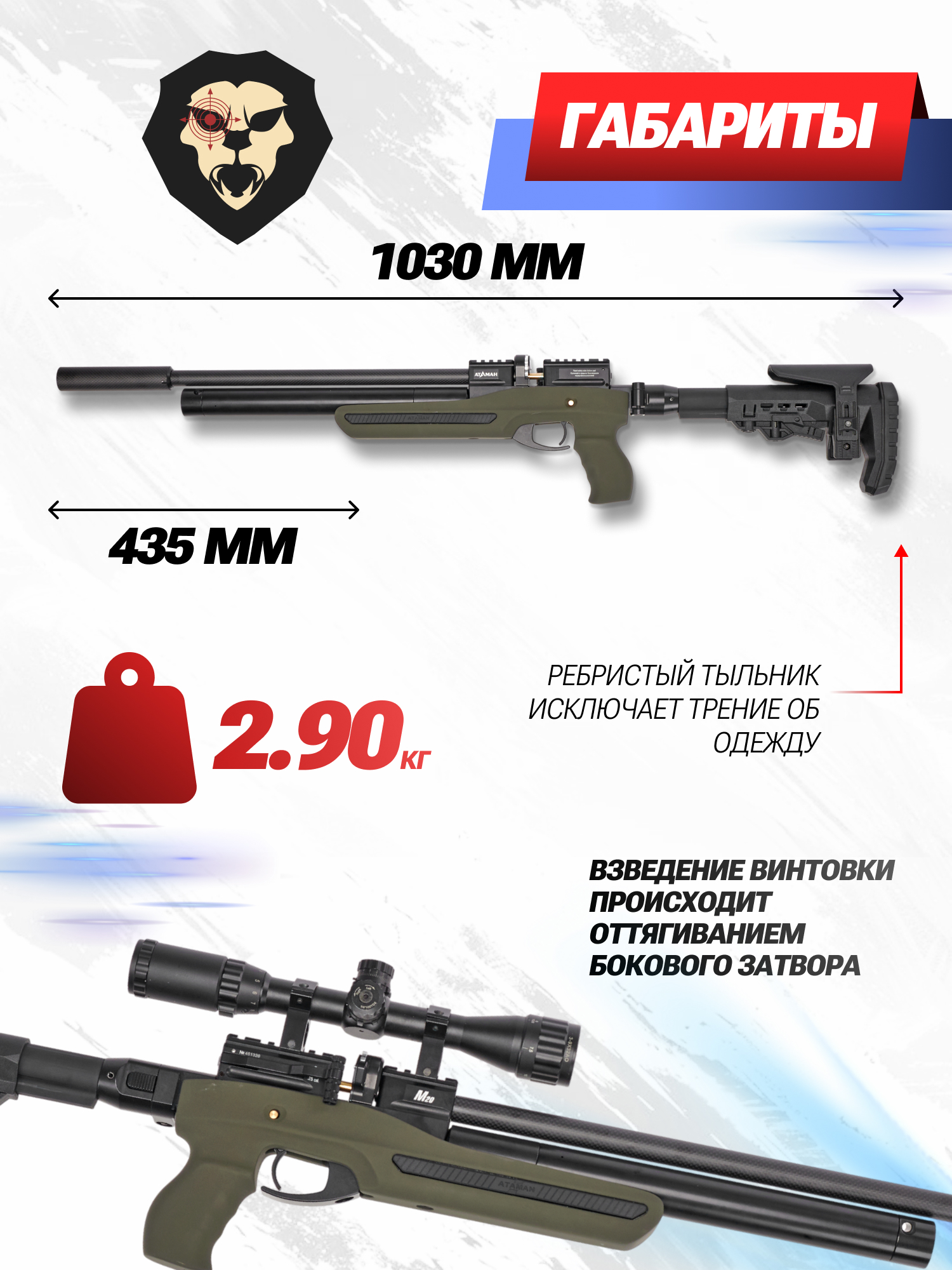 В экспортном исполнении скорость вылета пули составляет 285 м/с. Обозреваемая модель Атамана предназначается для российских пользователей и обладает мощностью не больше 3-х Дж. Таким образом, чтобы приобрести винтовку, не потребуется оформлять лицензию.