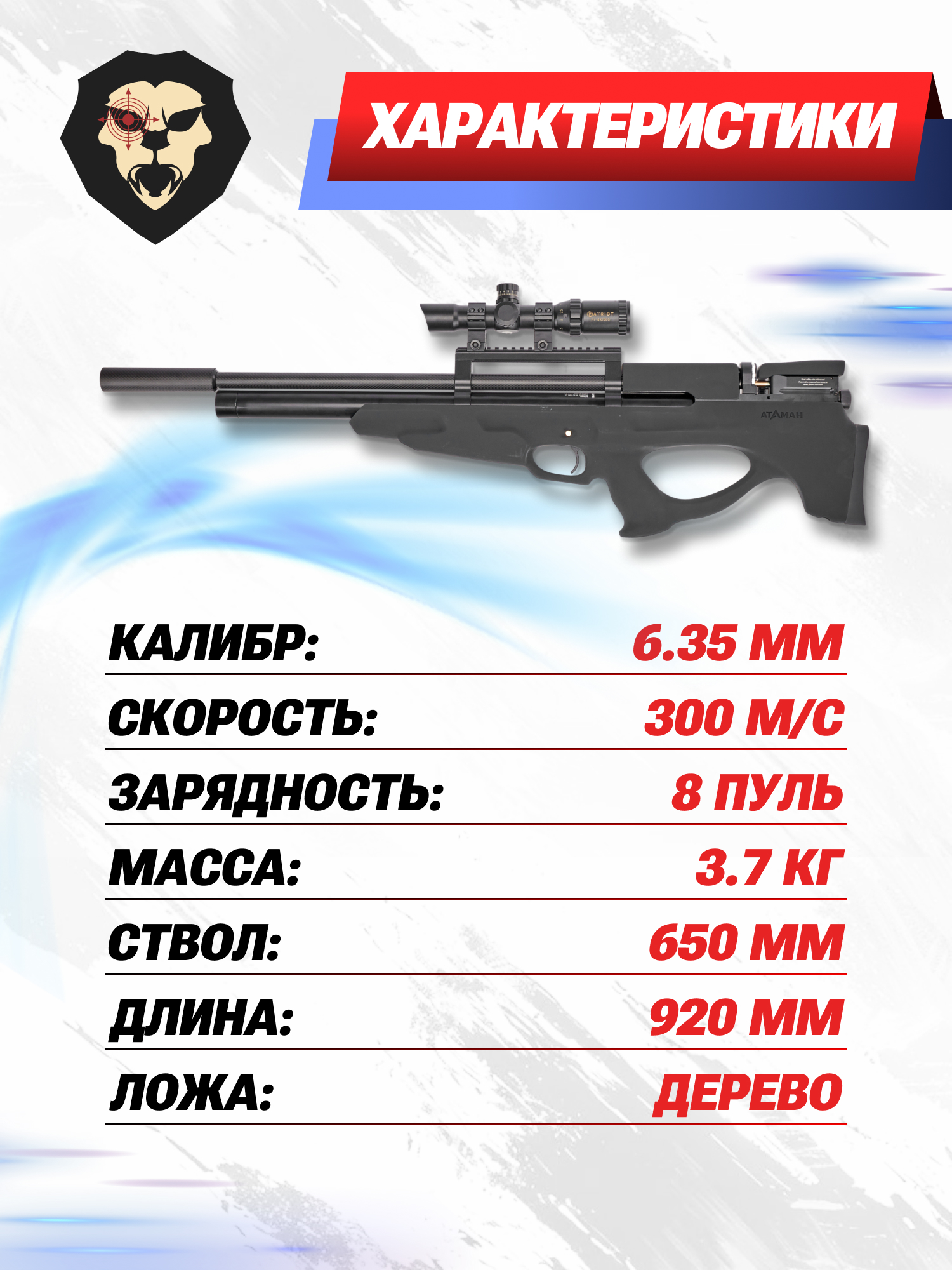 Выпущенный снаряд по заявлению изготовителя развивает скорость 300 м/с. Такой показатель характерен для экземпляров, поставляемых на экспорт. Винтовка Атаман 6.35 мм обозреваемого образца предназначается для российского рынка и имеет мощность не больше 3-х Дж - благодаря этой особенности пневматика приобретается без потребности в лицензии.
