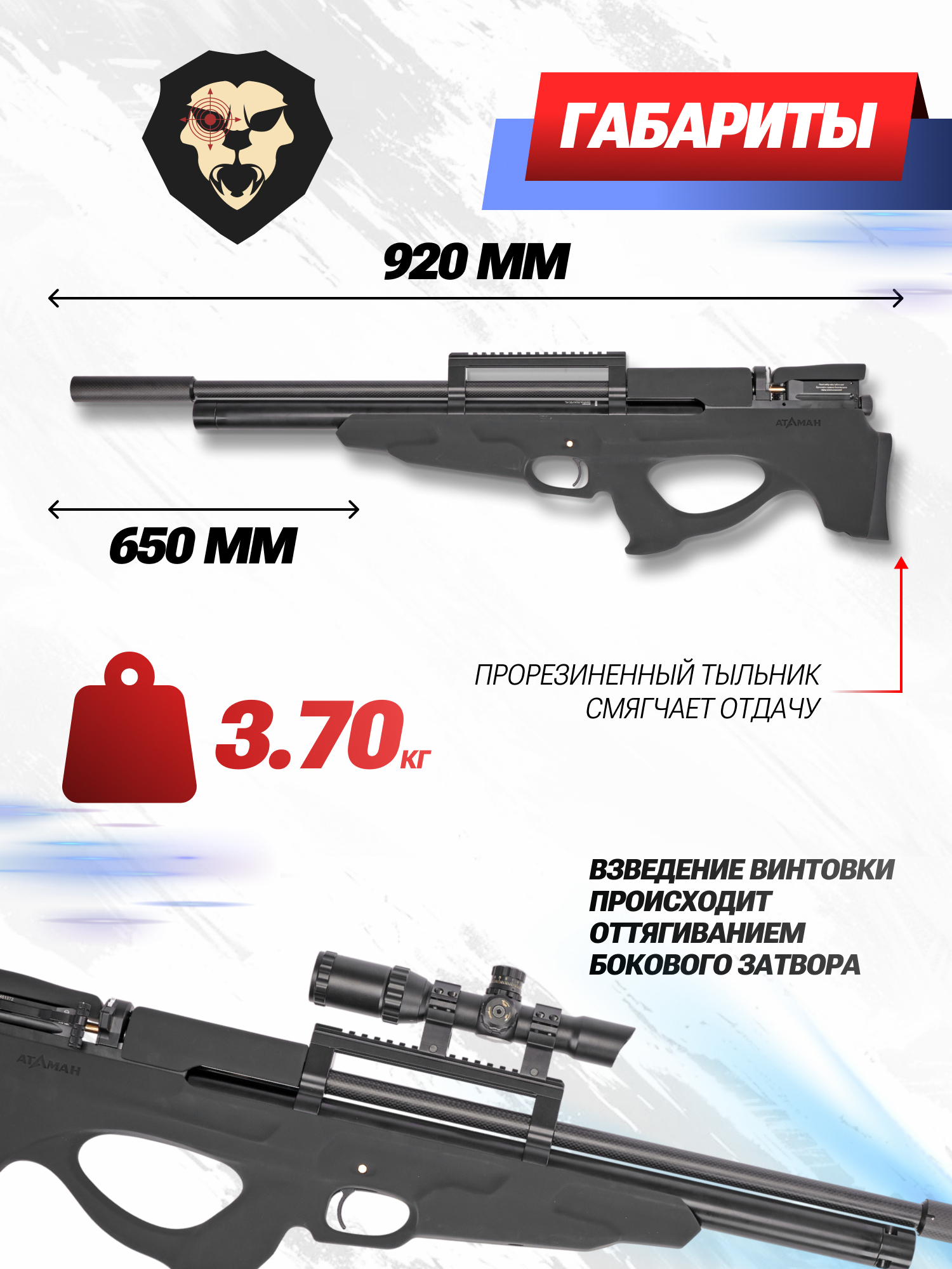 Информация о товаре "Пневматическая винтовка Ataman M20S 648 6.35 мм (Soft-Touch, редуктор, полнотел, Булл-Пап)" носит ознакомительный характер, и не является публичной офертой, определяемой положениями Статьи 437 Гражданского кодекса Российской Федерации, характеристики, внешний вид, цвет и комплектация могут быть изменены производителем без уведомления.