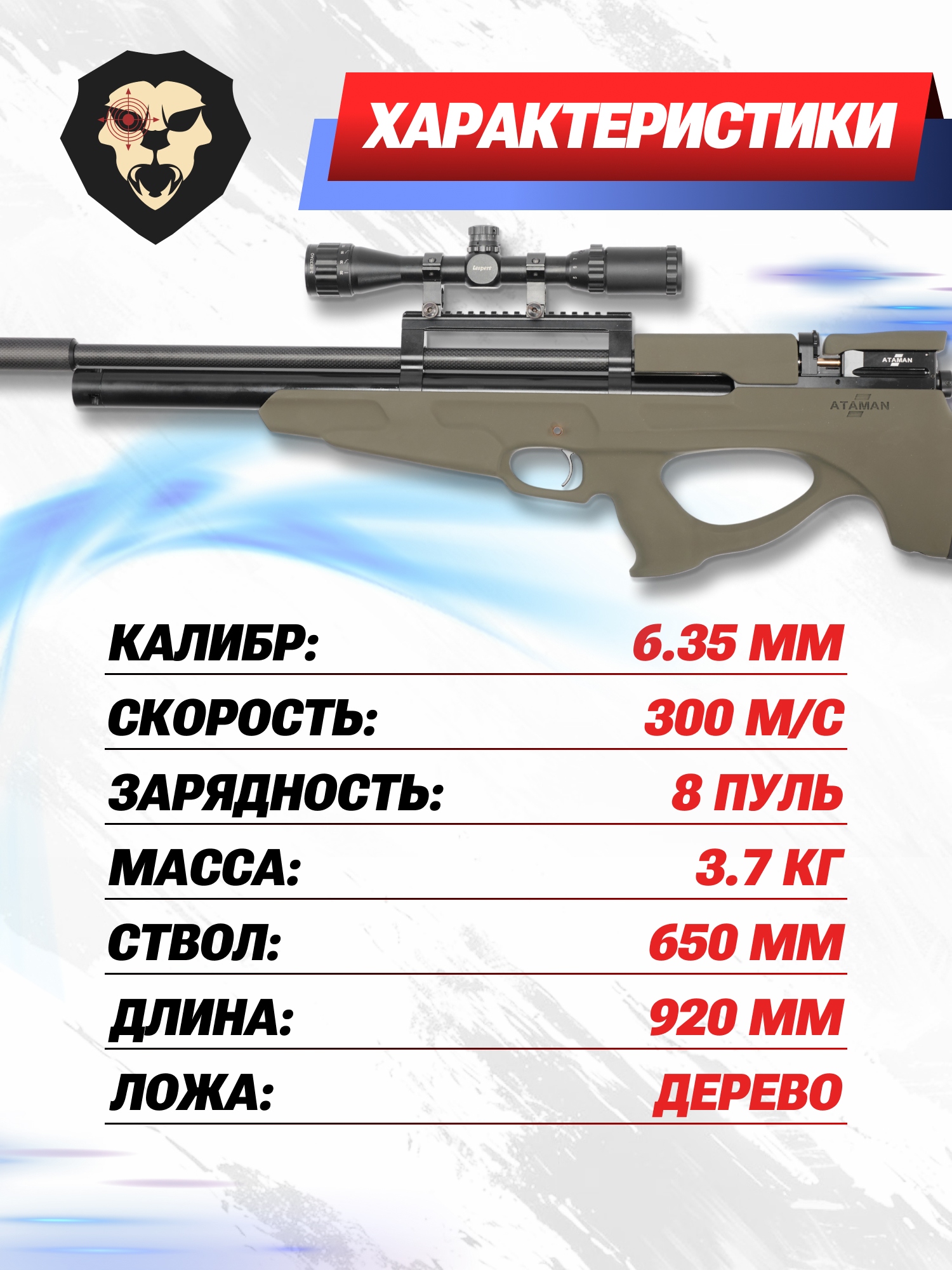 Фирма разрабатывает и выпускает «воздушки» в различной компоновке. В товарном ряде присутствуют как классические карабины, так и винтовки в Bull-Pup исполнении. К изделиям такого рода относится рассматриваемый образец Ataman серии M20S, который оснащается ложей из натурального дерева - поверхность обрабатывается нескользящим защитным Soft-Touch покрытием оливкового цвета.