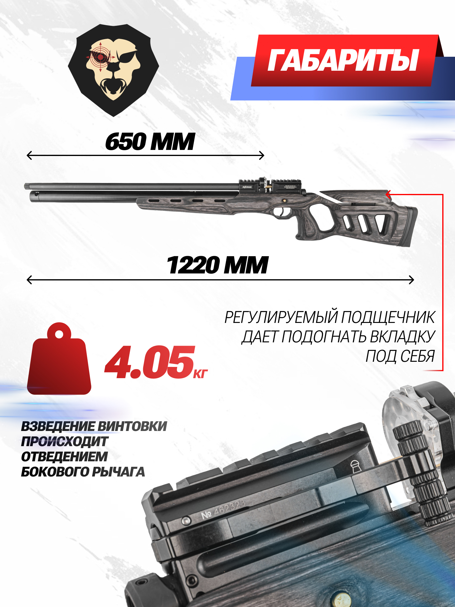 | Комплектация | Винтовка, магазин, саундмодератор, заправочный штуцер, ключи, краткая документация, упаковка, копия сертификата (по запросу покупателя) |