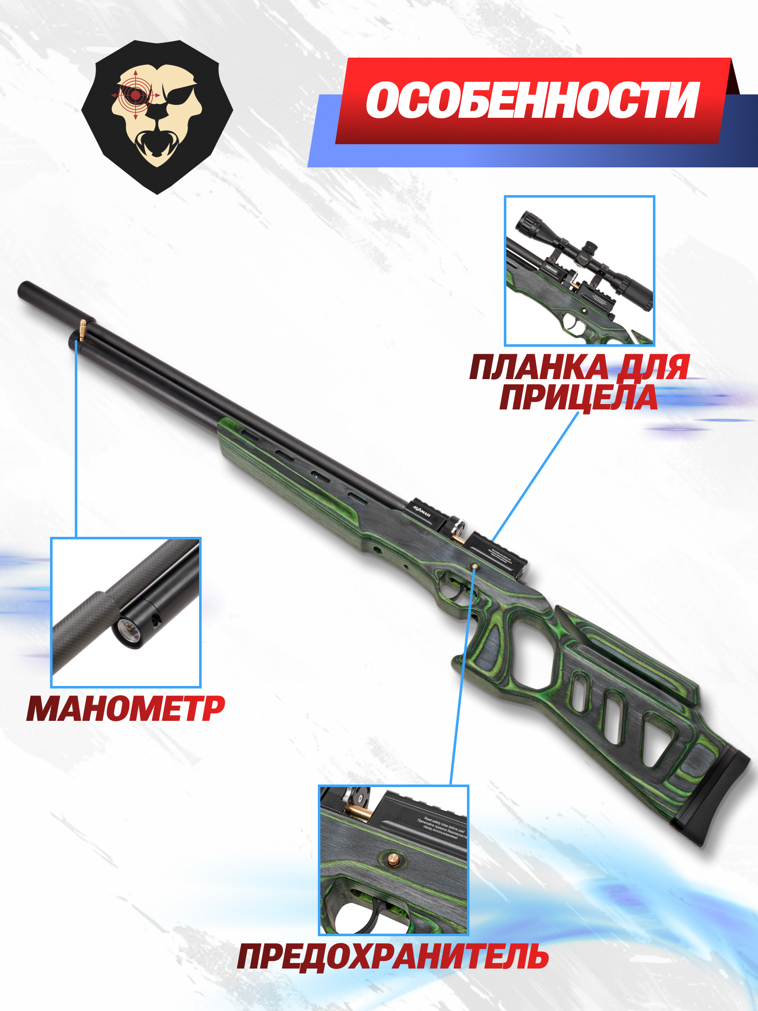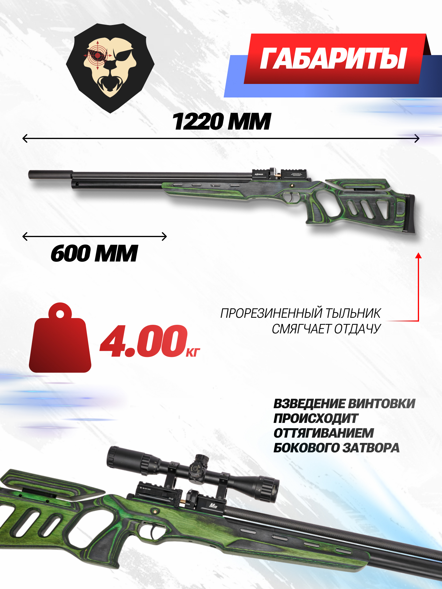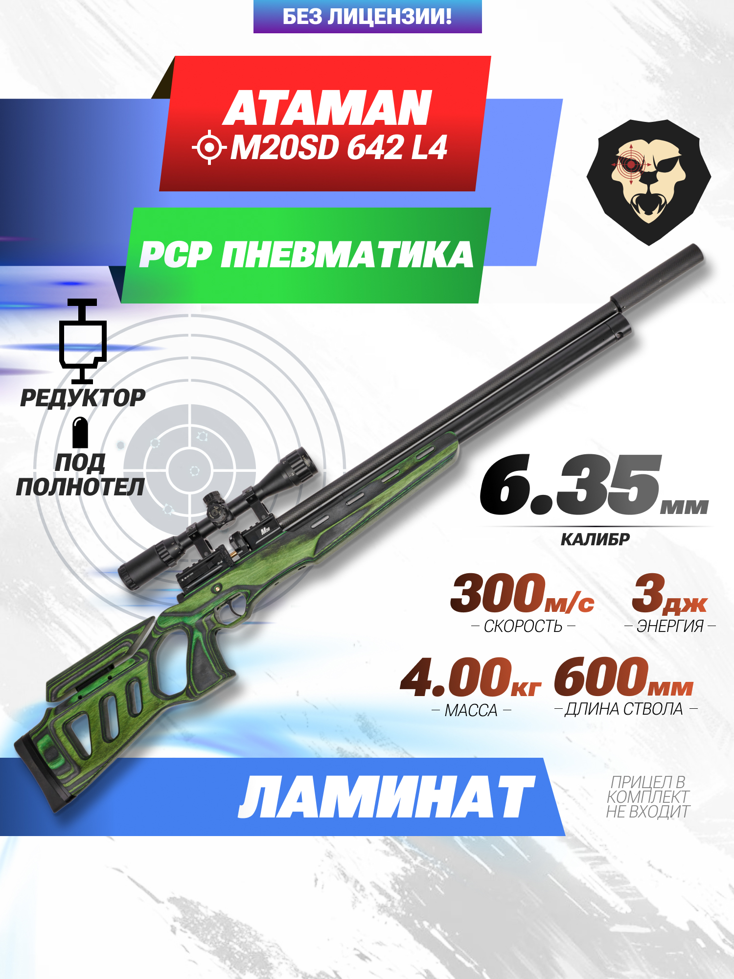 Информация о товаре "Пневматическая винтовка Ataman M20SD 642 L4 6.35 мм (редуктор, зеленый ламинат, полнотел)" носит ознакомительный характер, и не является публичной офертой, определяемой положениями Статьи 437 Гражданского кодекса Российской Федерации, характеристики, внешний вид, цвет и комплектация могут быть изменены производителем без уведомления.