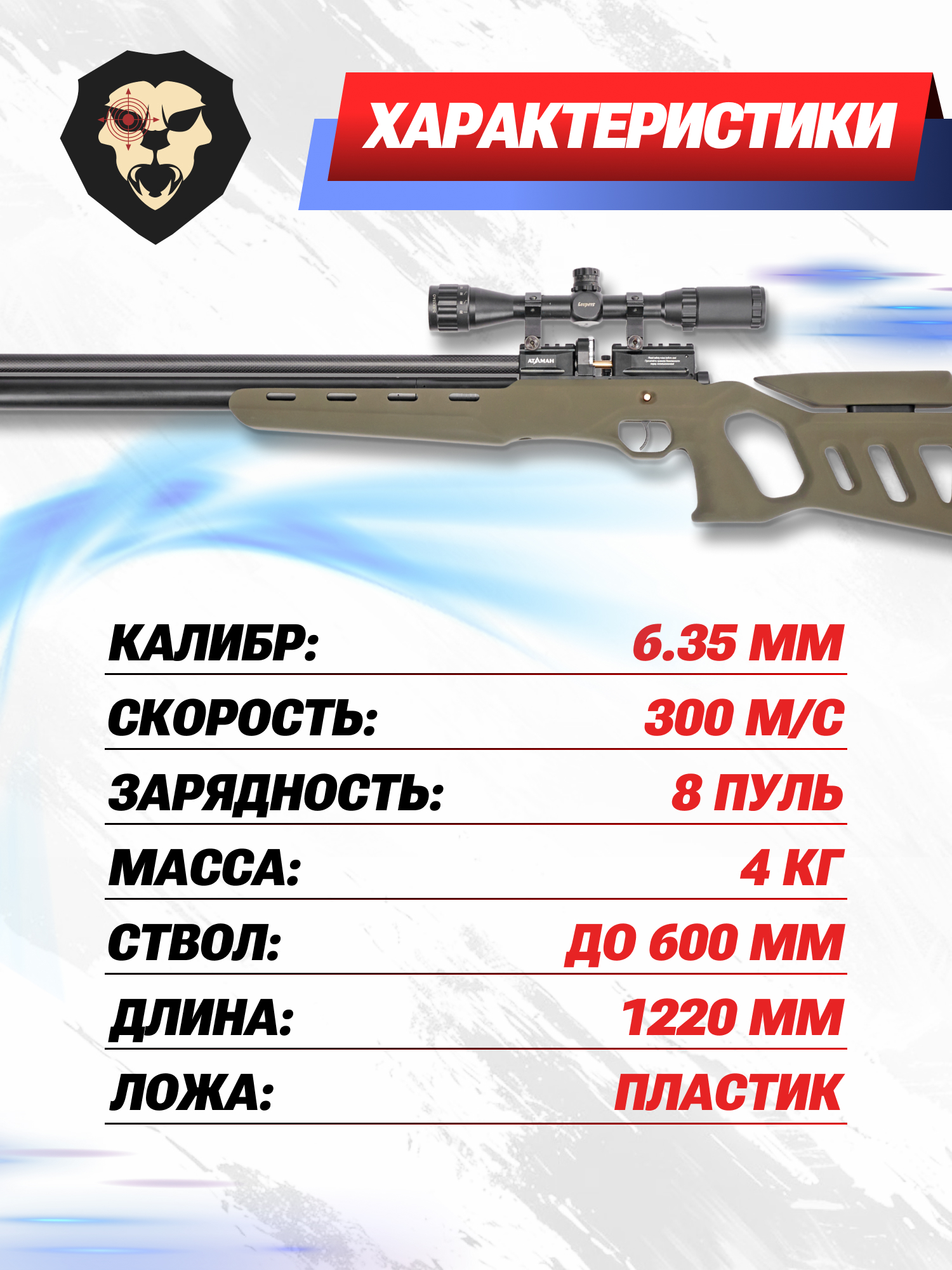 Образец способен разгонять пулю до 300 метров в секунду, из-за чего возможно вести стрельбу на удаленные дистанции. Однако производитель намеренно уменьшил дульную энергию до 3 Дж, из-за чего пневматическая винтовка Атаман 6.35 доступна к свободному приобретению без лицензии.