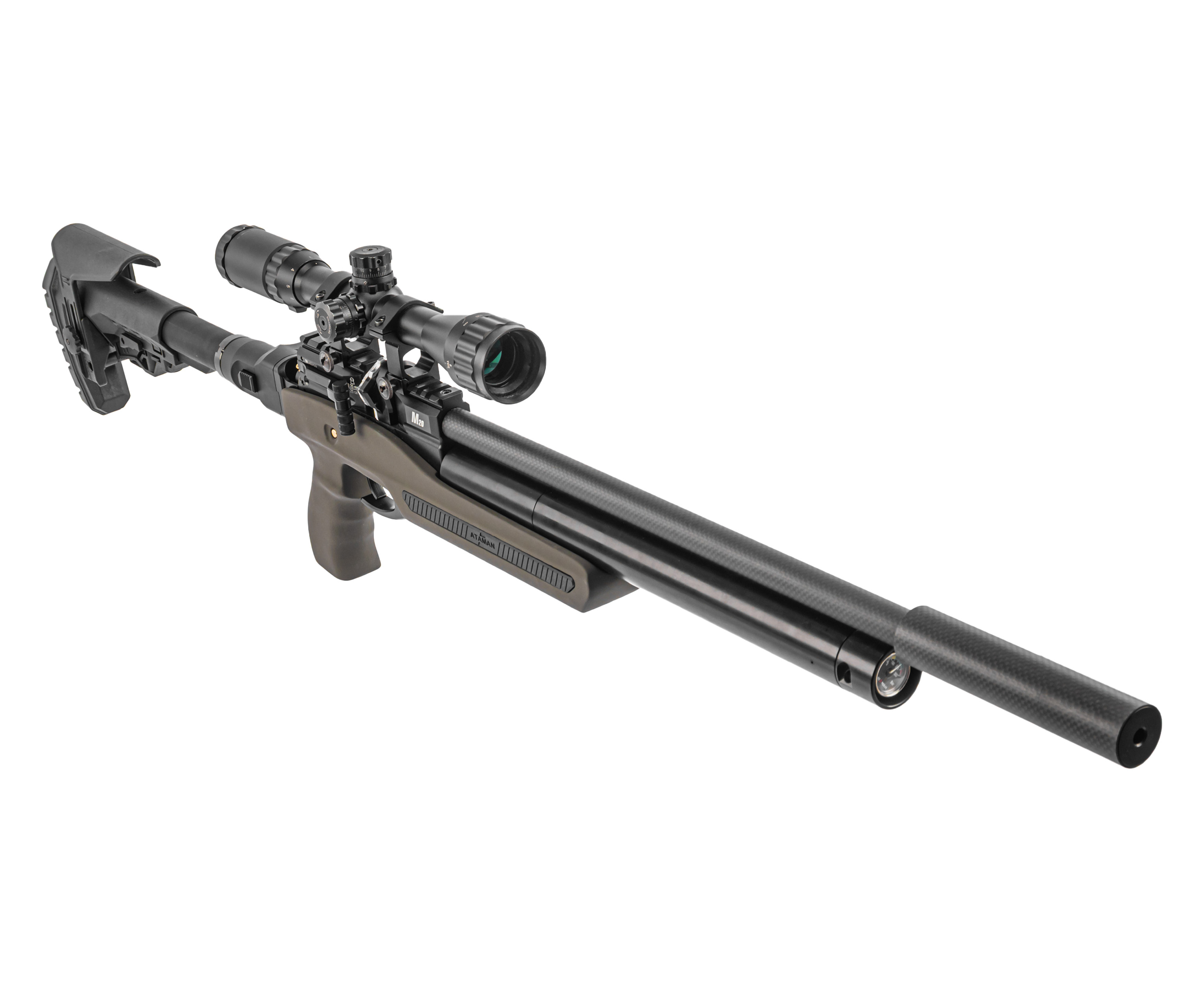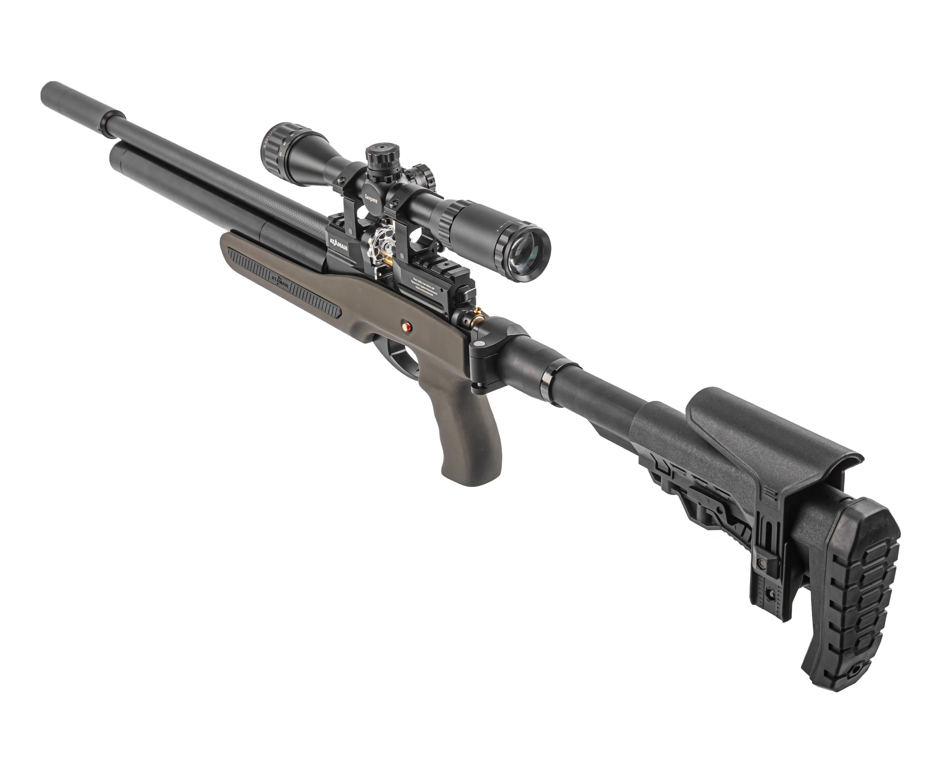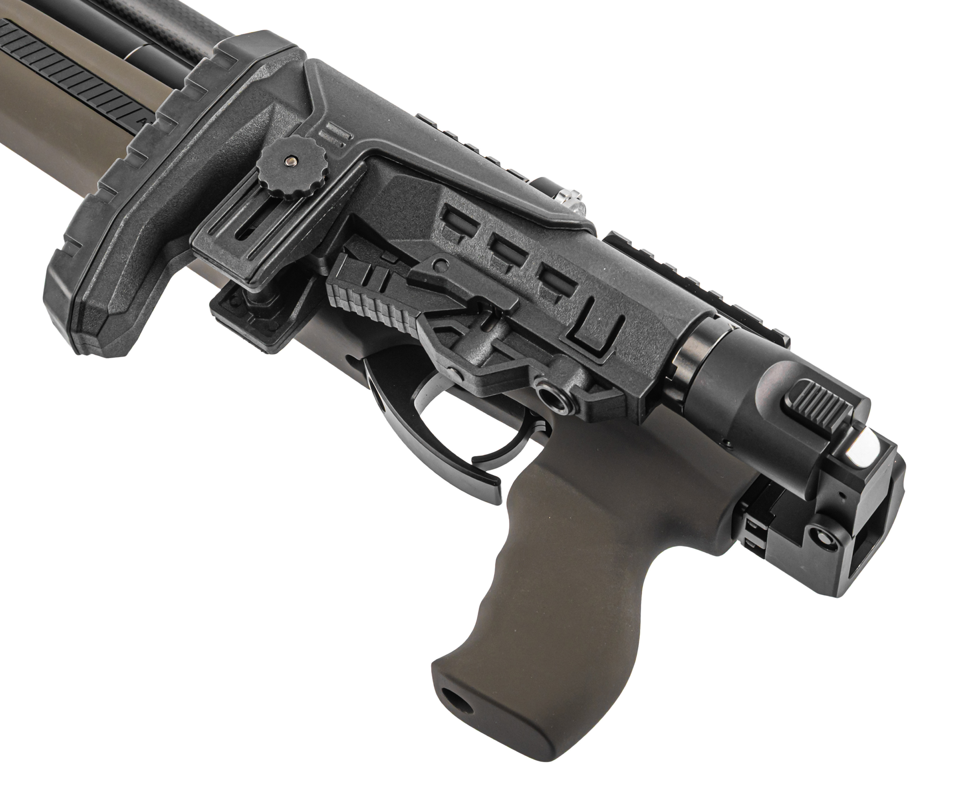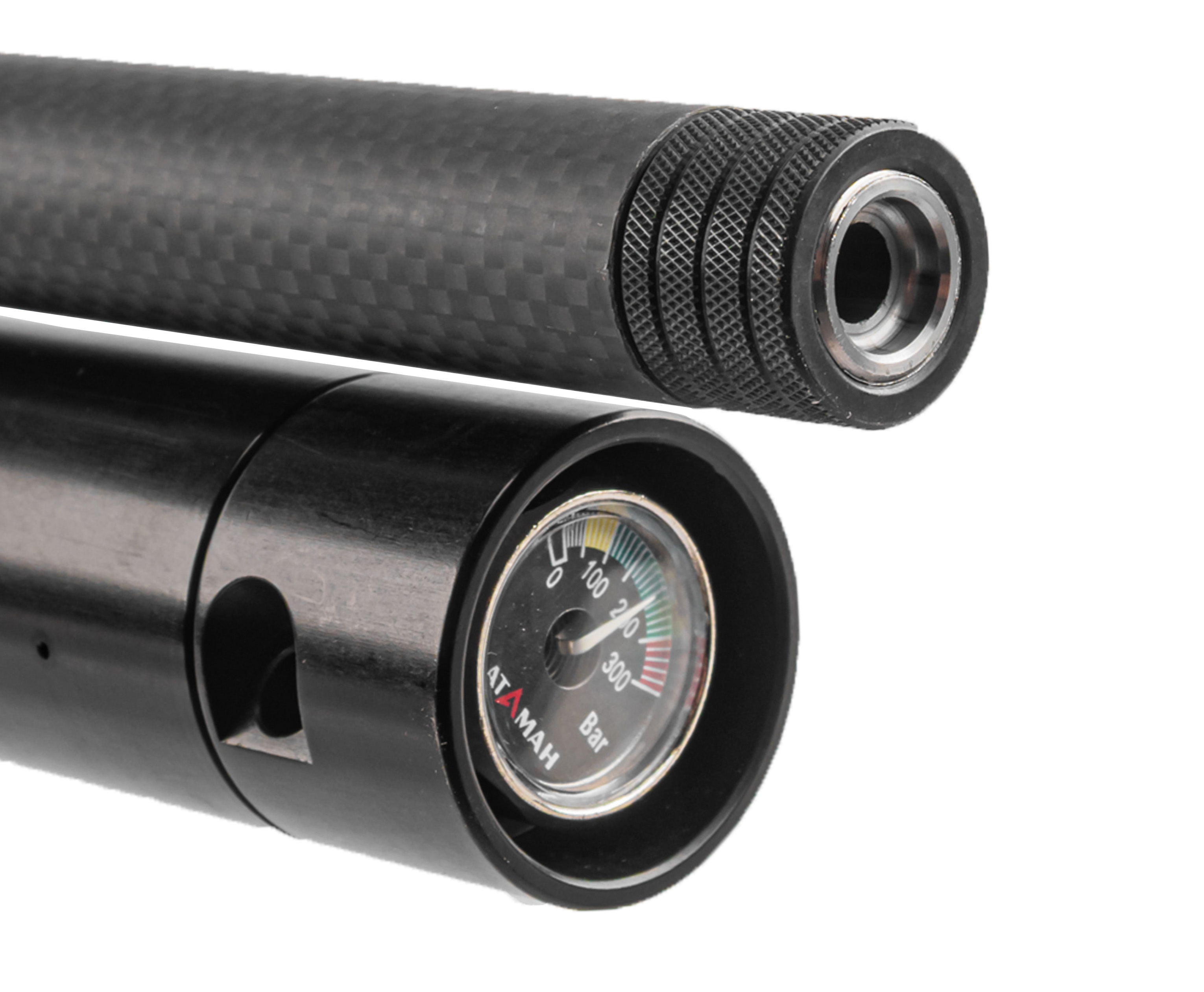 Предельный уровень накачки ресивера составляет 300 Бар. Указанный параметр отслеживается в полевых условиях - для этого в передней пробке баллона присутствует манометр. Кроме прочего, пневматика оснащается редуктором, благодаря которому можно самостоятельно выставить давление пропускаемого в ствол воздуха - на практике это положительно сказывается на повторяемости выстрела.