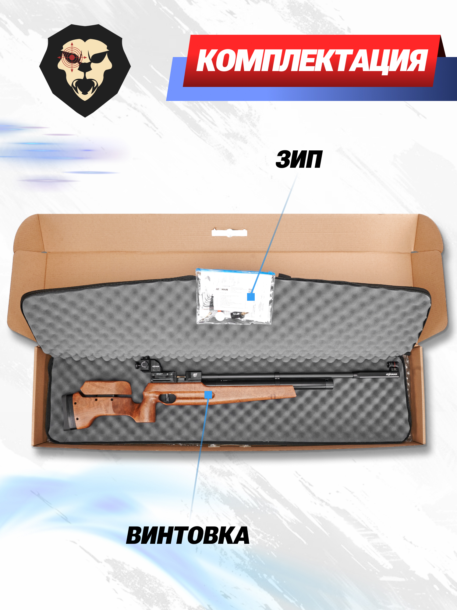 | Комплектация | Винтовка, упаковка, диоптрийный прицел, чехол, заправочный штуцер, краткая документация, копия сертификата (по запросу покупателя) |