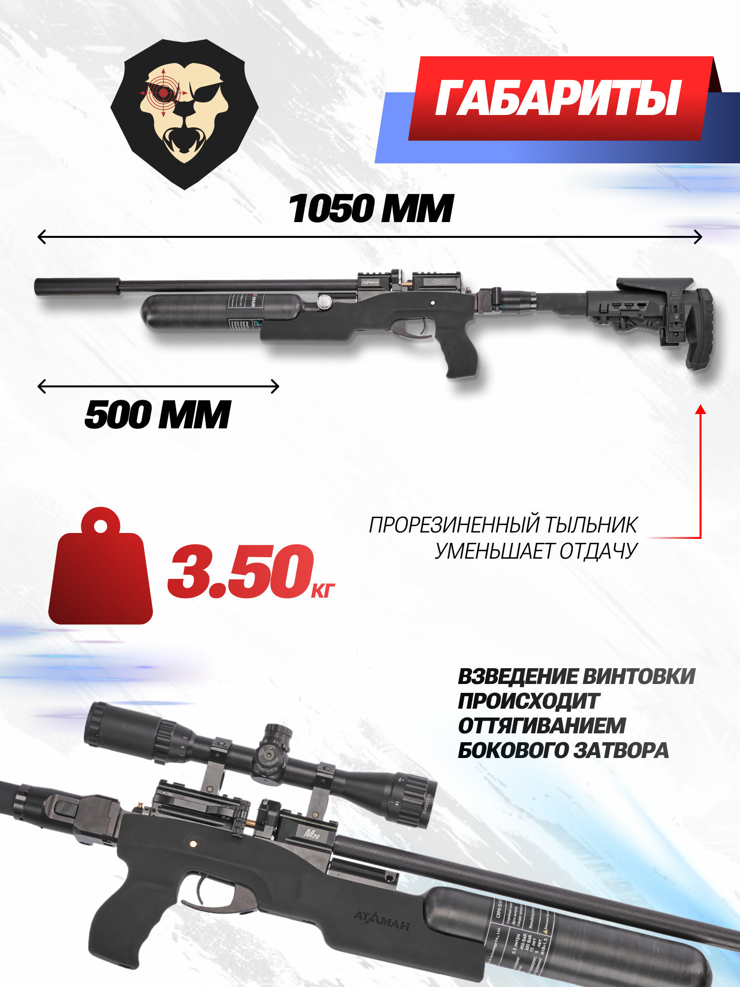 Пневматика со встроенным ресивером дает возможность совершить серию выстрелов на одной заправке. Большей автономностью за счет увеличенного внутреннего объема отличаются колбовые экземпляры. Фирма Ataman обновила ассортимент винтовок PCP в таком исполнении, представив серию малогабаритных карабинов с продуманной конфигурацией.