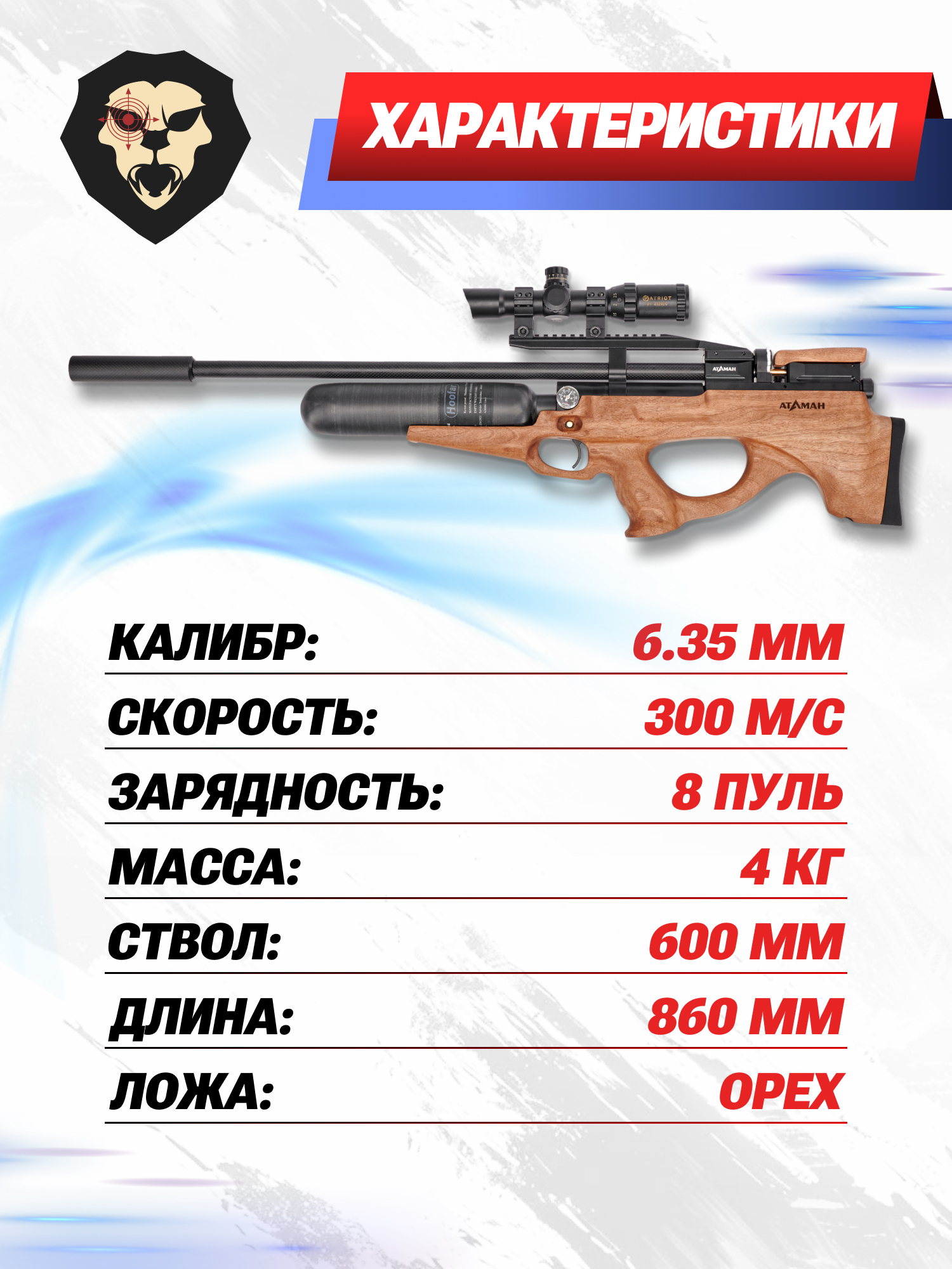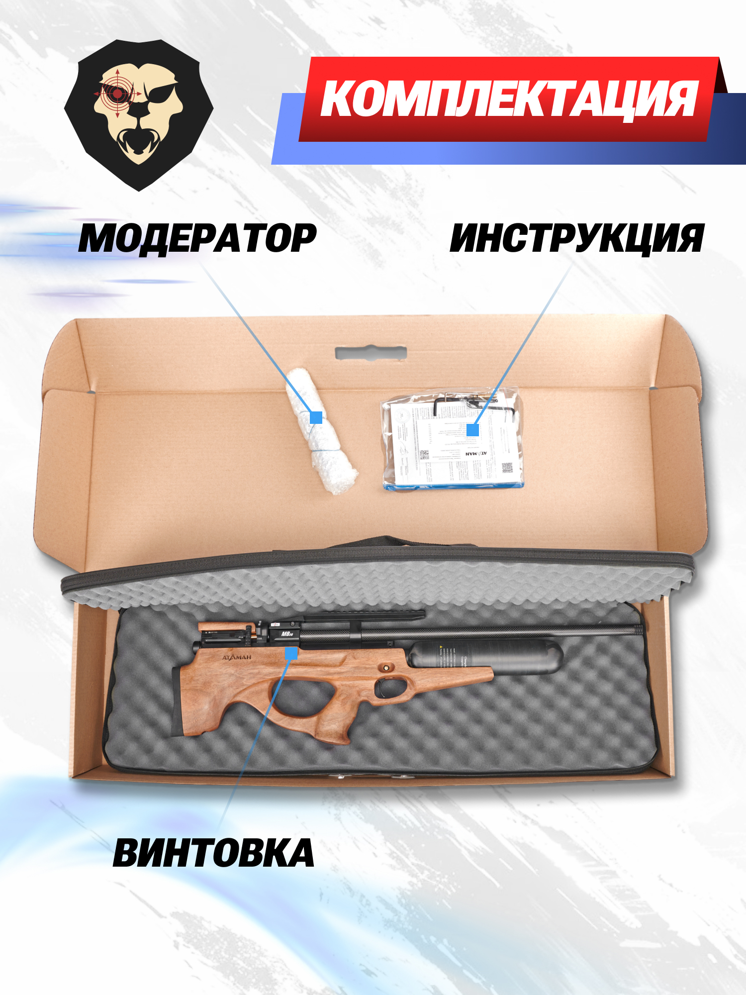 | Комплектация | Винтовка, магазин, заправочный штуцер, чехол, упаковка, краткая документация, копия сертификата (по запросу покупателя) |