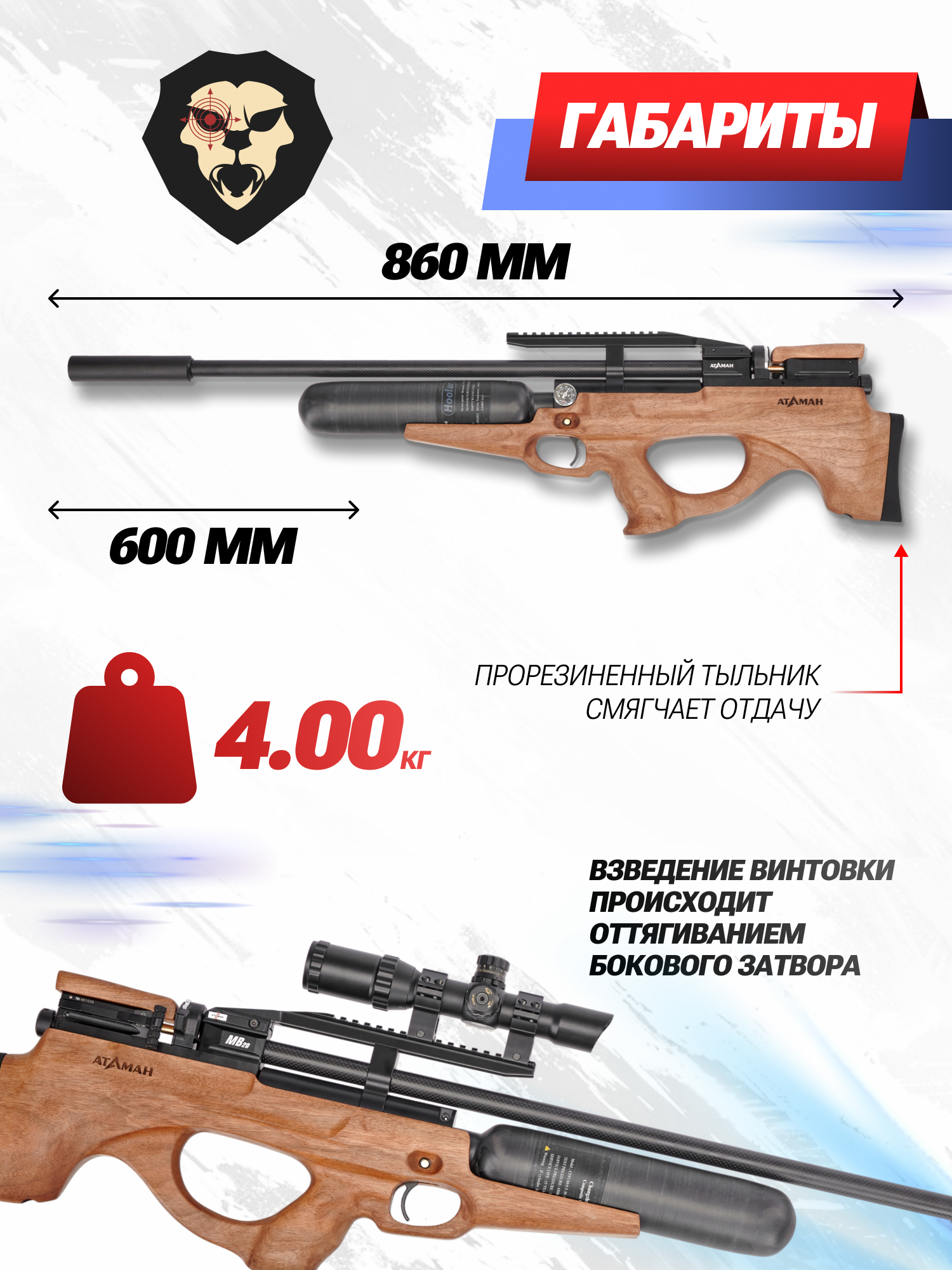 К числу последних относится Атаман МБ20 рассматриваемого образца. Из-за компоновки длина пневматики не превышает 86 сантиметров, из которых 60 см приходится на нарезной вывешенный ствол. Изготовитель использует бланки, отковываемые из прочной легированной стали, благодаря чему последние обладают увеличенной устойчивостью к износу.