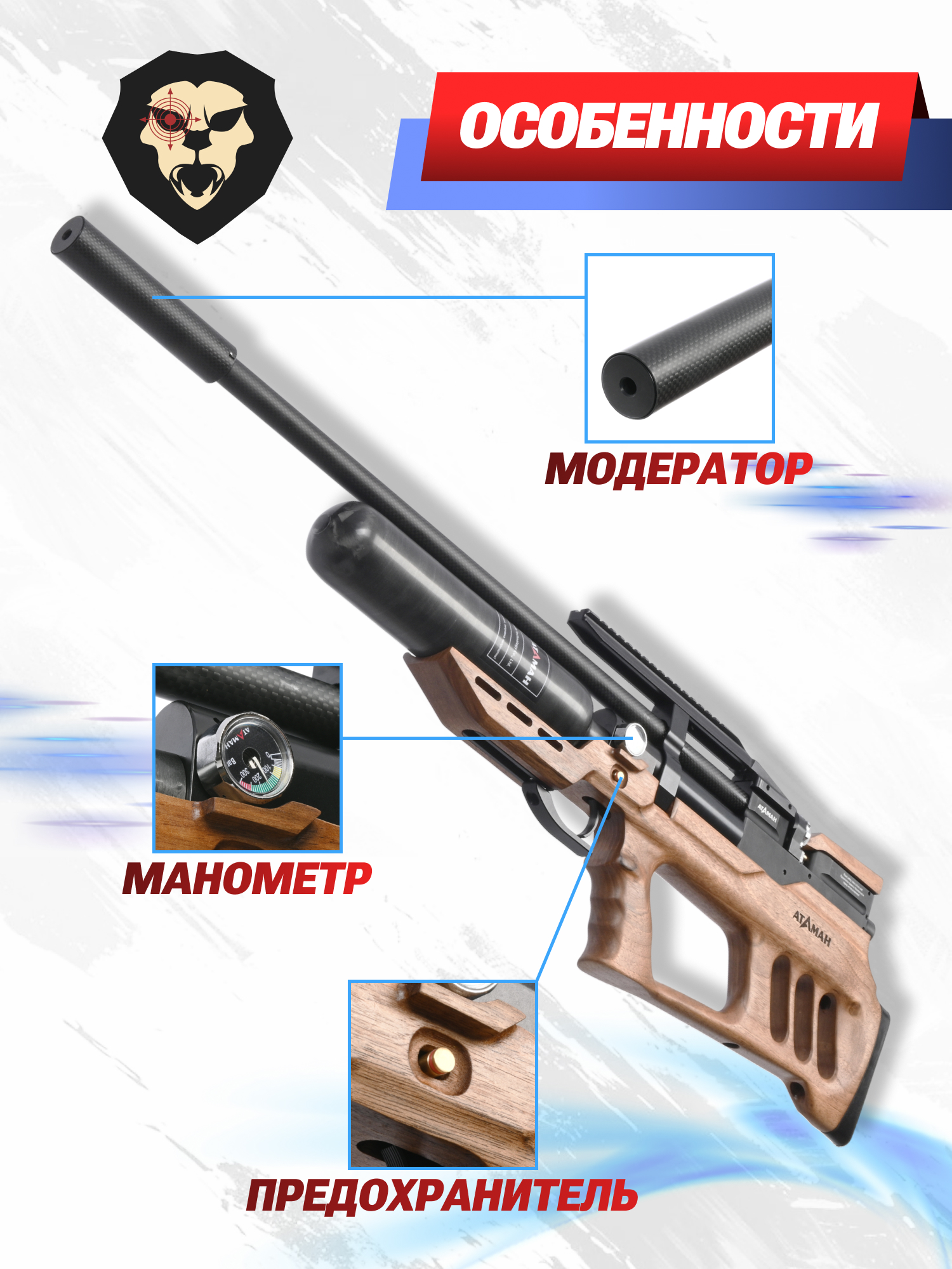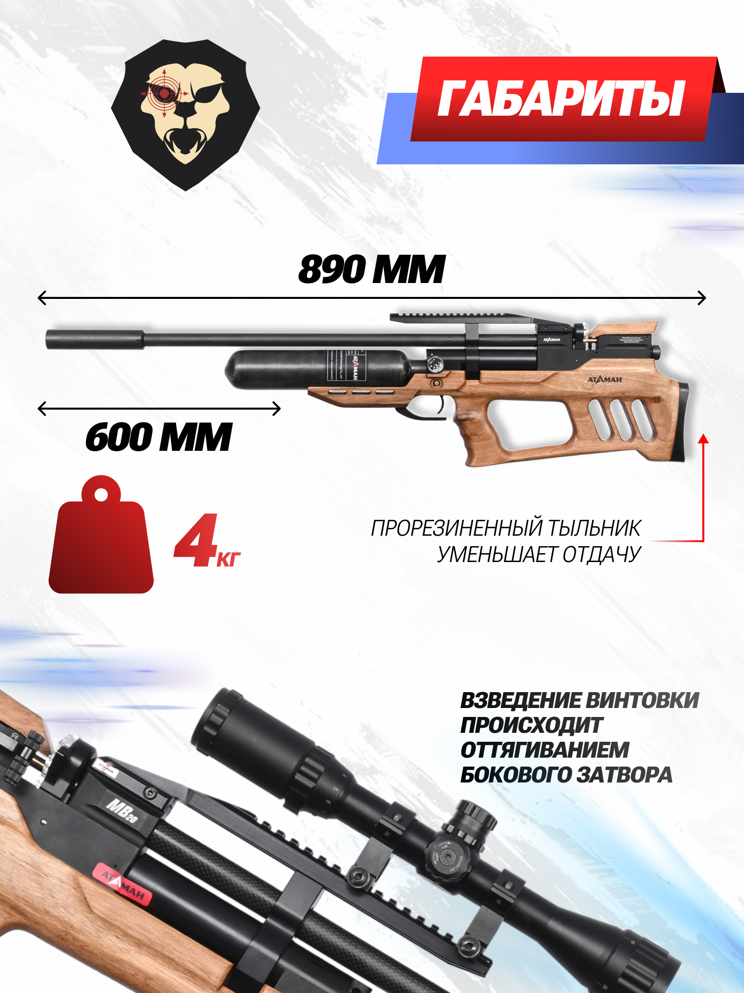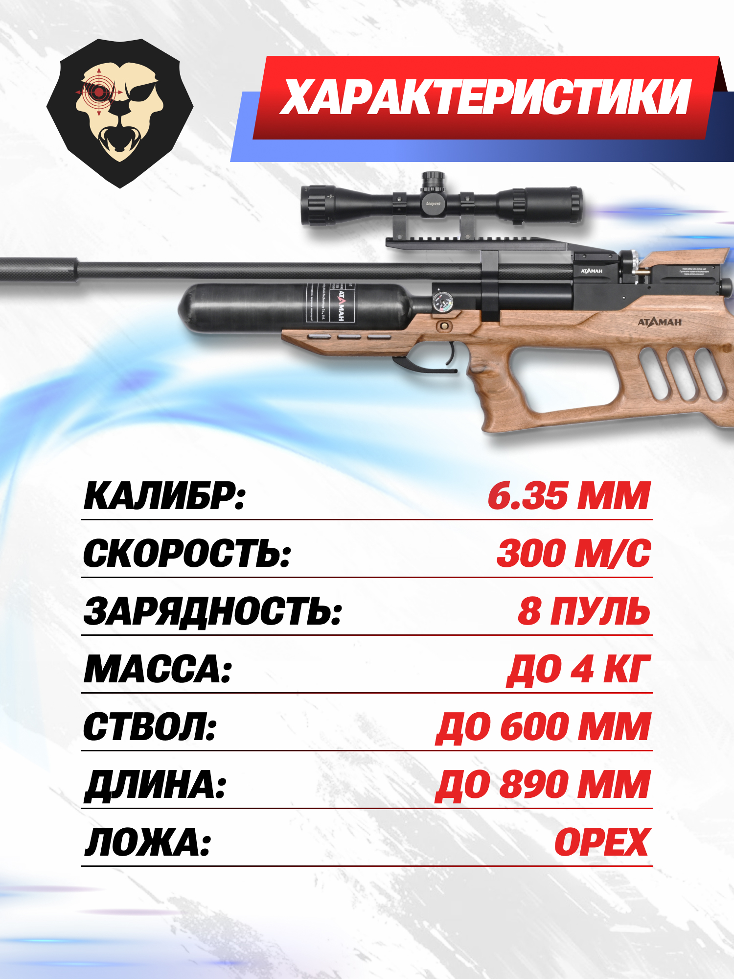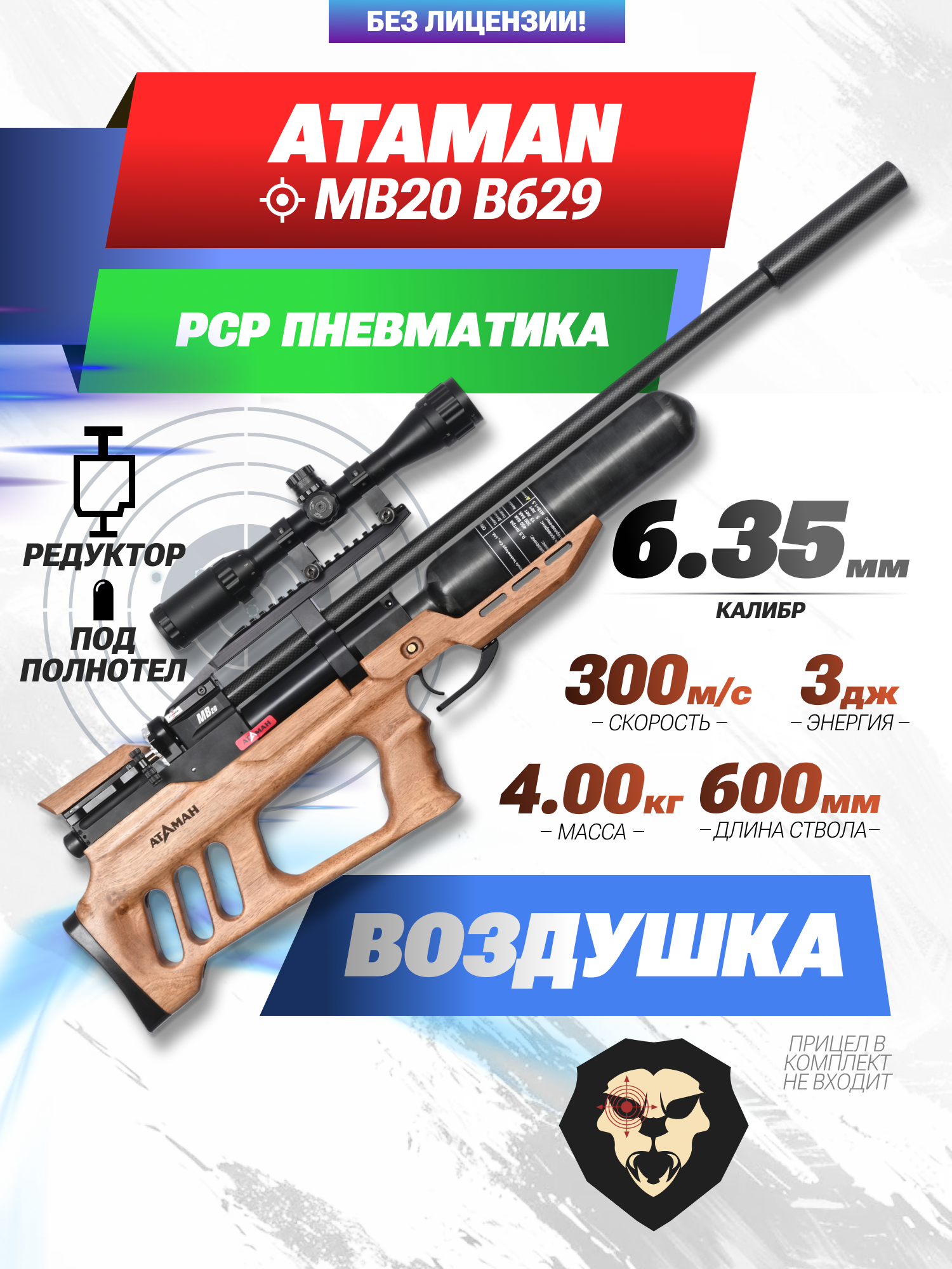 Информация о товаре "Пневматическая винтовка Ataman MB20 B629 6.35 мм (редуктор, под полнотел, колба, орех)" носит ознакомительный характер, и не является публичной офертой, определяемой положениями Статьи 437 Гражданского кодекса Российской Федерации, характеристики, внешний вид, цвет и комплектация могут быть изменены производителем без уведомления.