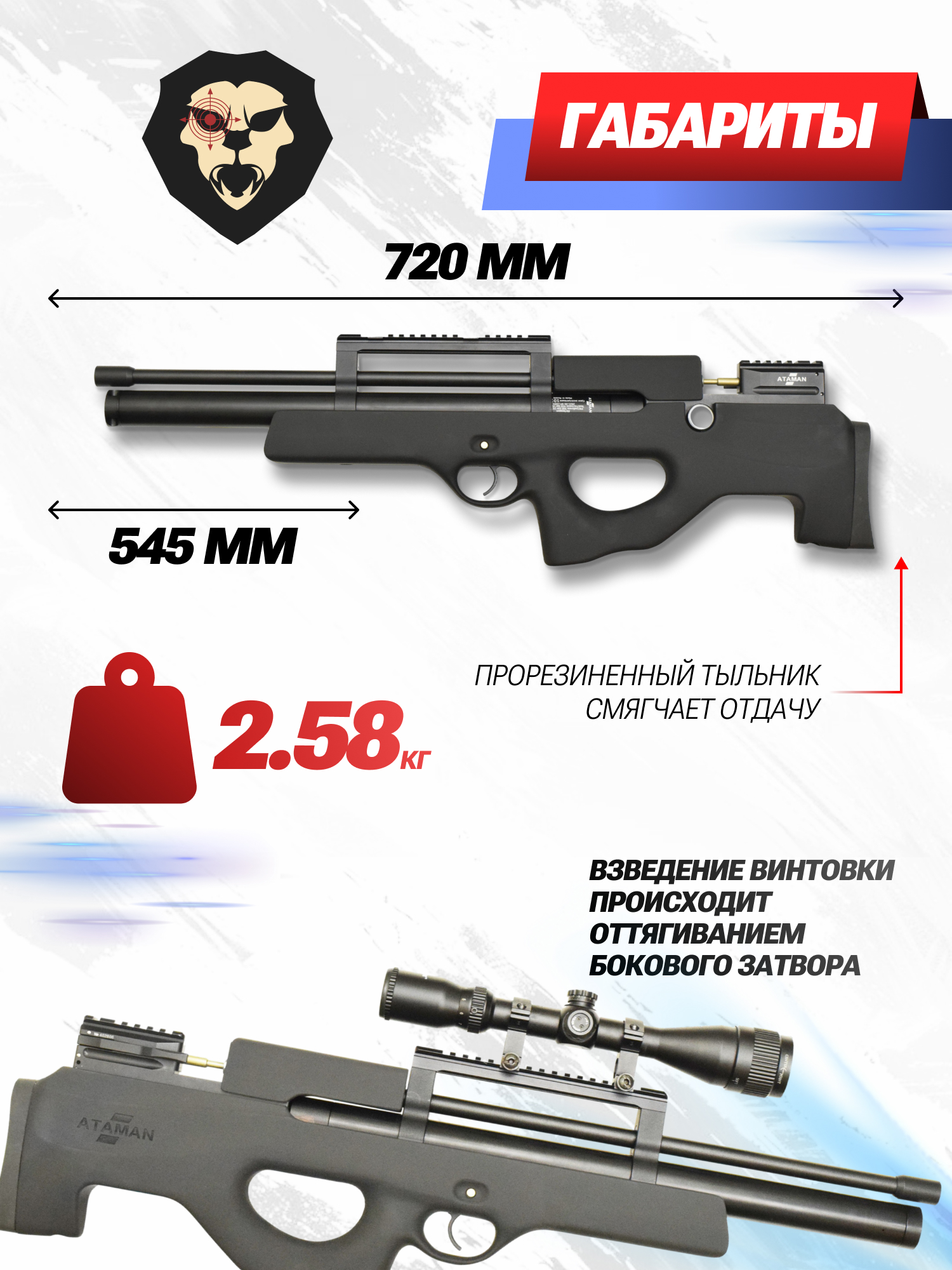 Bull-Pup - это новый взгляд на компоновку и устройство оружия. Особенностью винтовок с таким строением является расположение спускового крючка и пистолетной рукояти, они находятся перед затворной группой и магазином. Малые габариты добавляют мобильности использования оружия в замкнутых пространствах, а также при переноске и хранении. Таким образцом является пневматическая винтовка Атаман МЛ15 Б25 Буллпап РБ-СЛ.