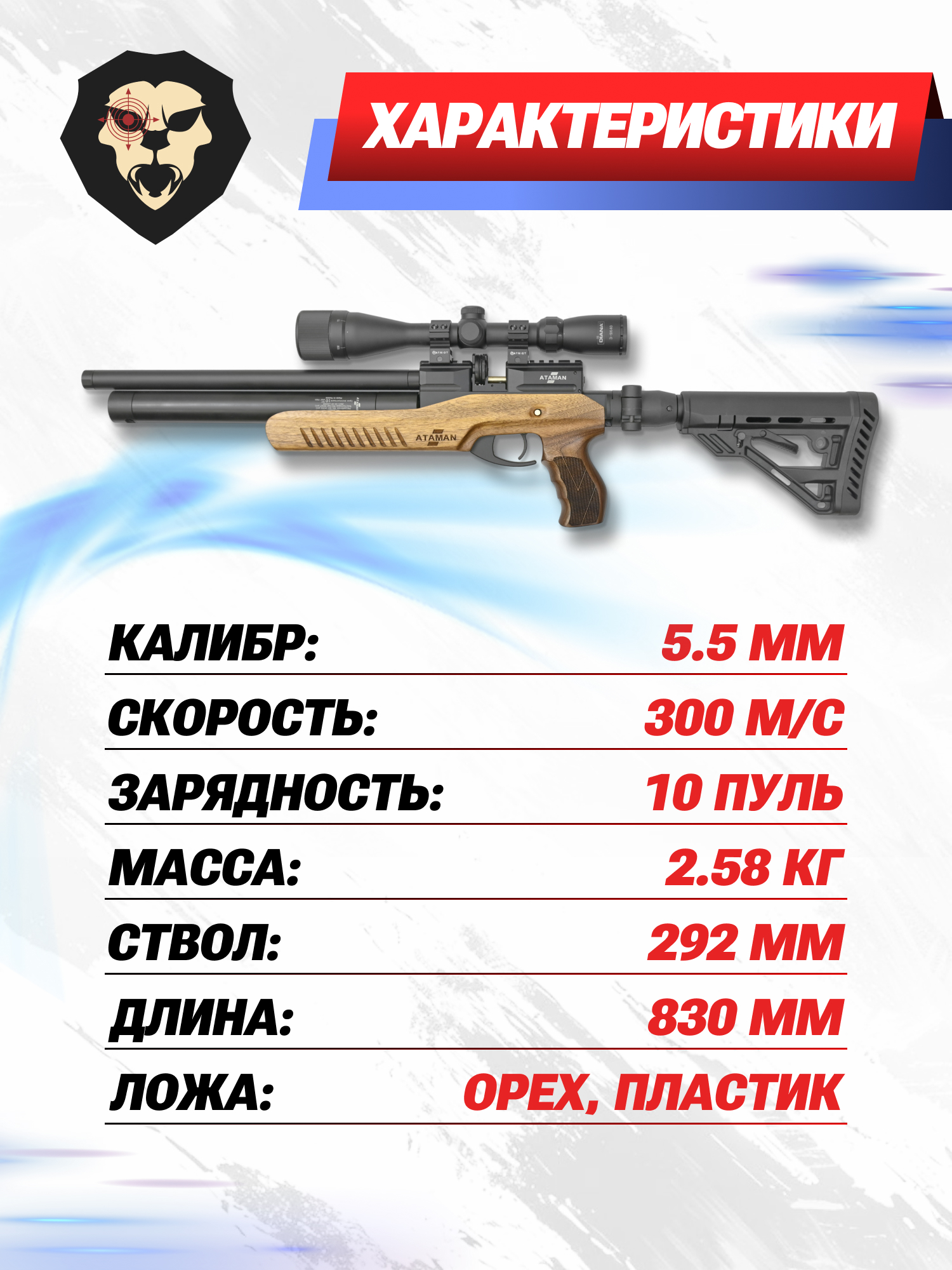Винтовка выполнена в калибре 5.5 мм, а в роли метаемых зарядов выступают стандартные свинцовые пули «воланчиковой» формы. В комплекте с пневматикой изготовитель приложил 10-местный барабан, который выполняет функцию боепитания карабина. Магазин снабжен автоматическим кондуктором поворота, благодаря чему каждый последующий заряд подготавливается к выстрелу при отведении рычага затвора.