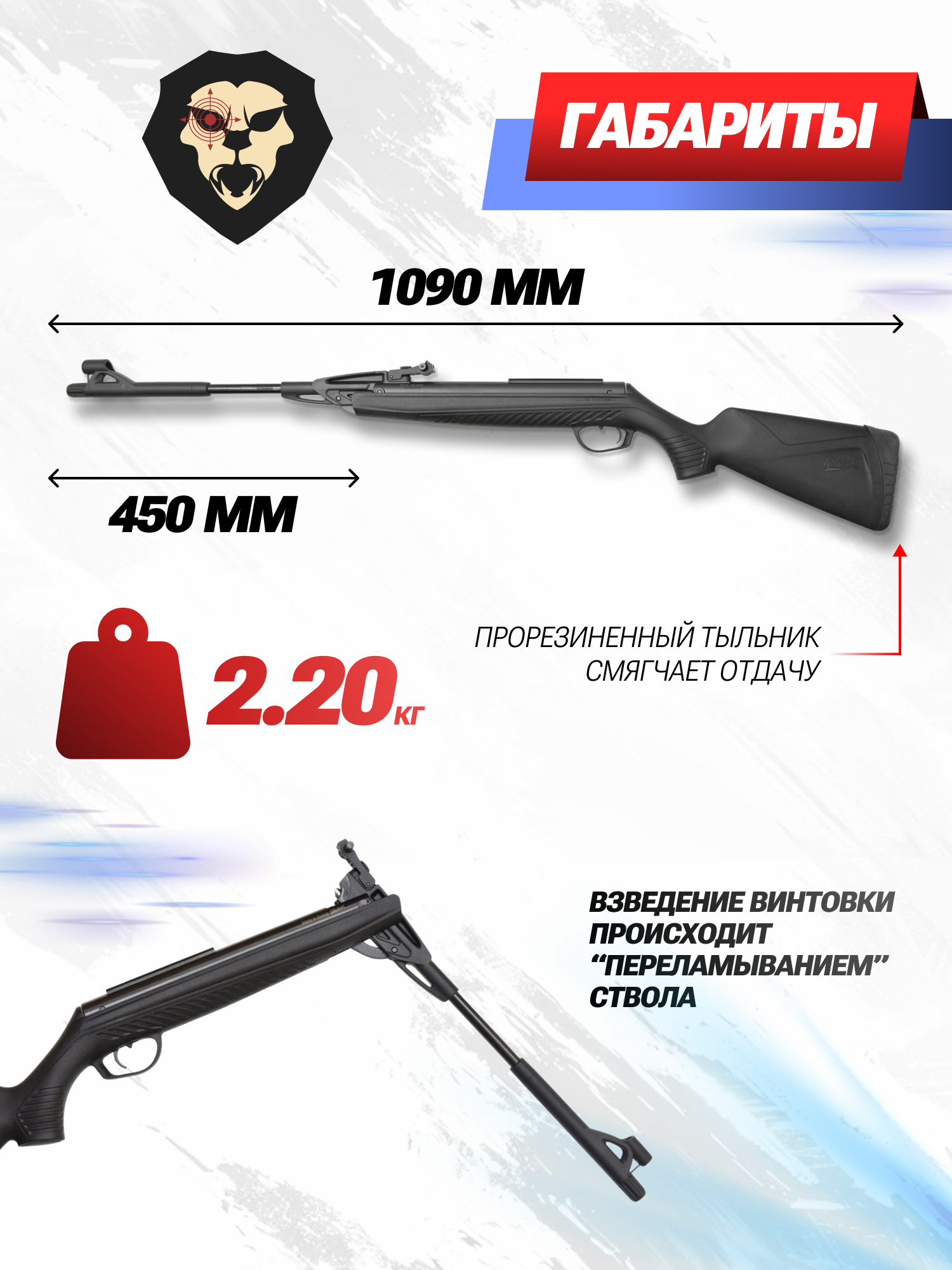 Общий размер образца составляет 1090 мм. «Воздушку» оснастили 45-сантиметровым нарезным стволом - учитывая схему взведения оружия, бланк переламывается у основания. Для этого необходимо приложить усилие со стороны дульной части - присутствие утолщающей накладки способствует удобству удержания второй рукой.