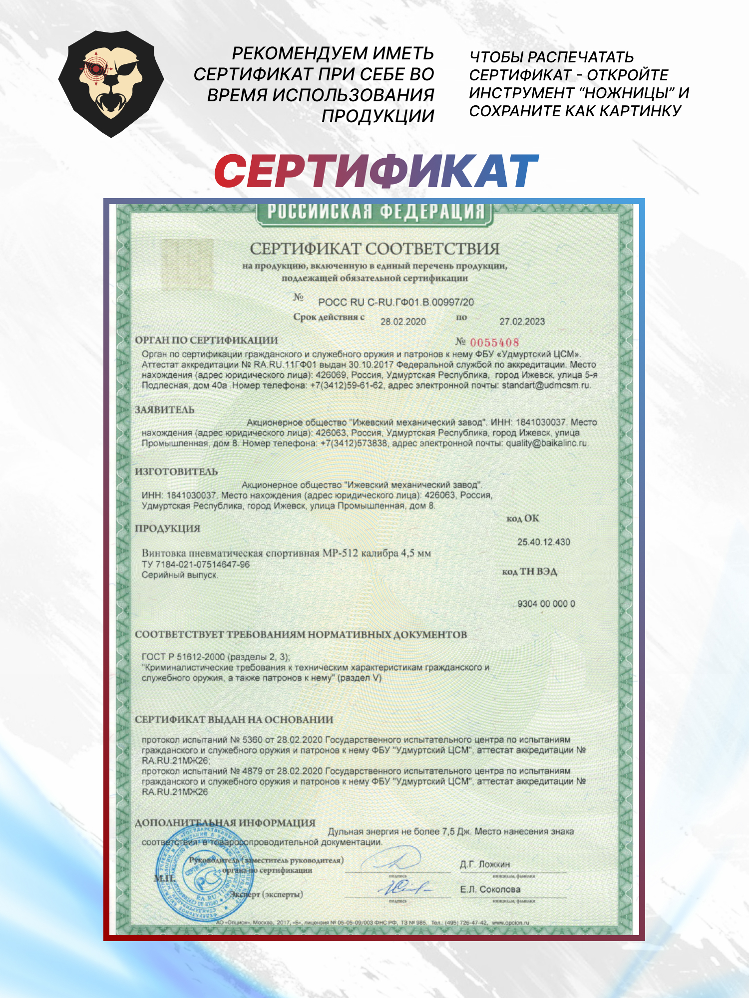 | Комплектация | Винтовка, упаковка, краткая документация, копия сертификата (по запросу покупателя) |