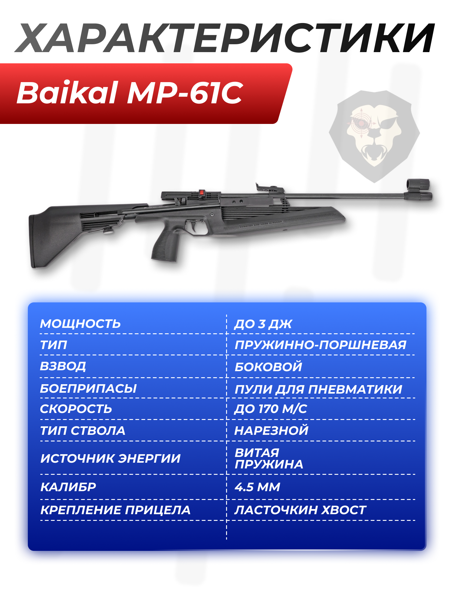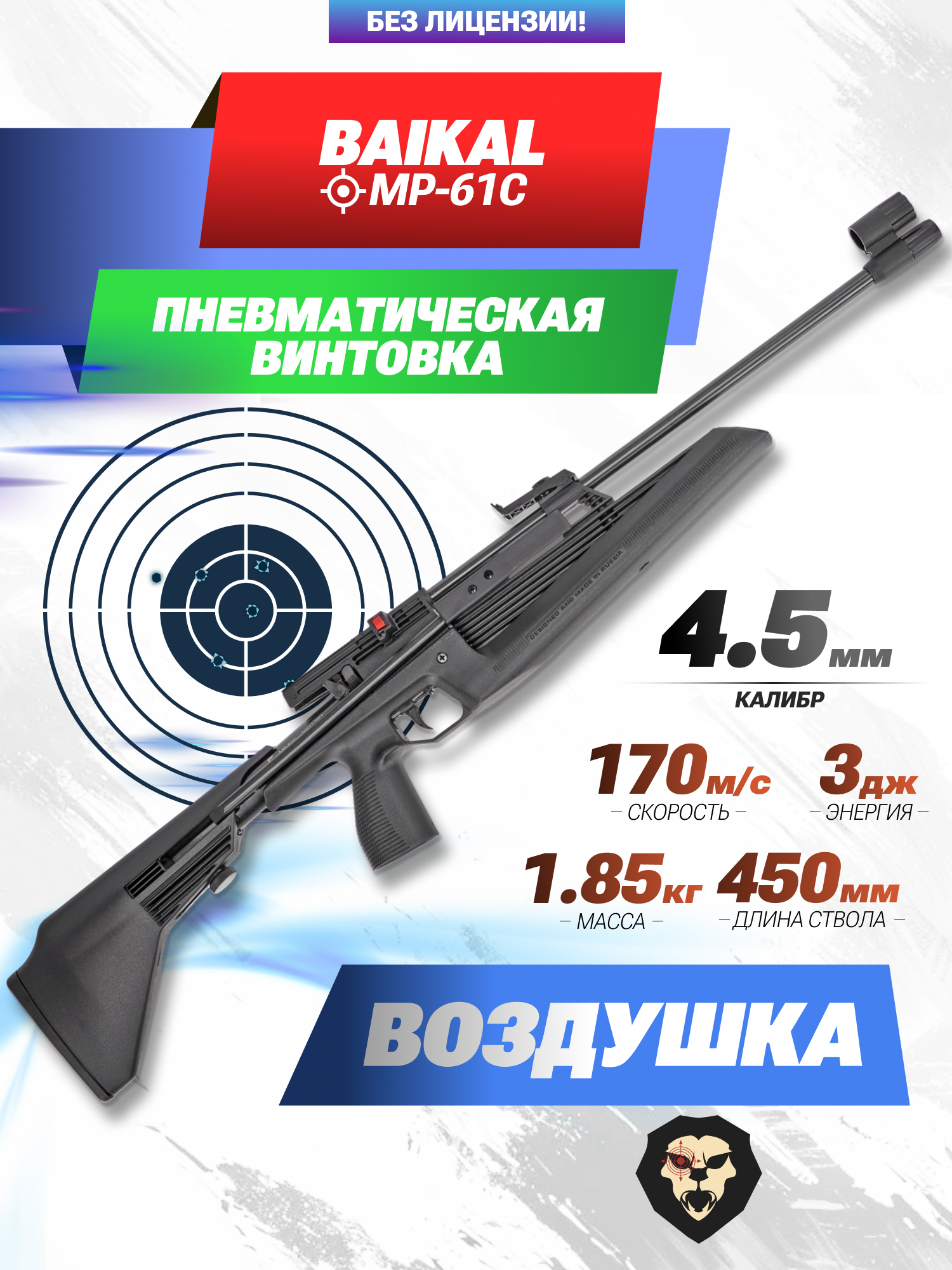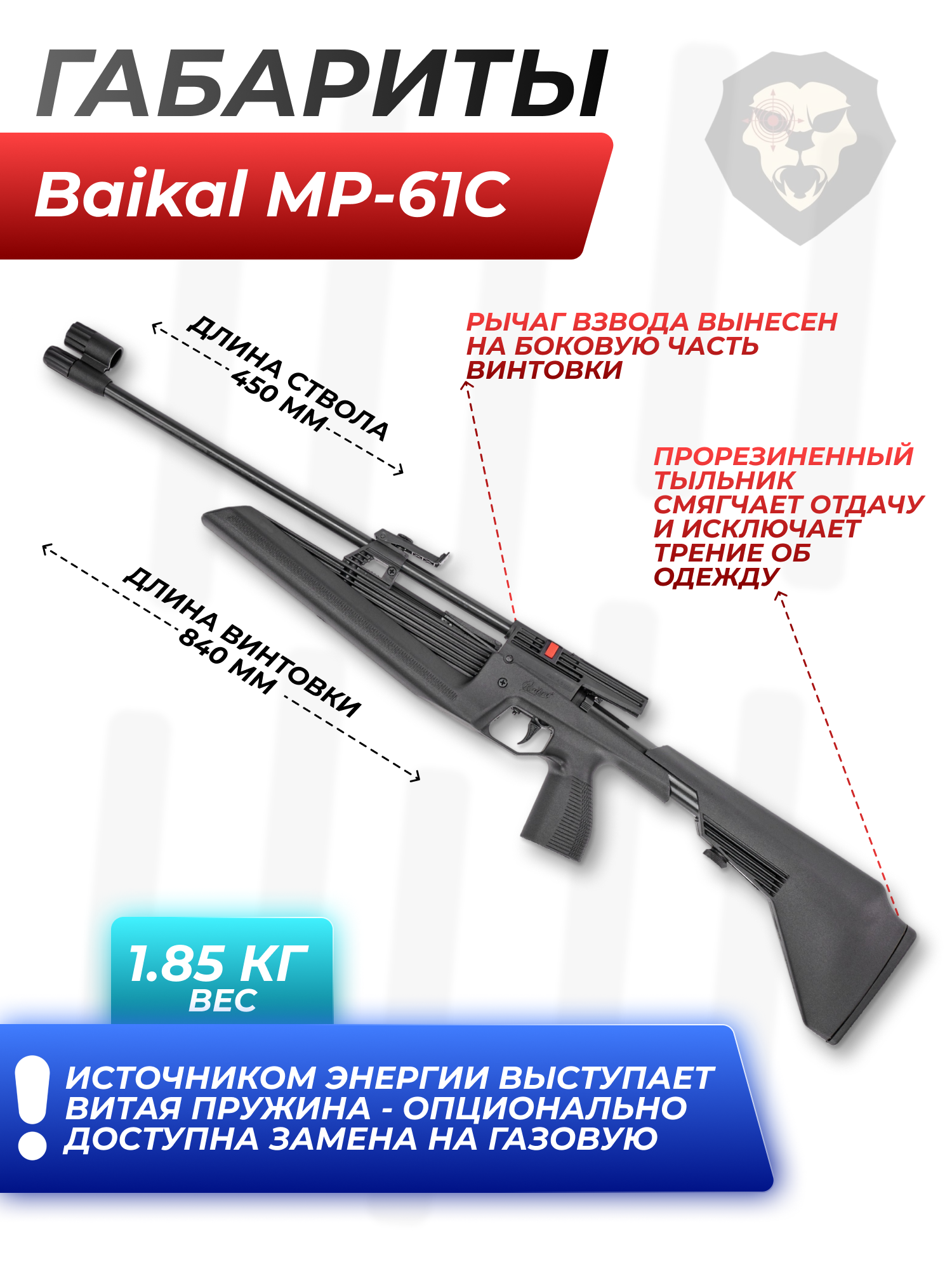 Информация о товаре "Пневматическая винтовка Baikal МР-61С (ИЖ-61С)" носит ознакомительный характер, и не является публичной офертой, определяемой положениями Статьи 437 Гражданского кодекса Российской Федерации, характеристики, внешний вид, цвет и комплектация могут быть изменены производителем без уведомления.