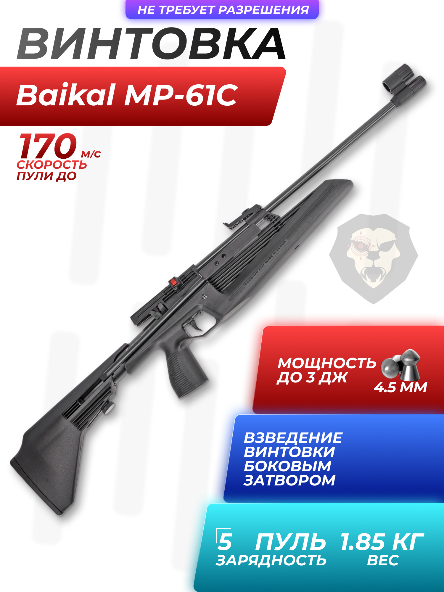 Пневматическая МР 61 в вариации С — модификация стандартной модели со сниженной дульной энергией. Винтовка сертифицирована под 3 Джоуля, что упрощает эксплуатацию с юридической точки зрения. В стандартном виде оружие выдает 160-170 метров в секунду, если использовать пули массой до половины грамма.