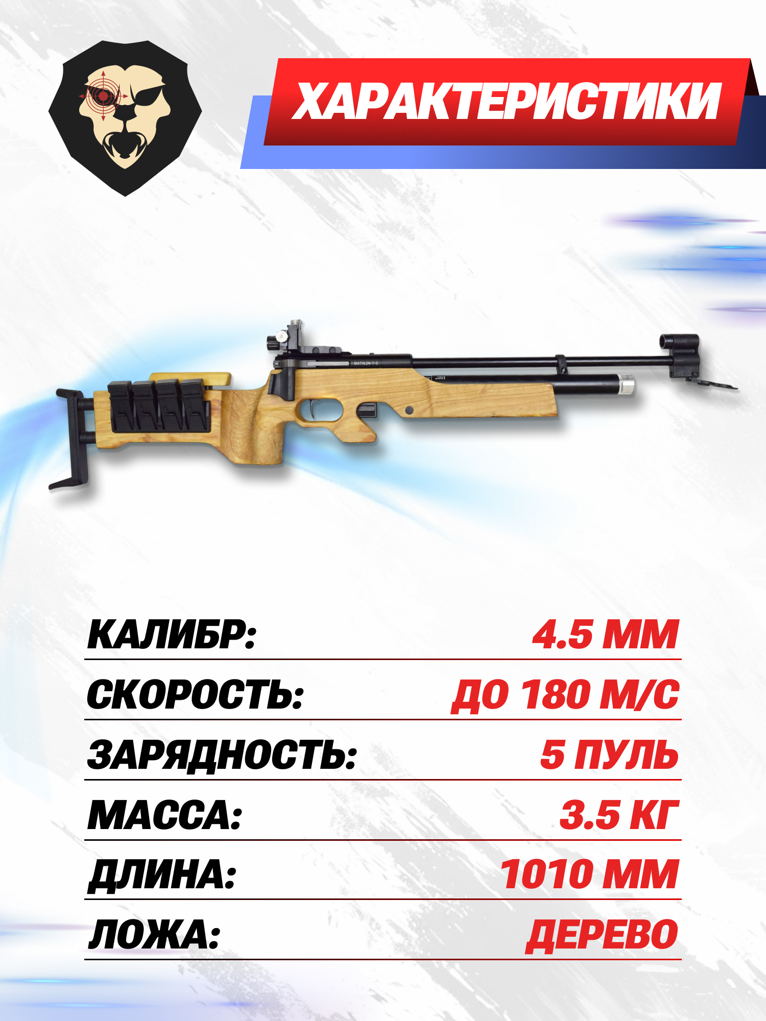 Винтовка отличается высокой точностью и плавностью стрельбы, возможностью точной настройки спускового механизма под удобство любого спортсмена и эргономичным ложе из отшлифованного натурального дерева.