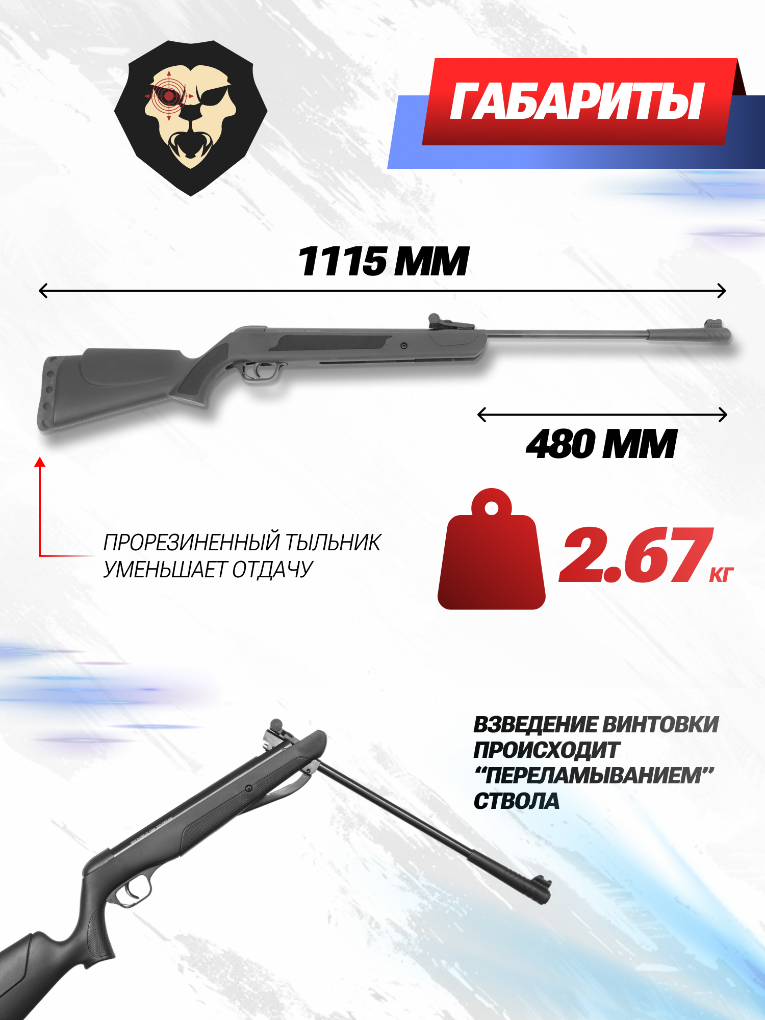 Сам бланк характеризуется длиной 480 миллиметров, тогда как габарит изделия не превышает 1115 мм. Нарезной ствол обеспечивает хорошую кучность боя и рассчитан на использование зарядов .177 калибра. Снаряд досылается в казенник вручную при переламывании винтовки, для чего потребуется обхватить второй рукой дульную часть и направить усилие вниз.