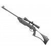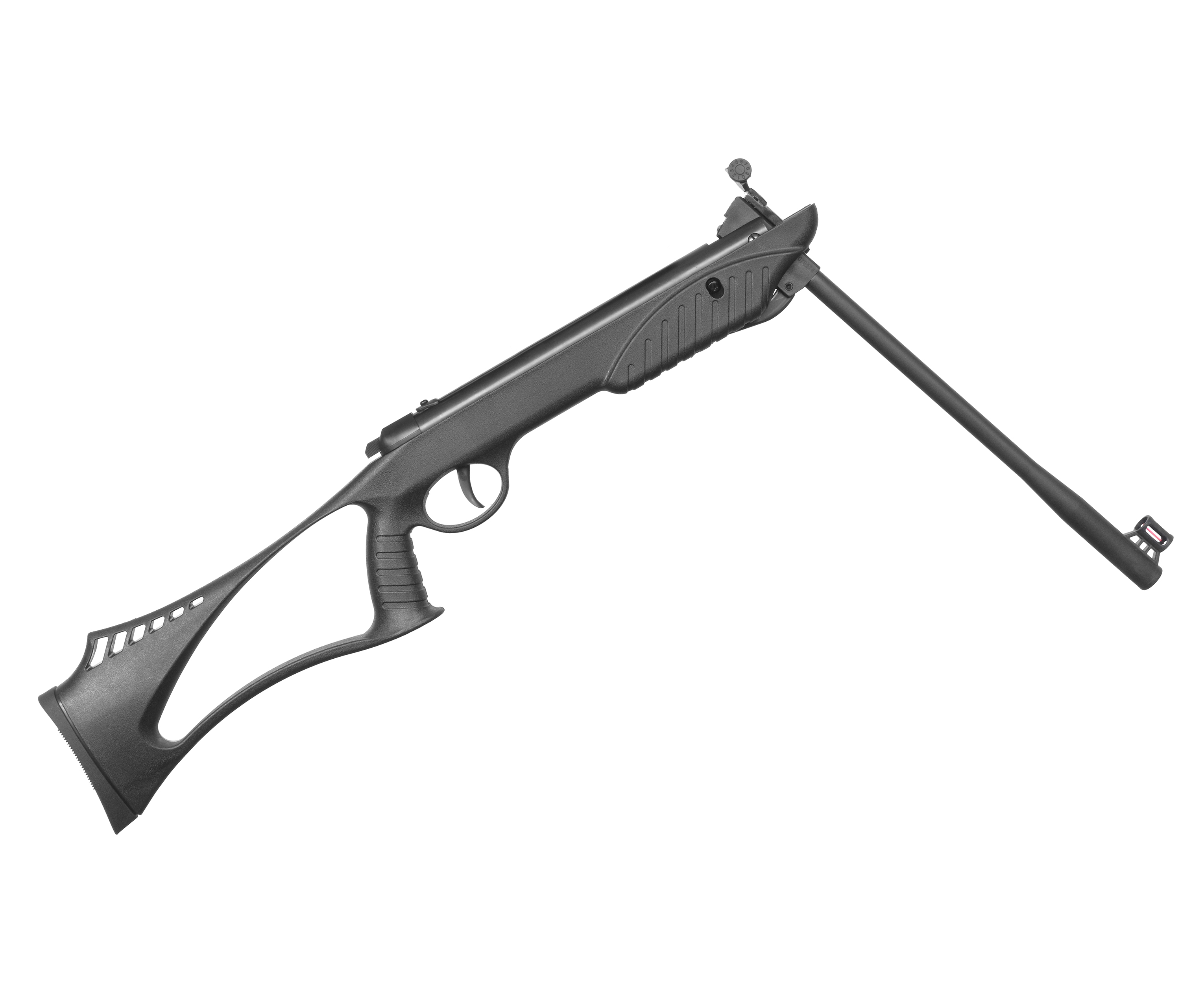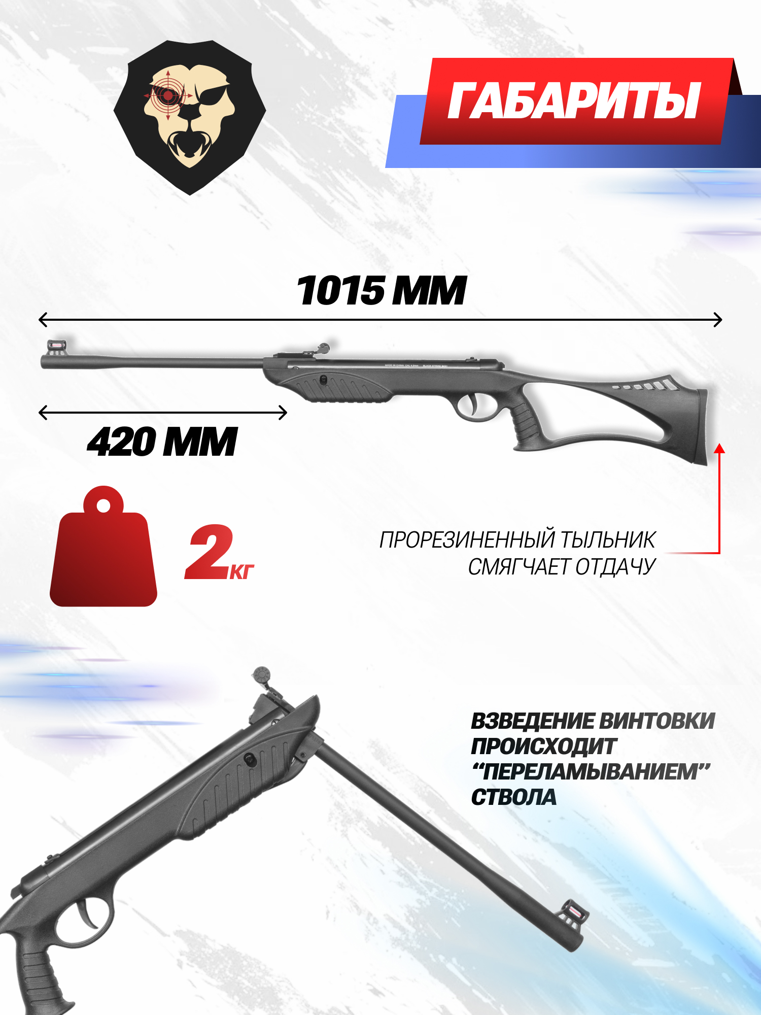 Переломная пневматическая винтовка получилась довольно компактной. Ее габарит не превышает 1015 миллиметров, причем непосредственно на ствол отведено 420 мм. Модель снабдили нарезным бланком, обеспечивающим приемлемую кучность. Стрельба подразумевается воланчиковыми боеприпасами.