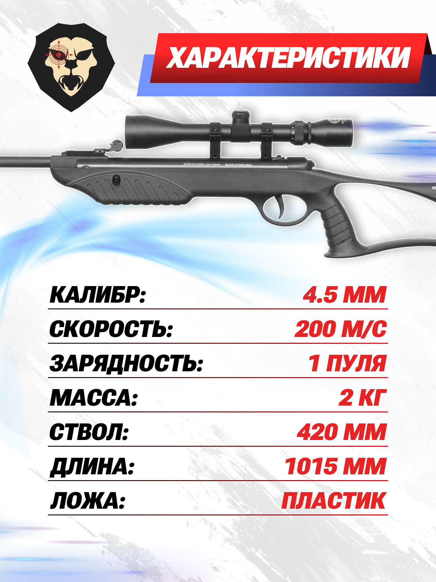 Информация о товаре "Пневматическая винтовка Black Strike B031 4.5 мм (3 Дж, пластик)" носит ознакомительный характер, и не является публичной офертой, определяемой положениями Статьи 437 Гражданского кодекса Российской Федерации, характеристики, внешний вид, цвет и комплектация могут быть изменены производителем без уведомления.