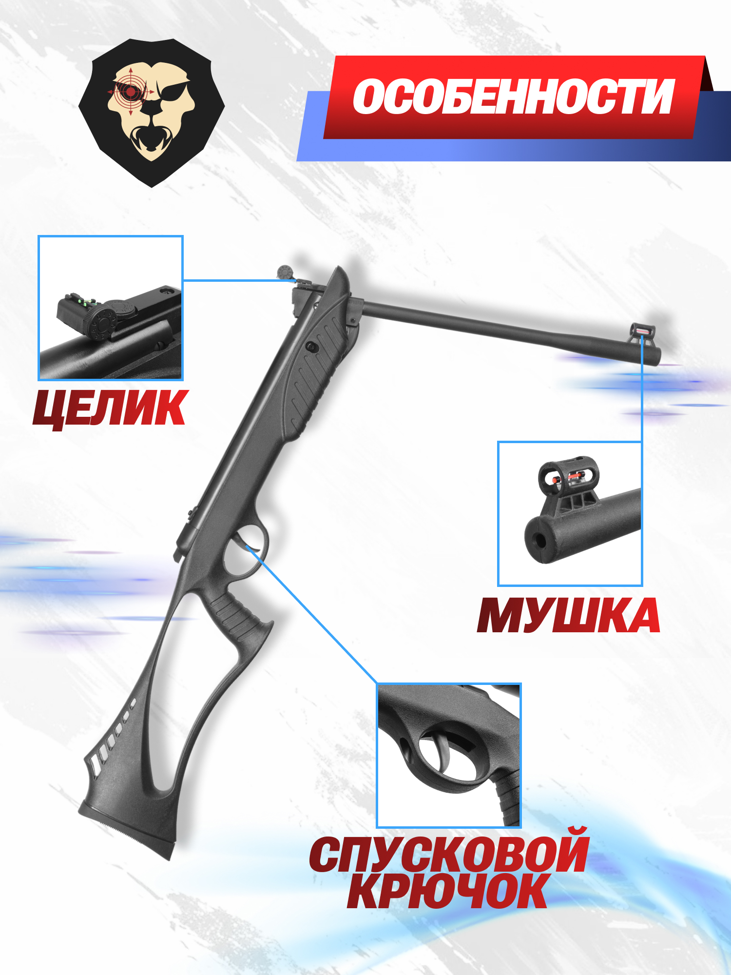 Такой комплект получила надежная качественная винтовка Black Strike B031. Модель относится к пневматике пружинно-поршневого типа - это значит, что для совершения выстрела не нужно предварительно накачивать воздух. Последний сжимается во встроенном небольшом компрессоре под действием витого толкающего элемента.
