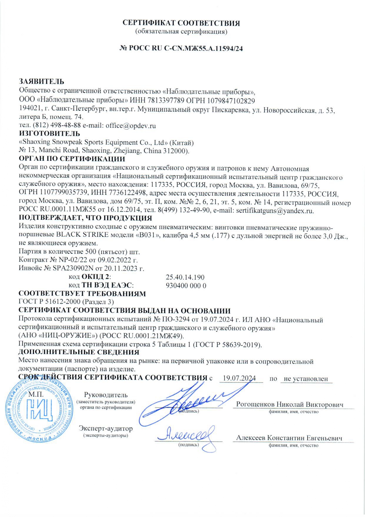Информация о товаре "Пневматическая винтовка Black Strike B031 4.5 мм комплект Hunter №2 подарочный (прицел, кольца, очки, чехол, набор для чистки, мишени, пули)" носит ознакомительный характер, и не является публичной офертой, определяемой положениями Статьи 437 Гражданского кодекса Российской Федерации, характеристики, внешний вид, цвет и комплектация могут быть изменены производителем без уведомления.
