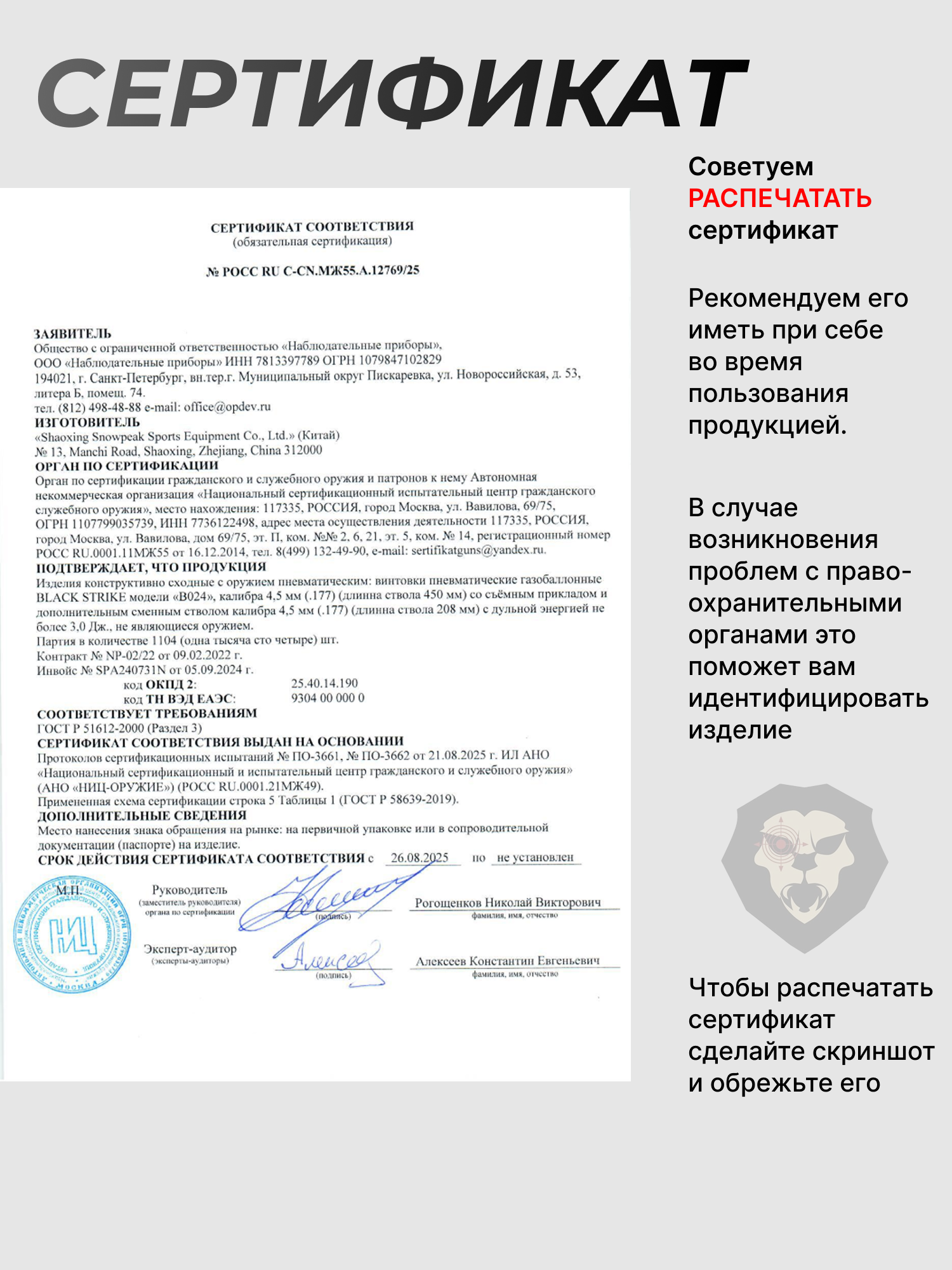Информация о товаре "Пневматическая винтовка Black Strike B024 4.5 мм (два ствола, съемный приклад)" носит ознакомительный характер, и не является публичной офертой, определяемой положениями Статьи 437 Гражданского кодекса Российской Федерации, характеристики, внешний вид, цвет и комплектация могут быть изменены производителем без уведомления.