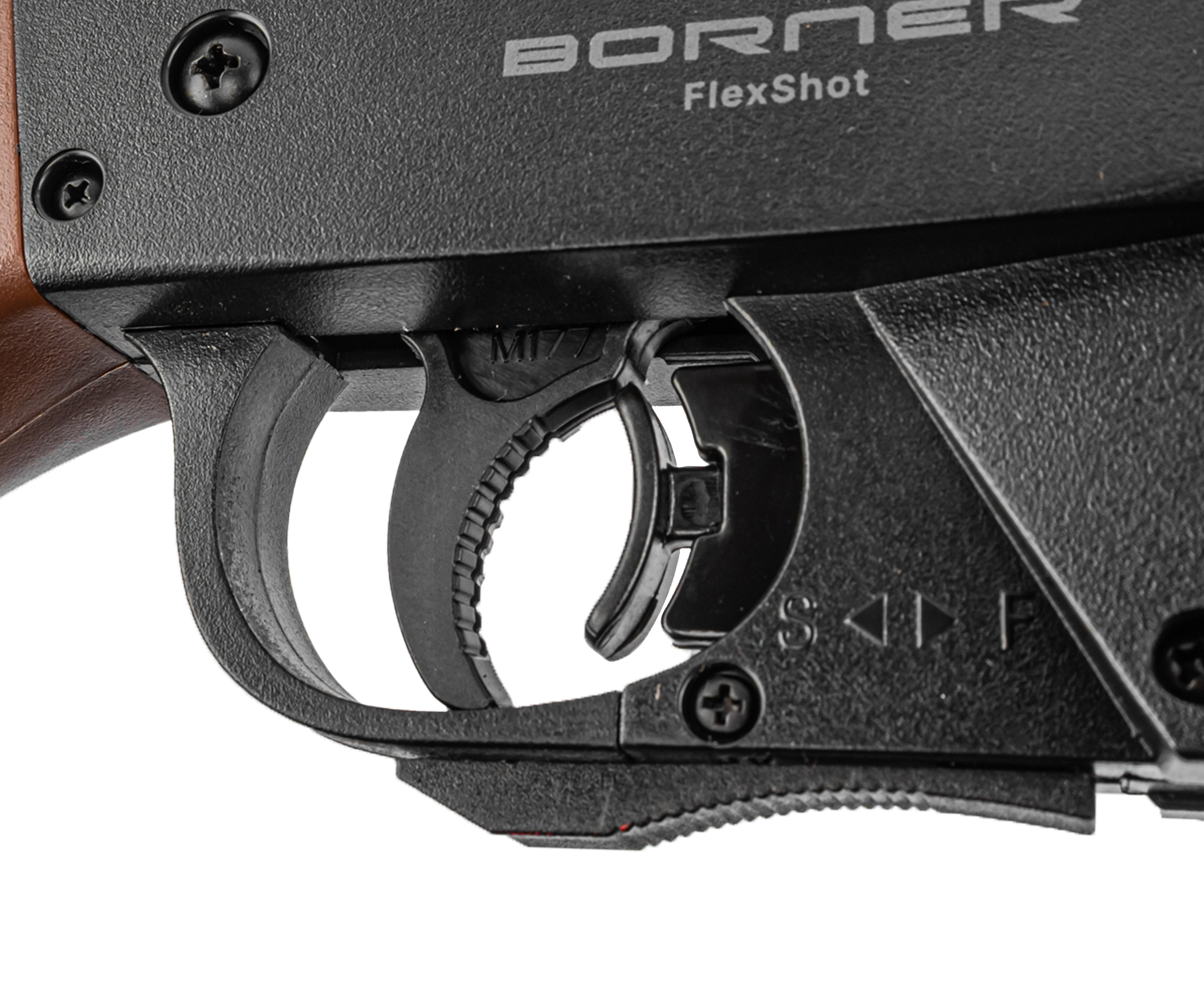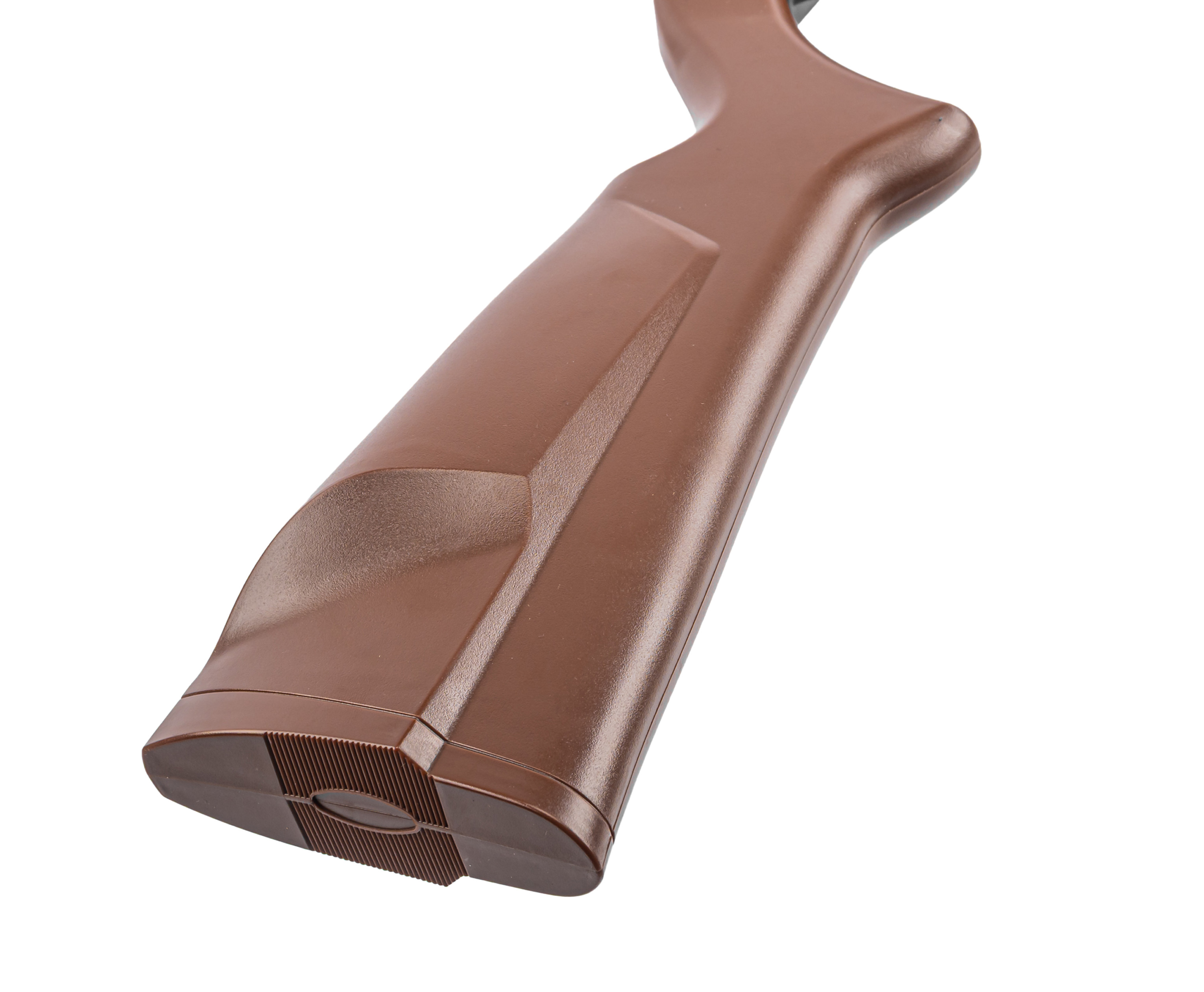 Винтовка Borner Flex Shot Brown получила фурнитуру коричневого оттенка. Применение современного полимера благоприятно повлияло на показатель массы оружия, который остался в пределах 1.55 кг. Таким образом, длительное обращение с карабином не вызывает утомление мышц, что позволяет дольше наслаждаться стрельбой.