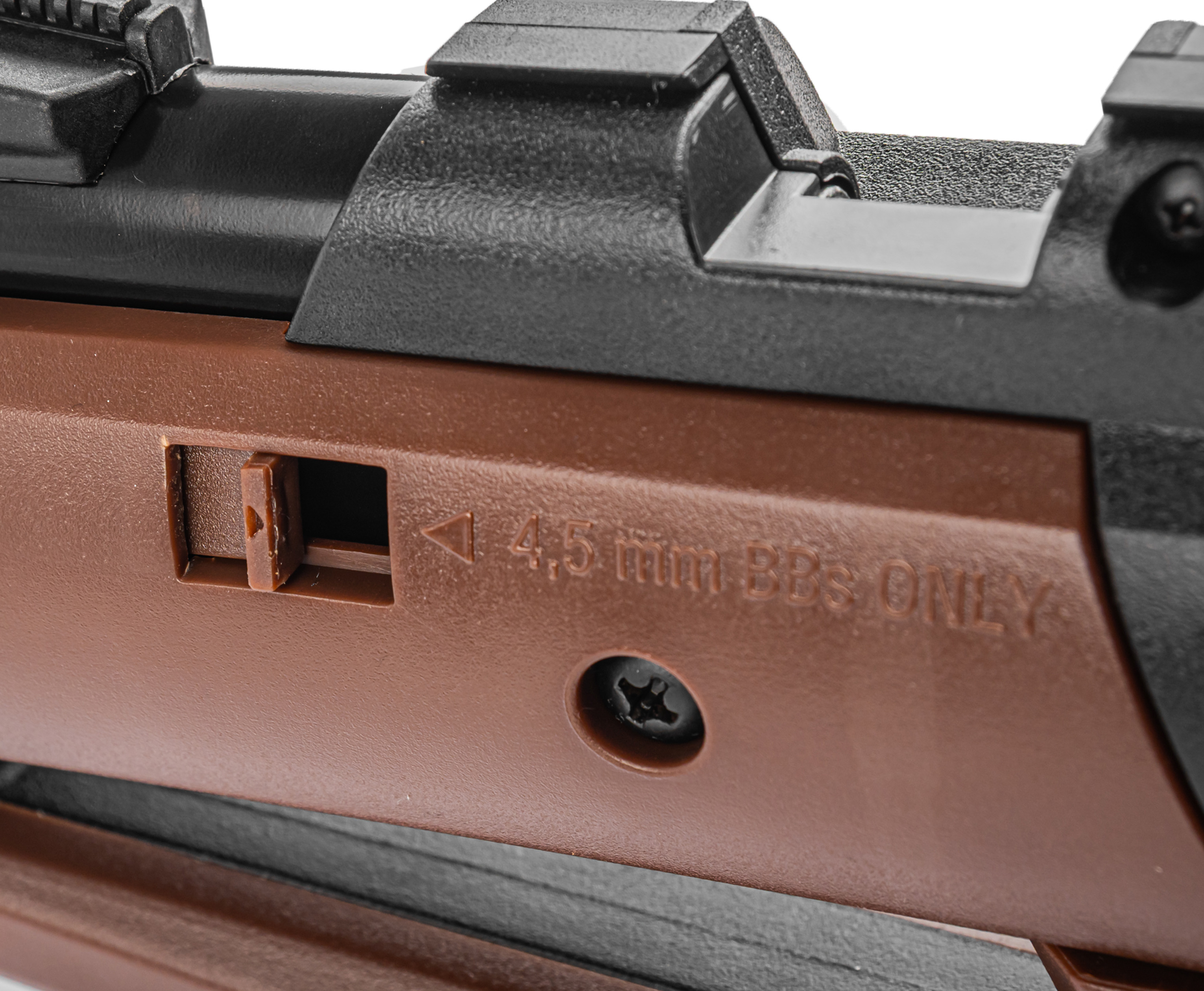 Модель функционирует в одиночном режиме, а в качестве зарядов используются воланчиковые и сферические пули калибром 4.5 мм. Они загружаются во встроенный в ствольную коробку магазин, вмещающий до 60 шариков BB. Досылание снаряда из накопителя в казенник происходит в момент взведения рычага затвора.