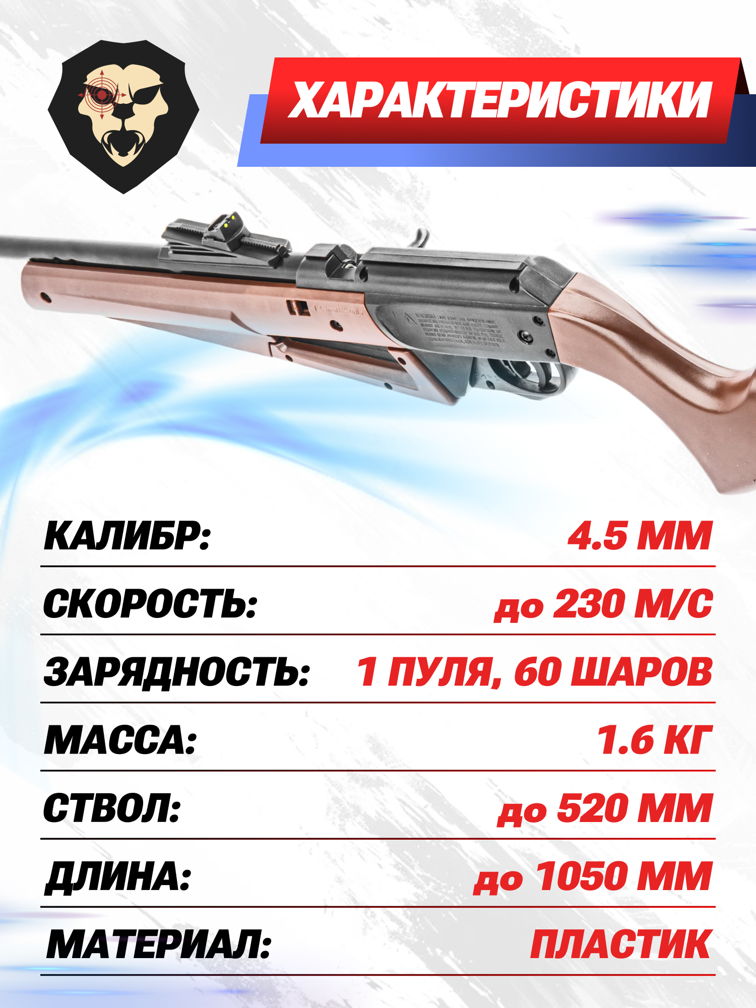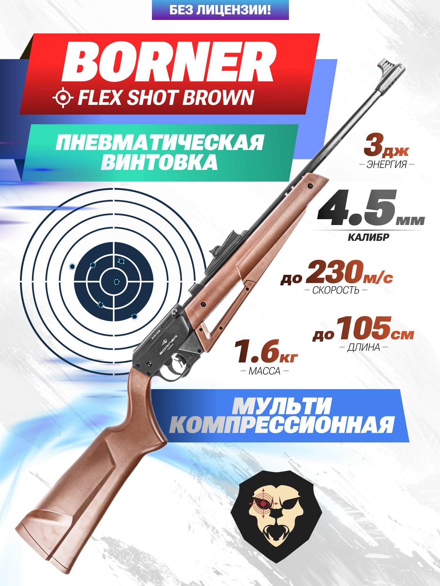 Информация о товаре "Пневматическая винтовка Borner Flex Shot Brown 4.5 мм (3 Дж, коричневый, multi-pump)" носит ознакомительный характер, и не является публичной офертой, определяемой положениями Статьи 437 Гражданского кодекса Российской Федерации, характеристики, внешний вид, цвет и комплектация могут быть изменены производителем без уведомления.