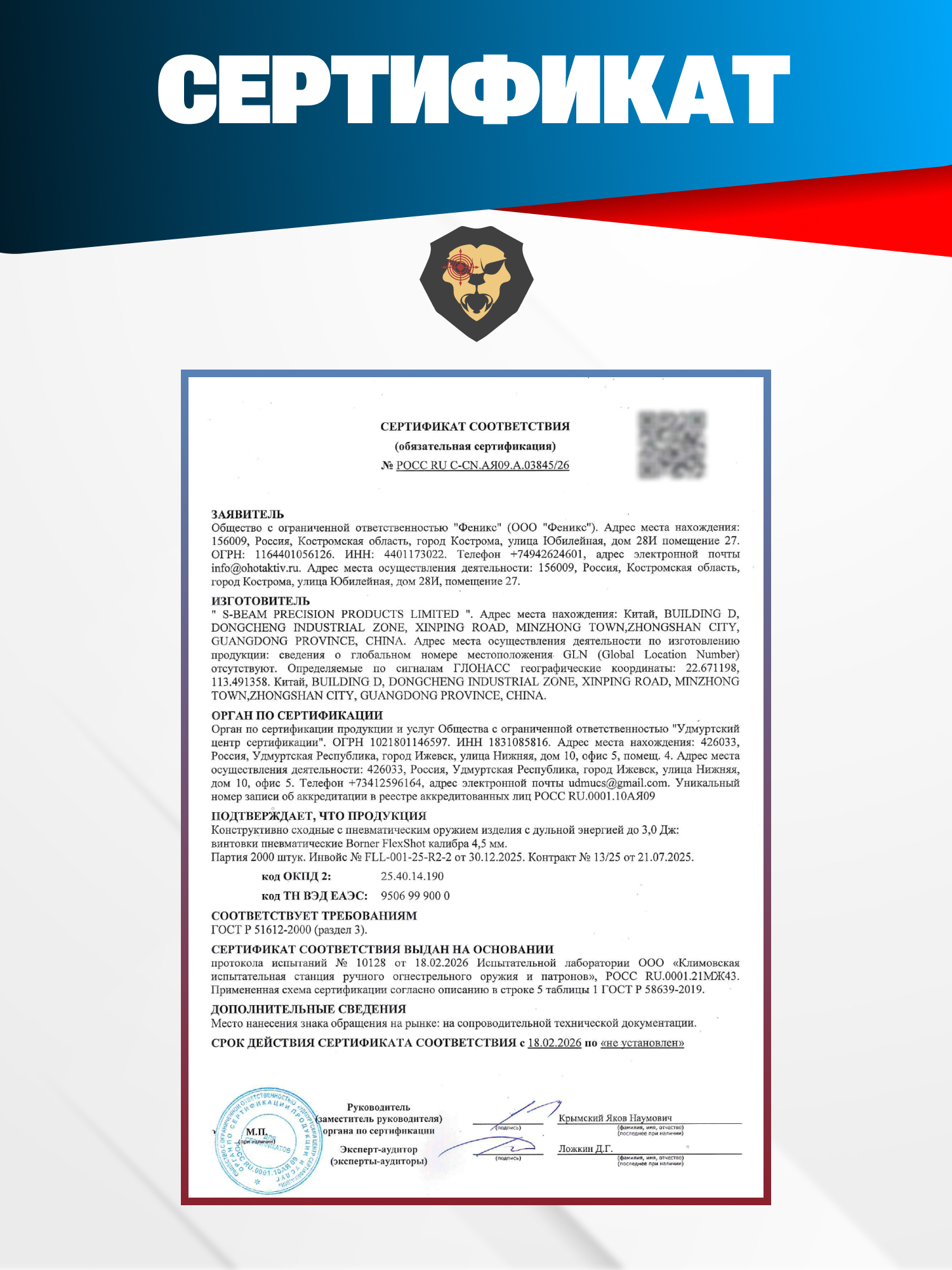 Важно отметить, что вся предназначенная для реализации в РФ продукция фирмы Borner сертифицируется как пневматика 3 Дж. Таким образом, в состоянии «из коробки» она не требует получения лицензии. Приобрести модель смогут все совершеннолетние граждане без дополнительных ограничений.