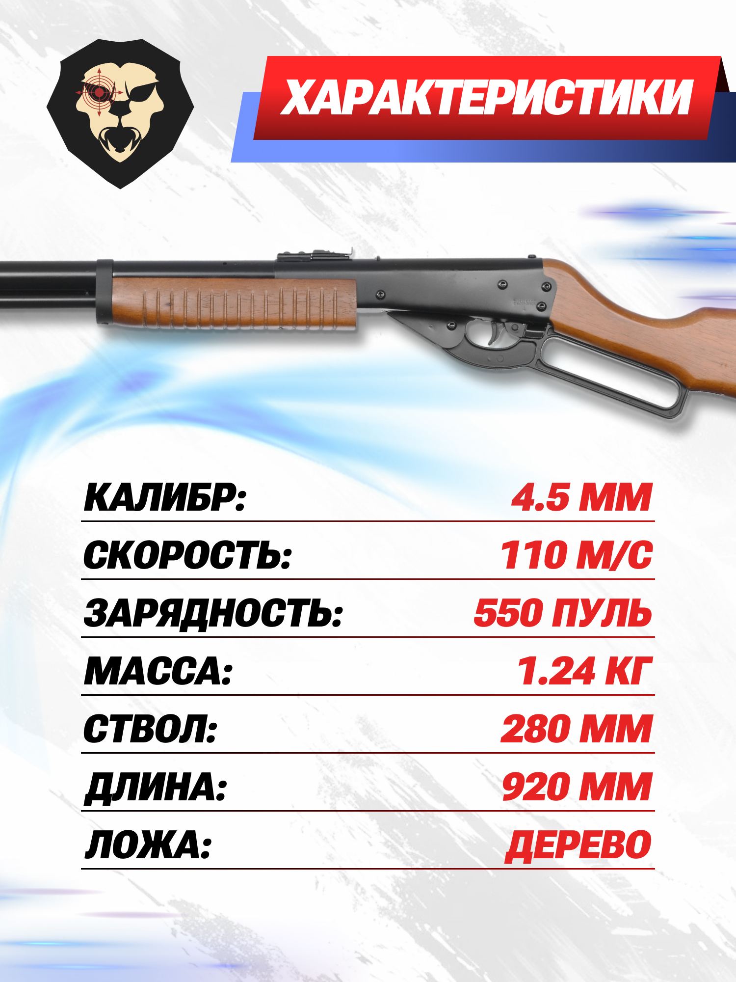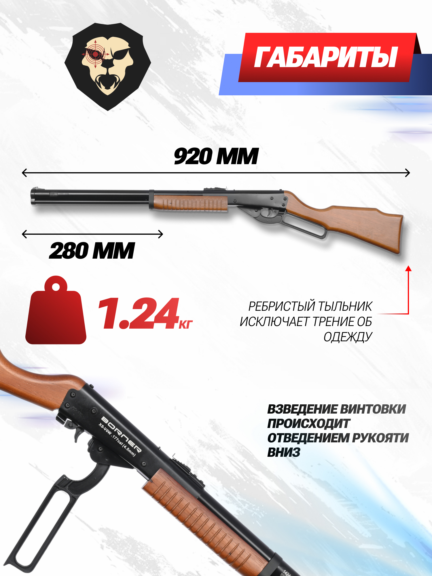 Информация о товаре "Пневматическая винтовка Borner Lever Action 4.5 мм (скоба Генри, дерево, 3 Дж, XSV0W02)" носит ознакомительный характер, и не является публичной офертой, определяемой положениями Статьи 437 Гражданского кодекса Российской Федерации, характеристики, внешний вид, цвет и комплектация могут быть изменены производителем без уведомления.