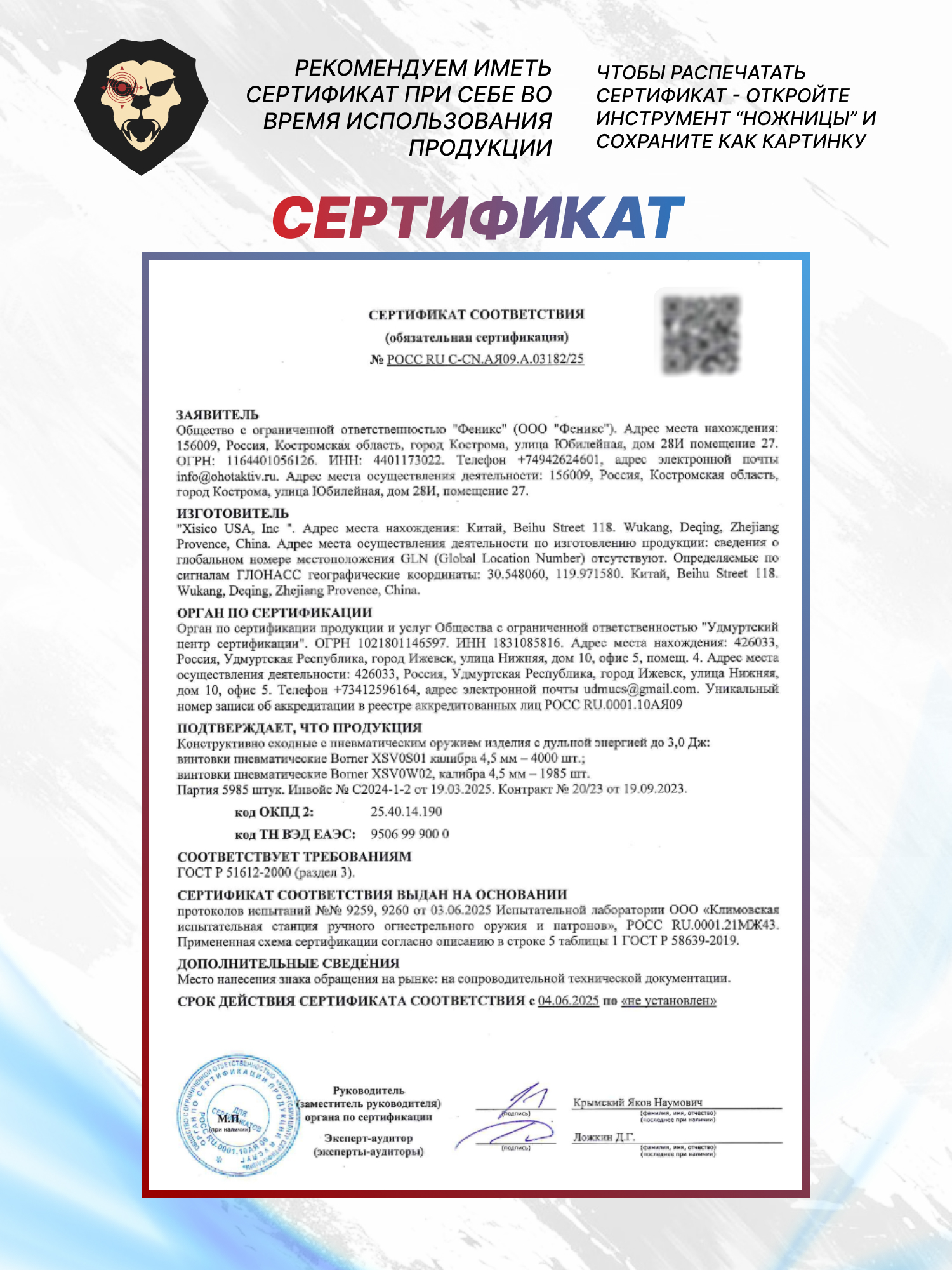| Комплектация | Винтовка, упаковка, краткая документация, копия сертификата (по запросу покупателя) |