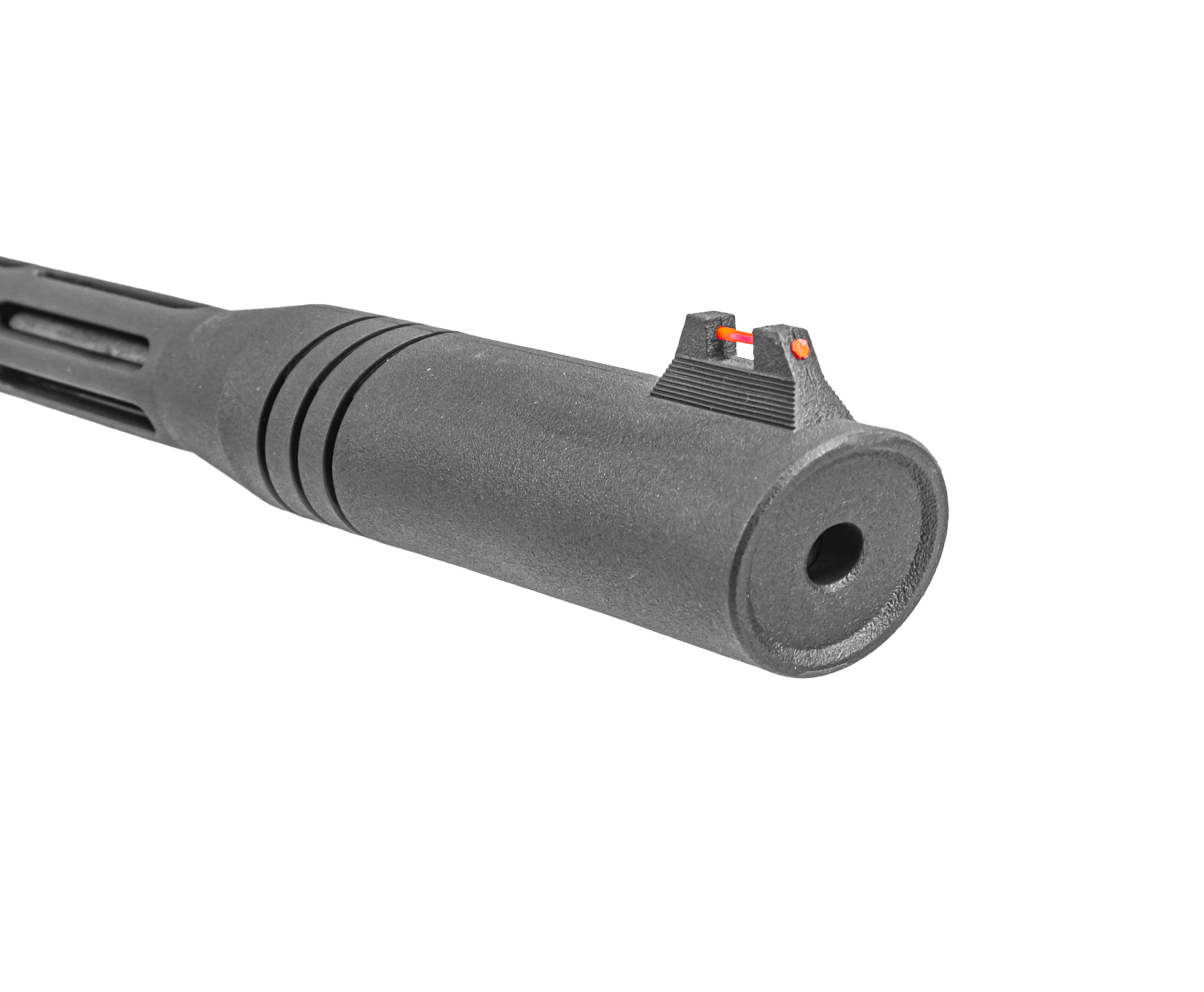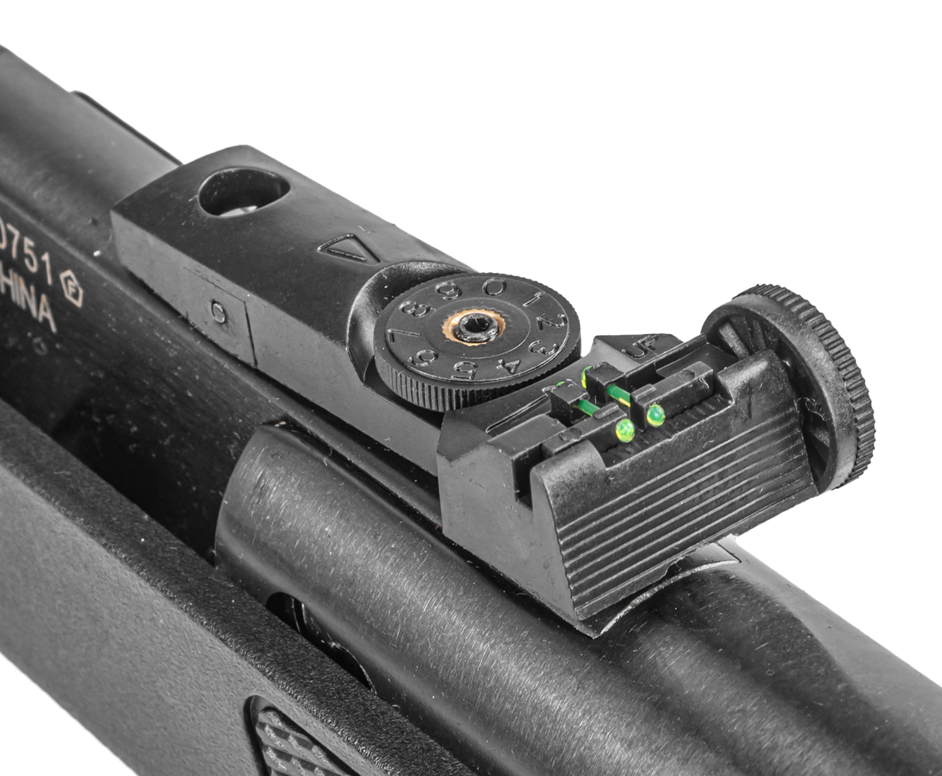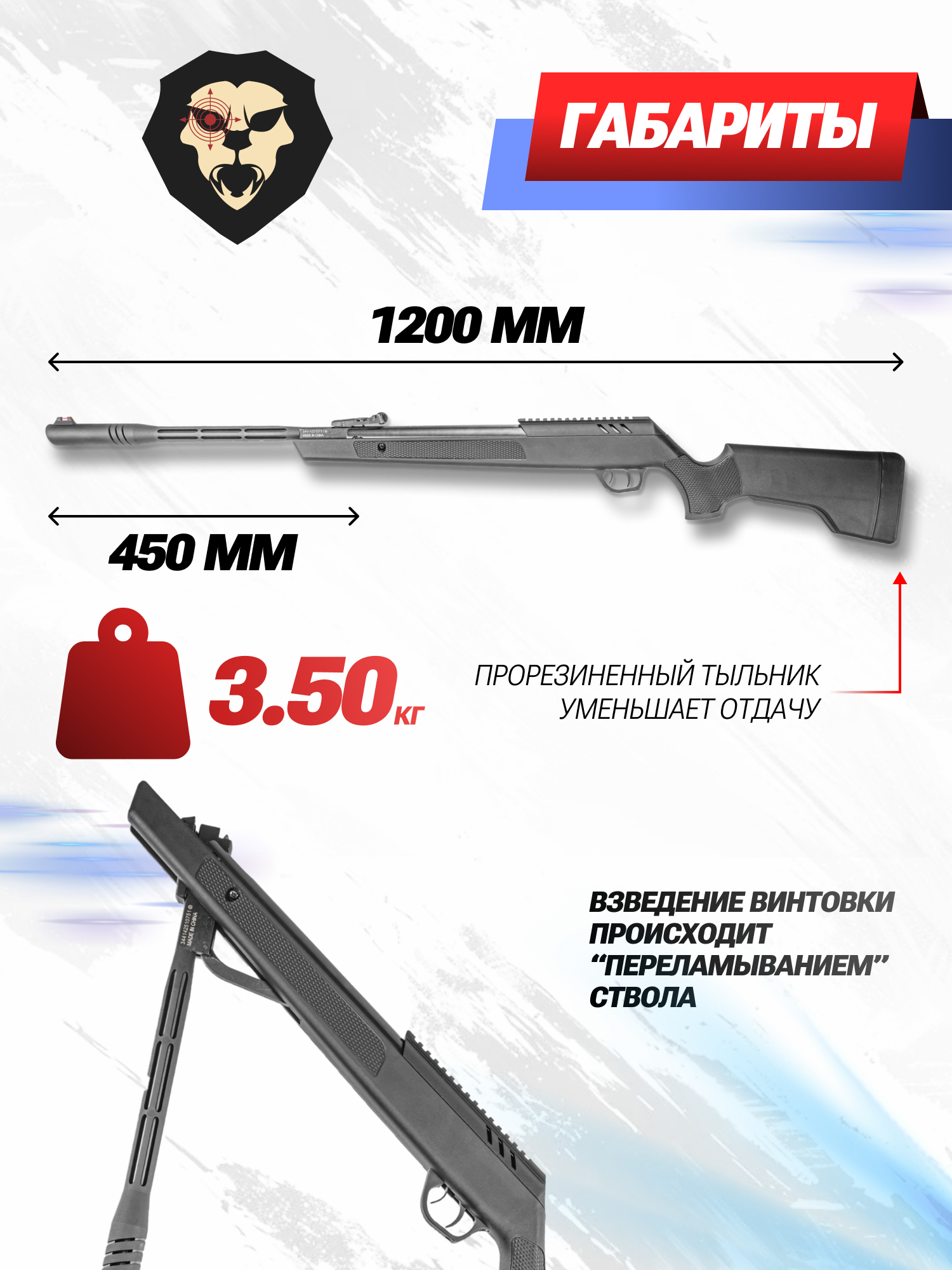 В то же время размер изделия составляет 120 сантиметров. Пневматика выполнена в классической компоновке и характеризуется наличием амбидекстрального приклада с резиновым тыльником. Вкупе это создает условия для корректной вкладки не только для правши, но и левши, а также исключает скольжение при упоре в плечо.