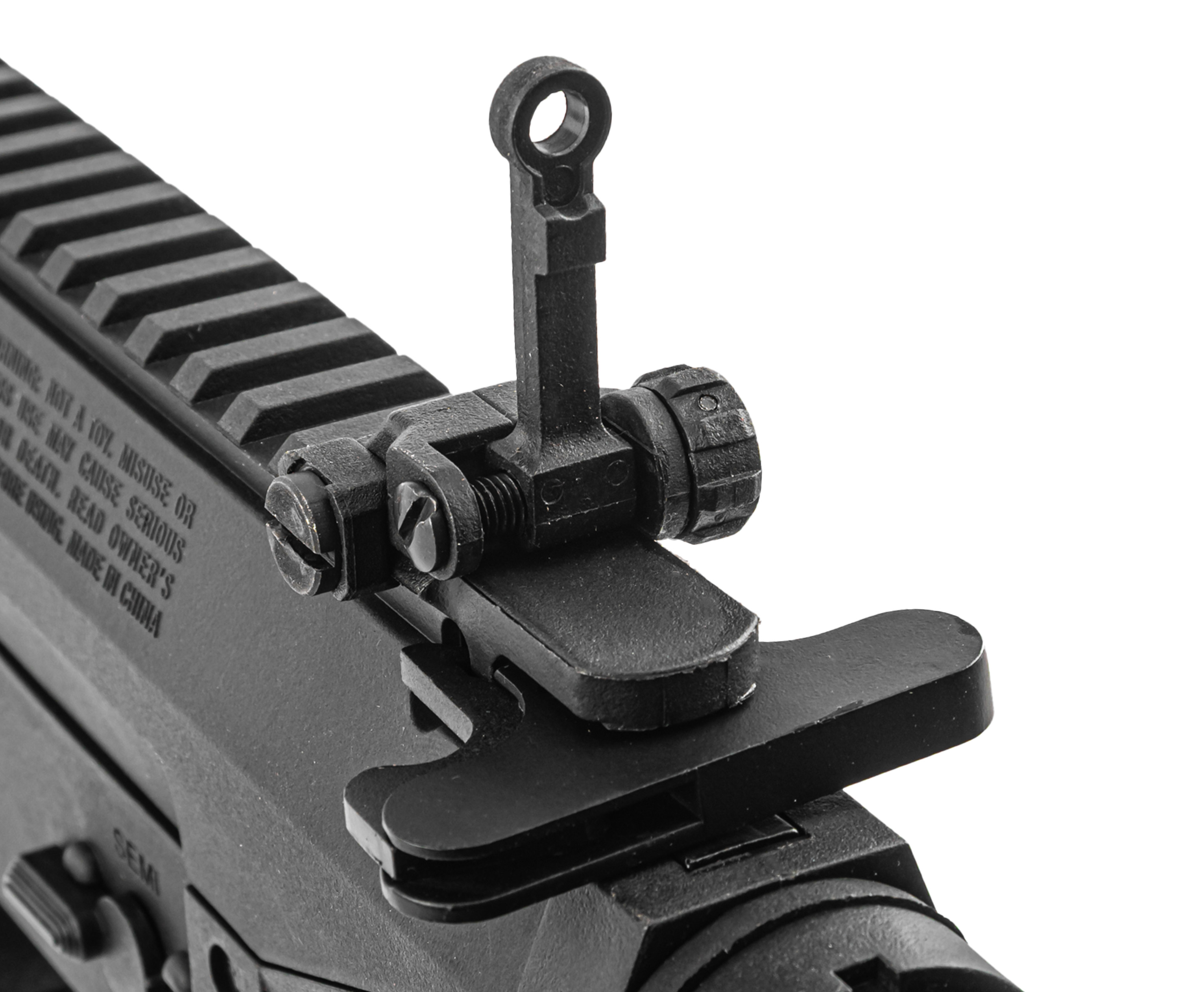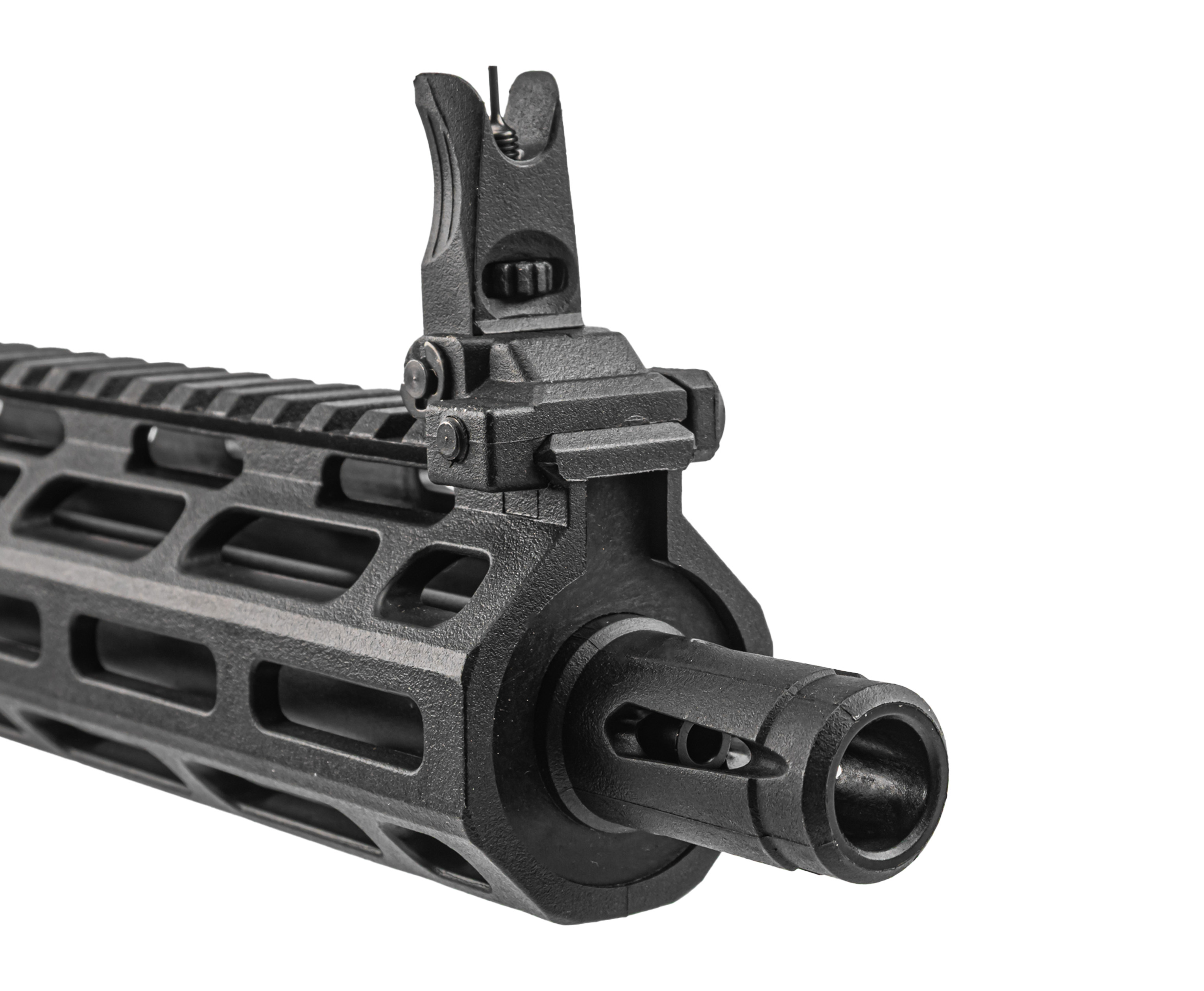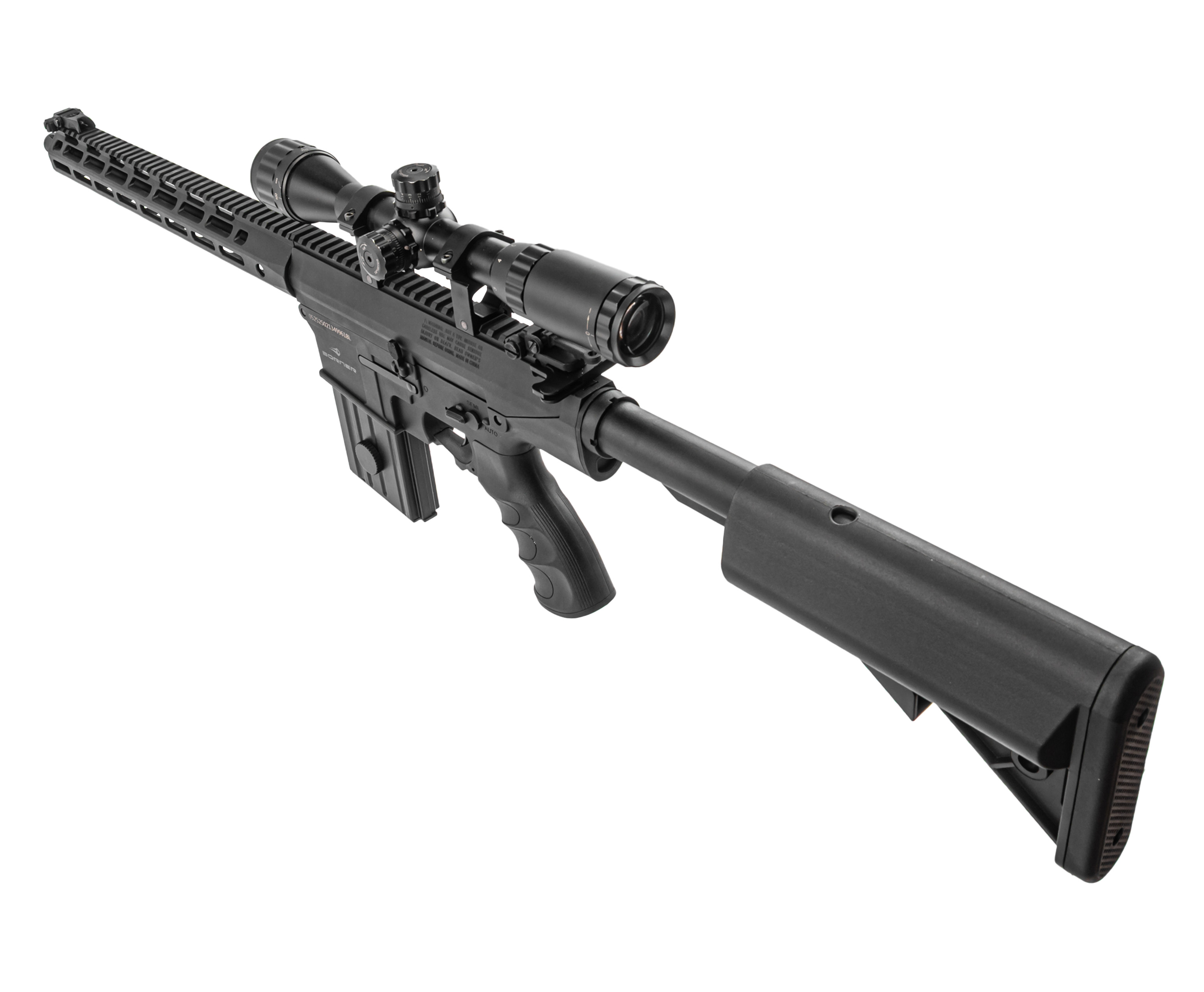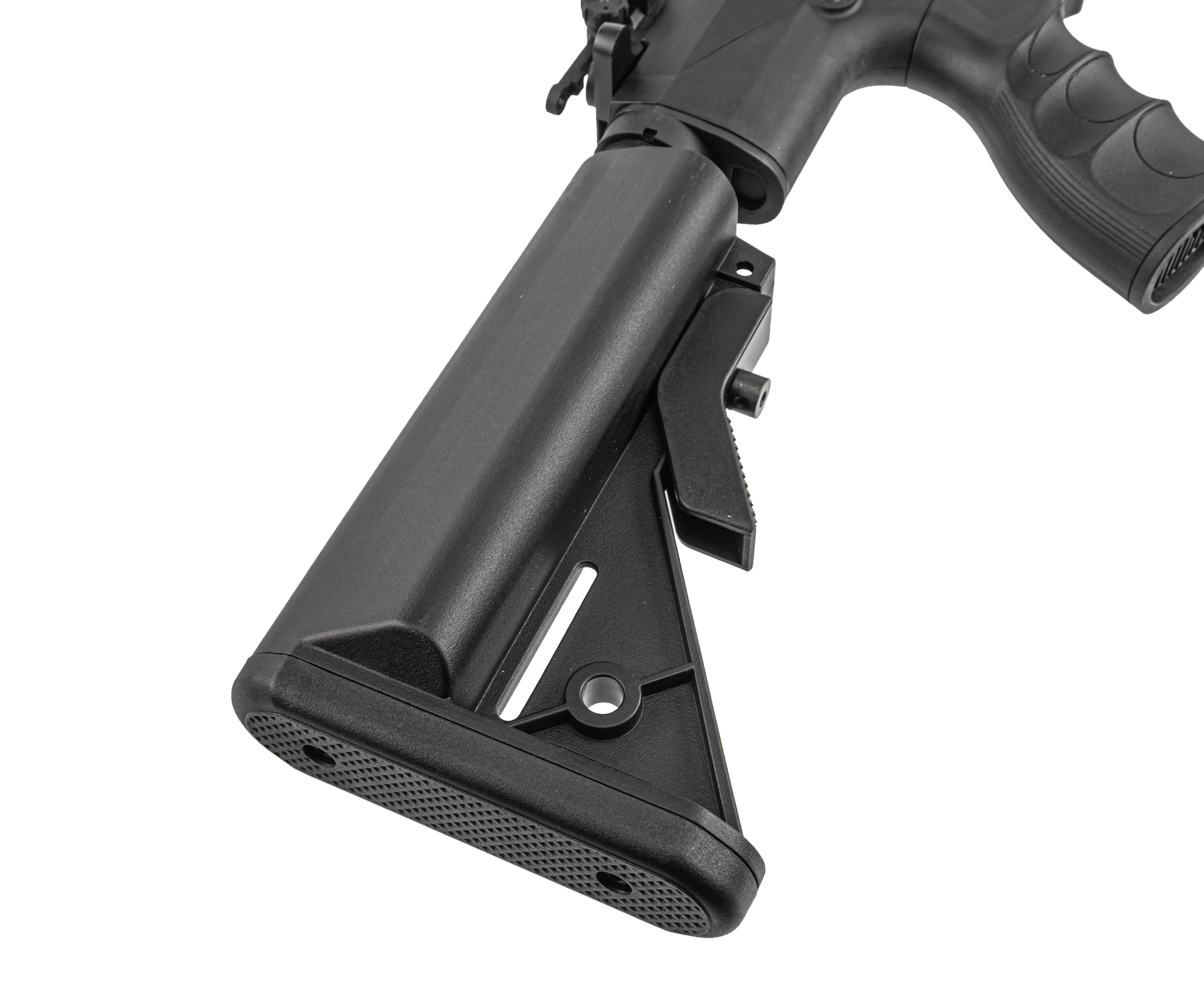 Модульность - достоинство платформ, построенных на базе конструктива западной винтовки Стоунера, что актуально и в этом случае. Цевье вкупе со ствольной коробкой образуют длинную планку Вивер 22 мм для прицелов, вместе с чем сюда внедрили М-ЛОК интерфейс для крепления аксессуаров. Приклад оружия предполагает регулировку по длине, что помогает подогнать габарит пневматику под свой рост или толщину одежды.