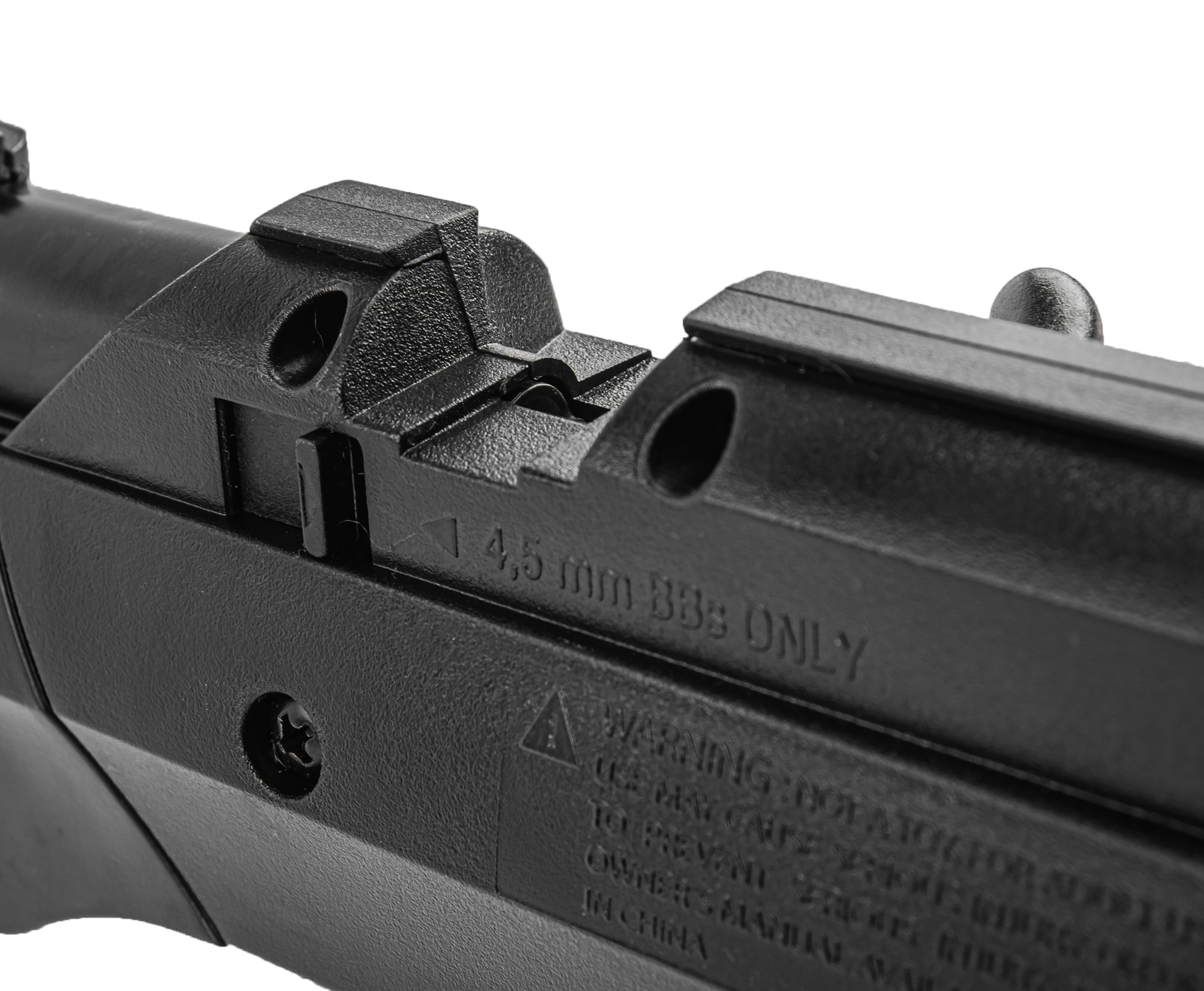 В конструкции сочетаются металлические и полимерные элементы, обеспечивающие баланс прочности и массы - вес модели составляет около 1.4 кг, что сделало удобной для стрелков разного возраста. Изготовитель предлагает 4 схемы окраски. В этом случае фурнитуру оружия оформили классическим черным оттенком.