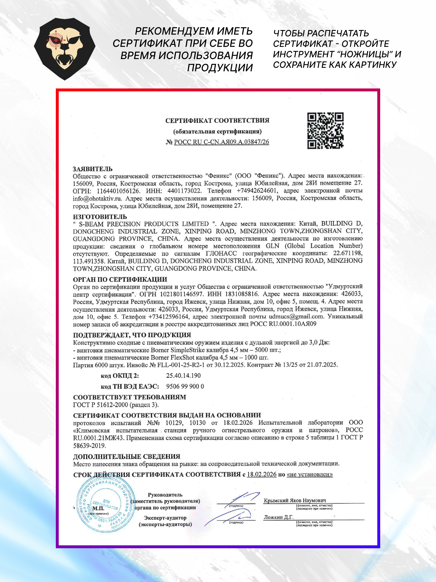 | Комплектация | Винтовка, упаковка, краткая документация, копия сертификата (по запросу покупателя) |